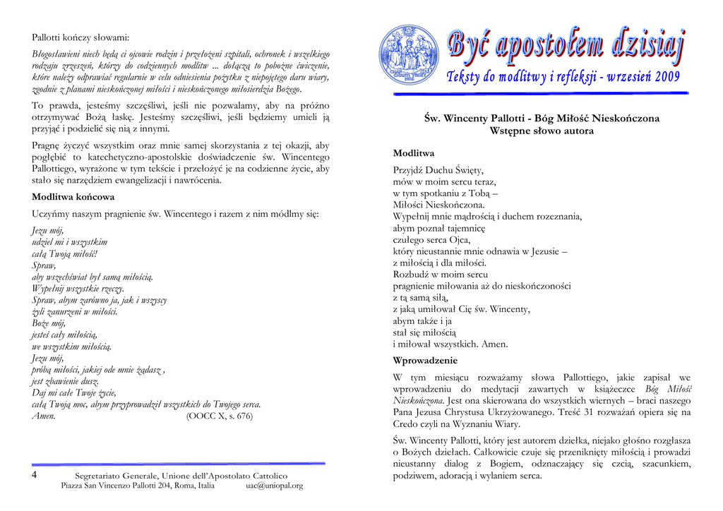 Pallotti kończy słowami: Błogosławieni niech będą ci ojcowie rodzin i przełożeni szpitali, ochronek i wszelkiego rodzaju zrzeszeń, którzy do codziennych modlitw ... dołączą to pobożne ćwiczenie, które należy odprawiać regularnie w celu odniesienia pożytku z niepojętego daru wiary, zgodnie z planami nieskończonej miłości i nieskończonego miłosierdzia Bożego. To prawda, jesteśmy szczęśliwi, jeśli nie pozwalamy, aby na próżno otrzymywać Bożą łaskę. Jesteśmy szczęśliwi, jeśli będziemy umieli ją przyjąć i podzielić się nią z innymi. Pragnę życzyć wszystkim oraz mnie samej skorzystania z tej okazji, aby pogłębić to katechetyczno-apostolskie doświadczenie św. Wincentego Pallottiego, wyrażone w tym tekście i przełożyć je na codzienne życie, aby stało się narzędziem ewangelizacji i nawrócenia. Modlitwa końcowa Uczyńmy naszym pragnienie św. Wincentego i razem z nim módlmy się: Jezu mój, udziel mi i wszystkim całą Twoją miłość! Spraw, aby wszechświat był samą miłością. Wypełnij wszystkie rzeczy. Spraw, abym zarówno ja, jak i wszyscy żyli zanurzeni w miłości. Boże mój, jesteś cały miłością, we wszystkim miłością. Jezu mój, próbą miłości, jakiej ode mnie żądasz , jest zbawienie dusz. Daj mi całe Twoje życie, całą Twoją moc, abym przyprowadził wszystkich do Twojego serca. Amen. (OOCC X, s. 676) 4 Segretariato Generale, Unione dell’Apostolato Cattolico Piazza San Vincenzo Pallotti 204, Roma, Italia [email protected] Św. Wincenty Pallotti - Bóg Miłość Nieskończona Wstępne słowo autora Modlitwa Przyjdź Duchu Święty, mów w moim sercu teraz, w tym spotkaniu z Tobą – Miłości Nieskończona. Wypełnij mnie mądrością i duchem rozeznania, abym poznał tajemnicę czułego serca Ojca, który nieustannie mnie odnawia w Jezusie – z miłością i dla miłości. Rozbudź w moim sercu pragnienie miłowania aż do nieskończoności z tą samą siłą, z jaką umiłował Cię św. Wincenty, abym także i ja stał się miłością i miłował wszystkich. Amen. Wprowadzenie W tym miesiącu rozważamy słowa Pallottiego, jakie zapisał we wprowadzeniu do medytacji zawartych w książeczce Bóg Miłość Nieskończona. Jest ona skierowana do wszystkich wiernych – braci naszego Pana Jezusa Chrystusa Ukrzyżowanego. Treść 31 rozważań opiera się na Credo czyli na Wyznaniu Wiary. Św. Wincenty Pallotti, który jest autorem dziełka, niejako głośno rozgłasza o Bożych dziełach. Całkowicie czuje się przeniknięty miłością i prowadzi nieustanny dialog z Bogiem, odznaczający się czcią, szacunkiem, podziwem, adoracją i wylaniem serca. Każde słowo jest przesiąknięte kontemplacją Boga, który troszczy się o człowieka i który daje życie, ciało, kolor i smak każdej żyjącej istocie. Bóg, który stwarza cuda wszechświata i piękno świata dla człowieka. Medytacje - napisane tą samą metodą – pozwalają odkryć głębię duszy Świętego i poznać moc jego wiary, miłości, jego nieustannej modlitwy a nade wszystko jego ogromnej pokory i nieskończonej ufności w Bogu. Tytuł Bóg Miłość Nieskończona Nie istnieje piękniejszy przymiot, jaki możemy przyznać Bogu, jak przymiot Miłości. Dla św. Wincentego Bóg jest nie tylko miłością, ale także Miłością Nieskończoną. Możemy powiedzieć, że nasz Założyciel z infinityzmu uczynił niejako styl swojego życia. Często rozważa i świadomie stawia pytania: Ach, Boże mój, kimże tedy jestem przed Twoim Obliczem? ... Ty tak za dnia jak w nocy, czy czuwam czy śpię, czy myślę o Tobie czy też nie myślę, mimo niepojętej mej niewdzięczności i nieprzeliczonych grzechów moich ... myślisz o mnie wciąż z milością bez miary ... aby zniweczyć we mnie całą mą niegodność, a przemienić mnie w całą istotę Twoją (OOCC X, s. 472). Na myśl przychodzi nam jeszcze wiele innych wyrażeń zapisanych w „Lumi” (tom X Pism Założyciela, stanowiących jego zapiski duchowe): Chciałbym kochać Boga miłością nieskończoną ... Chciałbym pomnażać dzieła do nieskończoności ... O miłości, miłości, miłości nieskończona ... Miłosierdzie nieskończone … czułość i mądrość nieskończona ... Wstępne słowo Autora, znajdujące się na początku dziełka Bóg Miłość Nieskończona, prowadzi nas do postawy postrzegania życia i każdej rzeczy, jaką Bóg dał do naszej dyspozycji jako bezcennego daru. Czytamy: „Nikt nie zdoła odnieść korzyści z cennego przedmiotu, jeśli nie zna wartości i użyteczności, jaki zeń może wydobyć dla siebie i dla drugich. Dlatego my wszyscy, którzy zostaliśmy wyróżnieni darem wiary spośród milionów ludzi, winniśmy odczuwać potrzebę poznawania lub przynajmniej przypominania sobie w świetle wiary miłości nieskończonej i miłosierdzia nieskończonego, z jakimi nas Bóg stworzył i zachowuje, z jakimi nas odkupił i uświęcił przez łaskę chrztu św. A jeśli przez grzech utraciliśmy łaskę otrzymaną na chrzcie św., to sam Bóg, obrażony przez nas tak często, uświęca nas na nowo przez sakreament pokuty, napełnia swymi darami w sakramencie 2 bierzmowania i uświęca najbardziej przez Najświętszą Eucharystię, ponieważ z nieskończonej miłości chce nas wywyższyć i uszczęśliwić na całą wieczność. Wystarczyłoby rozważyć z uwagą te słowa Pallottiego, aby dostrzec horyzont jego kontemplacji. Św. Wincenty znał bezcenną wartość życia i zbawienia. Kto wie, ileż razy zatrzymywał się, aby kontemplować dzieło stworzenia w połączeniu z darem odkupienia. Ileż razy doświadczył, przebywając wśród ludzi, uświęcającego dzieła Ducha. Często powtarzał i nieustannie powracał, podkreślając i wynajdując wciąż nowe określenia, aby uwypuklić bezcenny dar nieskończonej miłości Boga i Jego nieskończonego miłosierdzia wobec ludzkości. A dla nas, ileż łask przygotowywuje Bóg! Przebywając
