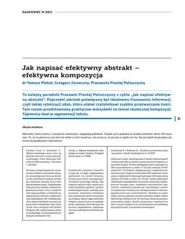 naukowiec w sieci Jak napisać efektywny abstrakt – efektywna kompozycja dr Tomasz Piekot, Grzegorz Zarzeczny; Pracownia Prostej Polszczyzny To kolejny poradnik Pracowni Prostej Polszczyzny z cyklu „Jak napisać efektywny abstrakt”. Poprzedni odcinek poświęcony był idealnemu frazowaniu informacji, czyli takiej rytmizacji zdań, która ułatwi czytelnikowi szybkie przetwarzanie treści. Tym razem przedstawiamy praktyczne wskazówki na temat skutecznej kompozycji. Tajemnica tkwi w segmentacji tekstu. Ukryta struktura Abstrakty, które znamy z czasopism naukowych, wyglądają podobnie. Zwykle są to pojedyncze akapity wielkości około 100 wyrazów. To, że na pierwszy rzut oka nie widać w nich struktury, nie oznacza, że jej tam w ogóle nie ma. Na początek przyjrzyjmy się trzem przypadkowym abstraktom: Kardas-Cinal, E. Urbański, S., Wpływ lokalnego stanu toru na bezpieczeństwo jazdy pojazdu szynowego, Prace Naukowe Politechniki Warszawskiej. Transport z. 87/2012. Szmyt, J., Wpływ środowiska miejskiego na zieleń miejską, Przegląd Komunalny nr 2/1998. W pracy przeprowadzono symulacyjne badania dynamiki pojazdu szynowego po torze prostym w celu określenia związku pomiędzy lokalnym stanem toru a bezpieczeństwem jazdy. Zastosowano statystyczną analizę nierówności geometrycznych toru w pobliżu tych jego punktów, w których występują duże wartości współczynnika wykolejenia Y/Q. Stwierdzono silny wpływ lokalnych oscylacji poprzecznych nierówności toru i przechyłki toru o długości fali bliskiej długości fali wężykowania zestawu kołowego na powstawanie lokalnych ekstremów Y/Q. Środowisko miejskie charakteryzuje się, na ogół, negatywnym wpływem na zieleń miejską. Zanieczyszczenia występujące w mieście są różnego rodzaju. Największy wpływ mają zanieczyszczenia powietrza gazami i pyłami emitowanymi przez zakłady przemysłowe, kotłownie osiedlowe oraz wytwarzane przez komunikację miejską. Oprócz tego roślinność miejska narażona jest na niedobór wody opadowej dochodzącej do korzeni, wyjałowienie, udeptywanie oraz uszkodzenia mechaniczne gleby. Gorbaniuk O. i Radman D., Struktura wizerunku kraju i jej pomiar, Studia Socjologiczne nr 4/2011. Głównym celem dwuetapowych badań jakościowych i ilościowych było ustalenie wymiarów postrzegania wizerunków krajów. W toku jednogodzinnych wywiadów ze 100 respondentami w wieku 17–63 lata zebrano 25.447 skojarzeń z 47 krajami. Kategoryzacja i uogólnienie bliskoznacznych skojarzeń dały listę 258 twierdzeń, które użyto w badaniach ilościowych percepcji 40 krajów (przy udziale 276 osób w wieku 16–70 lat). Analiza głównych składowych wyodrębniła 8 wymiarów wizerunku krajów: poziom rozwoju kraju i dobrobytu mieszkańców; gościnność; stabilność wewnętrzna i demokracja; znaczenie polityczne i historyczne; fundamentalizm islamski; egzotyczność oraz ciemnoskórość. Wymiary te wyjaśniają znaczny odsetek wariancji postawy wobec krajów. Wymiernym efektem jest 38-itemowa skala do pomiaru wizerunków krajów. Wyniki porównano z wynikami badań w innych krajach oraz przedstawiono perspektywy przyszłych analiz na poziomie kulturowym. | 31 naukowiec w sieci Każdy z tych abstraktów ma wewnętrzną organizację treści, którą czytelnik musi samodzielnie zrekonstruować. Układ tych „minirozdziałów” wygląda mniej więcej tak: [przedmiot i cel badań] W pracy przeprowadzono … badania… w celu… [metodyka badań] Zastosowano ….. [wyniki] Stwierdzono… [temat tekstu] Środowisko miejskie charakteryzuje się… [wyniki badań] Największy wpływ mają…. [cel badań] Głównym celem dwuetapowych badań… [metodyka badań] W toku jednogodzinnych wywiadów … [wyniki] Analiza głównych składowych wyodrębniła… Z perspektywy szybkiej lektury – na takiej przecież zależy czytelnikowi internetowych baz abstraktów – tradycyjna kompozycja abstraktu przynosi kilka problemów: 1. Samodzielne odkrywanie struktury przez czytelnika oznacza dodatkowy wysiłek i czas na przeprowadzenie tej interpretacji. Jej efekty mogą się zresztą znacznie różnić u poszczególnych czytelników. Subiektywne i dyskusyjne może być zarówno wydzielanie typów sekcji, a nawet granic pomiędzy nimi. 2. Czytelnicy poszukujący konkretnych informacji (np. metodologii lub wyników) nie znajdą ich od razu – muszą przeczytać cały tekst jak wszyscy inni odbiorcy. 3. Abstrakty podobnych artykułów, a nawet abstrakty z tego samego numeru czasopisma mogą się znacznie różnić pod względem autorskiej, subiektywnej struktury. 32 | Dobrą ilustracją wymienionych problemów jest abstrakt nr 2. Streszczany tekst ma podobny tytuł do tekstu nr 1 (Wpływ X na Y), należałoby się więc spodziewać podobnej struktury samego artykułu i podobnego procesu badawczego. Abstrakt nr 1 omawia jednak wyniki badań empirycznych, abstrakt nr 2… nie daje takiej pewności. Ponieważ nie ma w nim opisu metodologii, a opis przedmiotu badań jest właściwie opisem tematu tekstu, trudno jednoznacznie stwierdzić, czy tekst opisuje badania własne, czy ma charakter przeglądowy. Co ciekawe, abstrakt nr 3 ma strukturę podobną do abstraktu nr 1, choć obie dyscypliny nie mają ze sobą nic wspólnego. Nietrudno się domyślić, że rozwiązaniem powyższych problemów byłoby pisanie abstraktów według wyraźnie zaplanowanej, w miarę stałej struktury. Przyjrzyjmy się przez chwilę temu, z jakich elementów struktura ta powinna się składać. W poszukiwaniu norm i zaleceń Oczywiście, istnieje wiele poradników, zaleceń, a nawet norm tworzenia abstraktów. Większość z nich skupia się także na strukturze, wyróżniając – zależnie od typu samego artykułu – różne rodzaje abstraktów (omawiające badania, przeglądowe itp.). Co według tych zaleceń powinien zawierać dobry abstrakt? Norma ISO 214:19761 wskazuje, że abstrakt powinien zawierać obowiązkowo cztery el