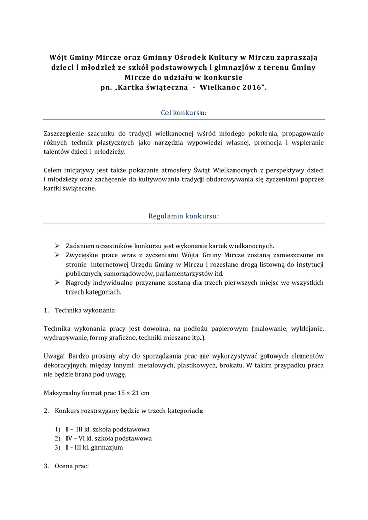 Wójt Gminy Mircze oraz Gminny Ośrodek Kultury w Mirczu zapraszają dzieci i młodzież ze szkół podstawowych i gimnazjów z terenu Gminy Mircze do udziału w konkursie pn. „Kartka świąteczna - Wielkanoc 2016”. Cel konkursu: Zaszczepienie szacunku do tradycji wielkanocnej wśród młodego pokolenia, propagowanie różnych technik plastycznych jako narzędzia wypowiedzi własnej, promocja i wspieranie talentów dzieci i młodzieży. Celem inicjatywy jest także pokazanie atmosfery Świąt Wielkanocnych z perspektywy dzieci i młodzieży oraz zachęcenie do kultywowania tradycji obdarowywania się życzeniami poprzez kartki świąteczne. Regulamin konkursu: Zadaniem uczestników konkursu jest wykonanie kartek wielkanocnych. Zwycięskie prace wraz z życzeniami Wójta Gminy Mircze zostaną zamieszczone na stronie internetowej Urzędu Gminy w Mirczu i rozesłane drogą listowną do instytucji publicznych, samorządowców, parlamentarzystów itd. Nagrody indywidualne przyznane zostaną dla trzech pierwszych miejsc we wszystkich trzech kategoriach. 1. Technika wykonania: Technika wykonania pracy jest dowolna, na podłożu papierowym (malowanie, wyklejanie, wydrapywanie, formy graficzne, techniki mieszane itp.). Uwaga! Bardzo prosimy aby do sporządzania prac nie wykorzystywać gotowych elementów dekoracyjnych, między innymi: metalowych, plastikowych, brokatu. W takim przypadku praca nie będzie brana pod uwagę. Maksymalny format prac 15 × 21 cm 2. Konkurs rozstrzygany będzie w trzech kategoriach: 1) I – III kl. szkoła podstawowa 2) IV – VI kl. szkoła podstawowa 3) I – III kl. gimnazjum 3. Ocena prac: Przy ocenie prac pod uwagę wzięte będą takie elementy jak: walory artystyczne, pomysłowość i estetyka pracy. 4. Nagrody: Za zwycięskie prace przyznane zostaną nagrody indywidualne. Wszyscy przystępujący do konkursu otrzymają dyplomy pamiątkowe. O przyznaniu nagród decyduje komisja konkursowa powołana przez organizatorów. 5. Inne warunki: Każda praca powinna zawierać: dane o autorze pracy: - imię i nazwisko, - adres zamieszkania, - telefon kontaktowy, - nazwę szkoły i numer klasy do której uczęszcza / kategorię, w której bierze udział. Termin składania prac upływa z dniem 22.02.2016 r. Spotkanie z autorami nagrodzonych prac, wręczenie nagród oraz otwarcie wystawy pokonkursowej odbędzie się w Gminnym Ośrodku Kultury w Mirczu, w terminie określonym przez Organizatorów Konkursu. Informacja o terminie spotkania zostanie przekazana po rozstrzygnięciu Konkursu. 6. Organizatorzy zastrzegają sobie możliwość publikacji prac konkursowych za pisemną zgodą autora. 7. Prace złożone na konkurs przechodzą na własność organizatora. 8. Uczestnik jednocześnie ze złożoną pracą składa formularz zgłoszeniowy stanowiący załącznik nr 1 do niniejszego Regulaminu oraz oświadczenia podpisane przez rodzica / opiekuna prawnego, które stanowią stanowi załącznik nr 2 i 3 do niniejszego Regulaminu. 9. Wszelkie informacje związane z organizacją konkursu można uzyskać od poniedziałku do piątku pod numerami telefonów 730 824 010, 84 65 19 004 wewn. 68, 84 65 19 015. 10. Prace na konkurs prosimy składać w Gminnym Ośrodku Kultury w Mirczu ul. Kryłowska 18 osobiście lub przesłać pocztą na adres: Gminny Ośrodek Kultury w Mirczu ul. Kryłowska 18, 22-530 Mircze Uwaga! W przypadku dostarczenia prac za pomocą poczty za datę dostarczenia pracy uważać się będzie datę wpłynięcia do placówki Gminnego Ośrodka Kultury w Mirczu. Serdecznie zapraszamy! Mircze, dnia 2 lutego 2016 roku