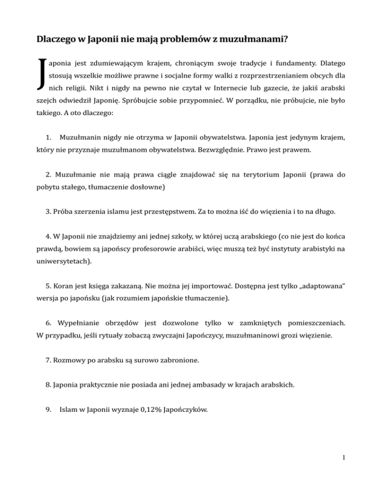 Dlaczego w Japonii nie mają problemów z muzułmanami? J aponia jest zdumiewającym krajem, chroniącym swoje tradycje i fundamenty. Dlatego stosują wszelkie możliwe prawne i socjalne formy walki z rozprzestrzenianiem obcych dla nich religii. Nikt i nigdy na pewno nie czytał w Internecie lub gazecie, że jakiś arabski szejch odwiedził Japonię. Spróbujcie sobie przypomnieć. W porządku, nie próbujcie, nie było takiego. A oto dlaczego: 1. Muzułmanin nigdy nie otrzyma w Japonii obywatelstwa. Japonia jest jedynym krajem, który nie przyznaje muzułmanom obywatelstwa. Bezwzględnie. Prawo jest prawem. 2. Muzułmanie nie mają prawa ciągle znajdować się na terytorium Japonii (prawa do pobytu stałego, tłumaczenie dosłowne) 3. Próba szerzenia islamu jest przestępstwem. Za to można iść do więzienia i to na długo. 4. W Japonii nie znajdziemy ani jednej szkoły, w której uczą arabskiego (co nie jest do końca prawdą, bowiem są japońscy profesorowie arabiści, więc muszą też być instytuty arabistyki na uniwersytetach). 5. Koran jest księga zakazaną. Nie można jej importować. Dostępna jest tylko „adaptowana” wersja po japońsku (jak rozumiem japońskie tłumaczenie). 6. Wypełnianie obrzędów jest dozwolone tylko w zamkniętych pomieszczeniach. W przypadku, jeśli rytuały zobaczą zwyczajni Japończycy, muzułmaninowi grozi więzienie. 7. Rozmowy po arabsku są surowo zabronione. 8. Japonia praktycznie nie posiada ani jednej ambasady w krajach arabskich. 9. Islam w Japonii wyznaje 0,12% Japończyków. 1 10. Muzułmanin przyjechawszy do pracy w Japonii ma prawo pracować TYLKO w firmach zagranicznych, tj. japońskie firmy nie przyjmują do pracy osób wyznających islam. 11. Wizy do Japonii przyznają muzułmanom bardzo rzadko. Nawet znamienici lekarze czy naukowcy wyznający islam nie mogą dostać wizy do Japonii. 12. W umowach pracowniczych często jest zaznaczone, że pracodawca ma prawo bez wyjaśnień zwolnić pracownika, jeśli dowie się o jego muzułmańskiej wierze. 13. Muzułmanom zakazuje się wynajmować domy w Japonii, nie mówiąc już o kupnie na własność. 14. Tłumaczeniem technicznej dokumentacji z japońskiego dla arabskich klientów zajmują się NIEjapońskie firmy. 15. Wobec muzułmanów odnoszą się jak wobec wyrzutków. Jeśli ktoś w okolicy jest muzułmaninem, wobec niego całe otoczenie będzie odnosić się jak wobec przestępcy. 16. O otwarciu muzułmańskich szkół nawet nie może być mowy. 17. Japonia nie akceptuje praw szariatu. 18. Japonka będąca w związku z muzułmaninem, zostaje uznana za winną i staje się wyrzutkiem społeczeństwa. http://polskiportal.net/blogs/2901/845/dlaczego-w-japonii-nie-maja-prob http://3rm.info/32953-islam.html http://www.gazetawarszawska.com/judaizm-islam/2547-dlaczego-w-japonii-nie-majaproblemow-z-muzulmanami 2 Komentarz stowarzyszenia: NIECH POLSKA BĘDZIE DRUGIM KRAJEM, KTÓRY NIE PRZYZNA MUZUŁMANOM OBYWATELSTWA, Z WYJĄTKIEM TATARÓW POLSKICH!!! DOKŁADNIE TO SAMO PRAWO CO W JAPONII NIECH WRESZCIE ZACZNIE OBOWIĄZYWAĆ W POLSCE!!! 3