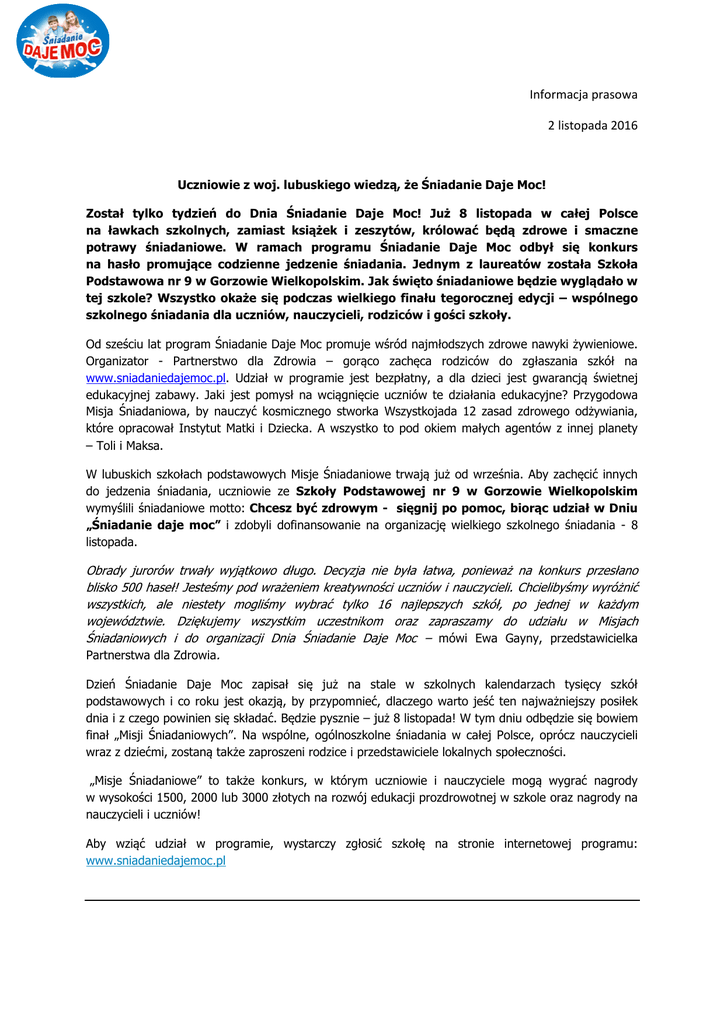 Informacja prasowa 2 listopada 2016 Uczniowie z woj. lubuskiego wiedzą, że Śniadanie Daje Moc! Został tylko tydzień do Dnia Śniadanie Daje Moc! Już 8 listopada w całej Polsce na ławkach szkolnych, zamiast książek i zeszytów, królować będą zdrowe i smaczne potrawy śniadaniowe. W ramach programu Śniadanie Daje Moc odbył się konkurs na hasło promujące codzienne jedzenie śniadania. Jednym z laureatów została Szkoła Podstawowa nr 9 w Gorzowie Wielkopolskim. Jak święto śniadaniowe będzie wyglądało w tej szkole? Wszystko okaże się podczas wielkiego finału tegorocznej edycji – wspólnego szkolnego śniadania dla uczniów, nauczycieli, rodziców i gości szkoły. Od sześciu lat program Śniadanie Daje Moc promuje wśród najmłodszych zdrowe nawyki żywieniowe. Organizator - Partnerstwo dla Zdrowia – gorąco zachęca rodziców do zgłaszania szkół na www.sniadaniedajemoc.pl. Udział w programie jest bezpłatny, a dla dzieci jest gwarancją świetnej edukacyjnej zabawy. Jaki jest pomysł na wciągnięcie uczniów te działania edukacyjne? Przygodowa Misja Śniadaniowa, by nauczyć kosmicznego stworka Wszystkojada 12 zasad zdrowego odżywiania, które opracował Instytut Matki i Dziecka. A wszystko to pod okiem małych agentów z innej planety – Toli i Maksa. W lubuskich szkołach podstawowych Misje Śniadaniowe trwają już od września. Aby zachęcić innych do jedzenia śniadania, uczniowie ze Szkoły Podstawowej nr 9 w Gorzowie Wielkopolskim wymyślili śniadaniowe motto: Chcesz być zdrowym - sięgnij po pomoc, biorąc udział w Dniu „Śniadanie daje moc” i zdobyli dofinansowanie na organizację wielkiego szkolnego śniadania - 8 listopada. Obrady jurorów trwały wyjątkowo długo. Decyzja nie była łatwa, ponieważ na konkurs przesłano blisko 500 haseł! Jesteśmy pod wrażeniem kreatywności uczniów i nauczycieli. Chcielibyśmy wyróżnić wszystkich, ale niestety mogliśmy wybrać tylko 16 najlepszych szkół, po jednej w każdym województwie. Dziękujemy wszystkim uczestnikom oraz zapraszamy do udziału w Misjach Śniadaniowych i do organizacji Dnia Śniadanie Daje Moc – mówi Ewa Gayny, przedstawicielka Partnerstwa dla Zdrowia. Dzień Śniadanie Daje Moc zapisał się już na stale w szkolnych kalendarzach tysięcy szkół podstawowych i co roku jest okazją, by przypomnieć, dlaczego warto jeść ten najważniejszy posiłek dnia i z czego powinien się składać. Będzie pysznie – już 8 listopada! W tym dniu odbędzie się bowiem finał „Misji Śniadaniowych”. Na wspólne, ogólnoszkolne śniadania w całej Polsce, oprócz nauczycieli wraz z dziećmi, zostaną także zaproszeni rodzice i przedstawiciele lokalnych społeczności. „Misje Śniadaniowe” to także konkurs, w którym uczniowie i nauczyciele mogą wygrać nagrody w wysokości 1500, 2000 lub 3000 złotych na rozwój edukacji prozdrowotnej w szkole oraz nagrody na nauczycieli i uczniów! Aby wziąć udział w programie, wystarczy zgłosić szkołę na stronie internetowej programu: www.sniadaniedajemoc.pl Program Śniadanie Daje Moc w skrócie: • Organizator programu: Partnerstwo dla Zdrowia - koalicja firm: Danone, Lubella, Biedronka oraz Instytutu Matki i Dziecka, od 2006 roku przeciwdziała niedożywieniu dzieci w Polsce oraz propaguje wśród najmłodszych zdrowe nawyki żywieniowe. Działania Partnerstwa obejmują dwa filary. Pierwszy to tworzenie produktów z misją społeczną. Drugi zaś to działania edukacyjne – program Śniadanie Daje Moc. • Najważniejsze cele programu: 1. Zwiększanie świadomości nt. zdrowego odżywiania i roli śniadania w diecie dziecka; 2. Przyczynianie się (pośrednio) do obniżania poziomu niedożywienia dzieci w Polsce – poprzez edukację oraz promocję prawidłowego żywienia; 3. Edukację najmłodszych przez zaangażowanie rodziców i nauczycieli w kwestie prawidłowego żywienia dzieci. • Główne działania programu: 1. Kluby Śniadanie Daje Moc – kluby śniadaniowe zakładane w klasach, w ramach których nauczyciele prowadzą lekcje edukacyjne na temat zdrowego odżywiania, ze szczególnym uwzględnieniem roli śniadania w diecie dziecka, na podstawie scenariuszy w oparciu o 12 zasad zdrowego odżywiania opracowanych przez Instytut Matki i Dziecka. 2. 8 listopada - Dzień Śniadanie Daje Moc - najważniejszy dzień w Programie, podczas którego najmłodsi wspierani przez dorosłych przygotowują i jedzą wspólne śniadanie w klasie. W ten sposób nie tylko kadra pedagogiczna, ale także rodzice angażują się w kwestie żywienia dzieci w wieku wczesnoszkolnym. • Patroni honorowi: Minister Edukacji Narodowej, Ośrodek Rozwoju Edukacji, Rzecznik Praw Dziecka • Patroni regionalni programu: Kuratorium Oświaty w Katowicach, Kuratorium Oświaty w Gorzowie Wlkp., Kuratorium Oświaty w Opolu, Kuratorium Oświaty w Bydgoszczy, Kuratorium Oświaty w Kielcach, Kuratorium Oświaty w Rzeszowie, Kuratorium Oświaty w Poznaniu, Kuratorium Oświaty w Gdańsku, Kuratorium Oświaty w Szczecinie, Kuratorium Oświaty w Warszawie, Kuratorium Oświaty w Łodzi, Kuratorium Oświaty we Wrocławiu. • Patroni medialni i opieka medialna: TVP3 Gorzów Wielkopolski, TVP3 Kielce, TVP3 Kraków, TVP3 Łódź, TVP3 Olsztyn, TVP3 Opole, TVP3 Poznań, TVP3 Rzeszów, Polskie Radio Gdańsk, Polskie Radio Koszalin, Polskie Radio Merkury, Polskie Radio PiK, Polskie Radio Zachód Kontakt prasowy: Elżbieta Burza Biuro prasowe programu Śniadanie Daje Moc Garden of Words Tel. (22) 829 85 72, wew. 34 e-mail:[email protected] www.sniadaniedajemoc.pl