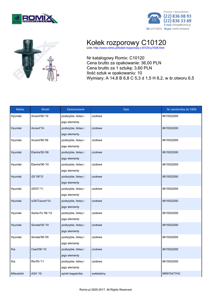 Kołek rozporowy C10120 Link: http://www.romix.pl/kolek-rozporowy-c10120-p1038.html Nr katalogowy Romix: C10120 Cena brutto za opakowanie: 36,00 PLN Cena brutto za 1 sztukę: 3,60 PLN Ilość sztuk w opakowaniu: 10 Wymiary: A 14,8 B 6,8 C 5,3 d 1,5 H 8,2, w śr.otworu 6,5 Marka Hyundai Model Accent'06-'10 Zastosowanie podszybie, listwy i Opis Nr zamiennika do OEM czołowe 8615522000 czołowe 8615522000 czołowe 8615522000 czołowe 8615522000 czołowe 8615522000 czołowe 8615522000 czołowe 8615522000 czołowe 8615522000 czołowe 8615522000 czołowe 8615522000 czołowe 8615522000 czołowe 8615522000 czołowe 8615522000 wykładziny MR975477HC jego elementy Hyundai Accent'10- podszybie, listwy i jego elementy Hyundai Accent'99-'06 podszybie, listwy i jego elementy Hyundai Elantra'00-'06 podszybie, listwy i jego elementy Hyundai Elantra'06-'10 podszybie, listwy i jego elementy Hyundai i20 '08'12 podszybie, listwy i jego elementy Hyundai i30'07-'11 podszybie, listwy i jego elementy Hyundai ix35/Tuscon'10- podszybie, listwy i jego elementy Hyundai Santa Fe '06-'12 podszybie, listwy i jego elementy Hyundai Sonata'05-'10 podszybie, listwy i jego elementy Hyundai Sonata'98-'05 podszybie, listwy i jego elementy Kia Ceed'06-'12 podszybie, listwy i jego elementy Kia Rio'05-'11 podszybie, listwy i jego elementy Mitsubishi ASX '10- spinki bagażnika Romix.pl 2005-2017. All Rights Reserved. Mitsubishi Galant '06- mocowania zderzaków nakładka MR975477HC Mitsubishi Lancer ''03-'08 spinki bagażnika wykładziny MR975477HC Mitsubishi Outlander '01-'06 spinki bagażnika wykładziny MR975477HC Subaru Impreza '92-'02 spinki nadkoli (+inne spinki), podsufitka 58330KA010 Suzuki Baleno'95-'03 spinki nadkoli osłona pod silnikiem 09409073085PK Suzuki Grand Vitara '05- podszybie, listwy i czołowe + inne spinki 09409073085PK podszybie, listwy i czołowe + inne spinki, nakładki progowe wewnętrz 09409073085PK jego elementy ne, Grand Vitara XL7 '07 podszybie, listwy i czołowe + inne spinki - jego elementy Ignis'00-'06 mocowania słupków we boczki i wykładziny tapicerskie bagażnika jego elementy Suzuki Suzuki Suzuki Grand Vitara '97-'05 09409073085PK 0940907308P4Z wnętrznych Suzuki Jimny'98- podszybie, listwy i czołowe + inne spinki, boczki i wykładziny tapic jego elementy erskie bagażnika, słupki i nakładki prog. wew., 09409073085PK tapicerka drzwi i bagażnika Suzuki Suzuki Swift '04-'10 Swift '96-'04 podszybie, listwy i czołowe + inne spinki, poszerzenia błotników + i jego elementy nne spinki spinki nadkoli osłona pod silnikiem, podszybie szyby czołowej ( 09409073085PK 0940907308P4Z +inne spinki), boczki i wykładziny tapicerskie b agażnika Suzuki Vitara '88-'99 podszybie, listwy i czołowe + inne spinki 0940907308P4Z podszybie, listwy i czołowe + inne spinki, poszerzenia błotników + i 0940907308P4Z jego elementy nne spinki podszybie, listwy i czołowe + inne spinki jego elementy Suzuki Suzuki Vitara'98-'05 Wagon R+ jego elementy Romix.pl 2005-2017. All Rights Reserved. 0940907308P4Z