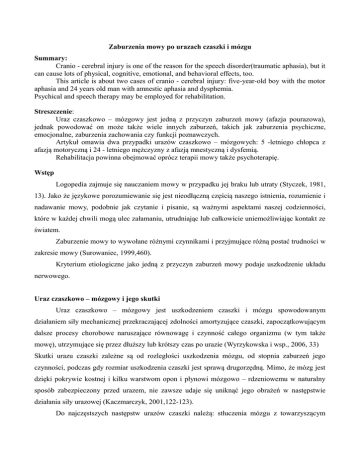 Zaburzenia mowy po urazach czaszki i mózgu Summary: Cranio - cerebral injury is one of the reason for the speech disorder(traumatic aphasia), but it can cause lots of physical, cognitive, emotional, and behavioral effects, too. This article is about two cases of cranio - cerebral injury: five-year-old boy with the motor aphasia and 24 years old man with amnestic aphasia and dysphemia. Psychical and speech therapy may be employed for rehabilitation. Streszczenie: Uraz czaszkowo – mózgowy jest jedną z przyczyn zaburzeń mowy (afazja pourazowa), jednak powodować on może także wiele innych zaburzeń, takich jak zaburzenia psychiczne, emocjonalne, zaburzenia zachowania czy funkcji poznawczych. Artykuł omawia dwa przypadki urazów czaszkowo – mózgowych: 5 -letniego chłopca z afazją motoryczną i 24 - letniego mężczyzny z afazją mnestyczną i dysfemią. Rehabilitacja powinna obejmować oprócz terapii mowy także psychoterapię. Wstęp Logopedia zajmuje się nauczaniem mowy w przypadku jej braku lub utraty (Styczek, 1981, 13). Jako że językowe porozumiewanie się jest nieodłączną częścią naszego istnienia, rozumienie i nadawanie mowy, podobnie jak czytanie i pisanie, są ważnymi aspektami naszej codzienności, które w każdej chwili mogą ulec załamaniu, utrudniając lub całkowicie uniemożliwiając kontakt ze światem. Zaburzenie mowy to wywołane różnymi czynnikami i przyjmujące różną postać trudności w zakresie mowy (Surowaniec, 1999,460). Kryterium etiologiczne jako jedną z przyczyn zaburzeń mowy podaje uszkodzenie układu nerwowego. Uraz czaszkowo – mózgowy i jego skutki Uraz czaszkowo – mózgowy jest uszkodzeniem czaszki i mózgu spowodowanym działaniem siły mechanicznej przekraczającej zdolności amortyzujące czaszki, zapoczątkowującym dalsze procesy chorobowe naruszające równowagę i czynność całego organizmu (w tym także mowę), utrzymujące się przez dłuższy lub krótszy czas po urazie (Wyrzykowska i wsp., 2006, 33) Skutki urazu czaszki zależne są od rozległości uszkodzenia mózgu, od stopnia zaburzeń jego czynności, podczas gdy rozmiar uszkodzenia czaszki jest sprawą drugorzędną. Mimo, że mózg jest dzięki pokrywie kostnej i kilku warstwom opon i płynowi mózgowo – rdzeniowemu w naturalny sposób zabezpieczony przed urazem, nie zawsze udaje się uniknąć jego obrażeń w następstwie działania siły urazowej (Kaczmarczyk, 2001,122-123). Do najczęstszych następstw urazów czaszki należą: stłuczenia mózgu z towarzyszącym obrzękiem, powodujące ogniskowe objawy zaburzeń czynności mózgu, oraz wstrząśnienia mózgu jako następstwo stłuczenia, czy też krwawienia śródczaszkowe (Kalińska – Lipert i wsp., 2005, 37) . Urazom tym towarzyszyć mogą bóle i zawroty głowy, nudności, wymioty, krótka utrata przytomności, zaburzenia pamięci, drgawki czy zaburzenia świadomości. Ocena intensywności i czasu trwania zaburzeń świadomości pozwala chirurgom na ustalenie stopnia ciężkości urazu – od lekkiego, gdzie zaburzenia świadomości trwają zaledwie kilka minut po bardzo ciężkie, w których zaburzenia świadomości utrzymywać się mogą nawet do kilku tygodni po urazie. Uraz głowy początkowo może przebiegać bezobjawowo, a jego następstwa uwidocznić się mogą dopiero po kilku dniach lub godzinach (Popielarska, Mazurowa, 1982, 20). Konsekwencjami urazów czaszkowo - mózgowych, w zależności od stopnia ciężkości, miejsca i rodzaju mogą być zarówno zaburzenia psychiczne, a wśród nich zaburzenia świadomości zarówno jakościowe (psychotyczne) jak i ilościowe (niepsychotyczne), a także wykrywalne badaniem neurologicznym objawy ogniskowe (Carson i wsp., 2005, 738-740). Jak podają Popielarska i Mazurowa (Popielarska, Mazurowa,1982, 30-32) omawiając ogniskowe objawy neurologiczne, 35 – 40% wśród odległych skutków urazu zajmuje zespół rzekomonerwicowy (cerebrastenia pourazowa), 8% zespół psychoorganiczny (encefalopatia pourazowa) w swej postaci otępiennej lub charakteropatycznej, kolejne 8 – 10 % to padaczka pourazowa. Pierwsze dwa ogniskowe objawy neurologiczne charakteryzują się m.in. w przypadku cerebrastenii pourazowej głównie zaburzeniami pamięci, rozproszeniem uwagi, apatią, znużeniem i nasilającymi się objawami wegetatywnymi, w przypadku encefalopatii pourazowej w postaci otępiennej obniżeniem sprawności intelektualnej, upośledzeniem logicznego myślenia, zaburzeniami pamięci czy brakiem krytycyzmu, podczas gdy postać charakteropatyczna to głównie zaburzenia w zakresie popędów i emocji przy nieznacznym obniżeniu sprawności umysłowej. Wszystkie te objawy, zwłaszcza gdy są mocno nasilone, powodują zaburzenia w komunikacji pacjenta z otoczeniem. Afazja pourazowa jako skutek urazu czaszkowo – mózgowego. Gdy praca mózgu, jego sprawność pod względem wyższych funkcji korowych i podkorowych ulega zakłóceniu z powodu ujemnego oddziaływania zewnętrznych sił fizycznych, mamy do czynienia z afazją pourazową. Skutkiem urazu czaszkowo – mózgowego wywołującego afazję pourazową mogą być krwiaki śródczaszkowe, jednak oprócz ogniskowych uszkodzeń spotykane są również bądź wyłącznie tzw. mikrourazy (mikrowylewy i wylewy aksonalne) czy zaniki korowe i podkorowe ujawniające się wraz z upływem czasu. Powoduje to narastanie zaburzeń mowy, nierzadko pomimo prowadzonej terapii logopedycznej (Pąchalska, 2005,781). Zaburzenia komunikacji językowej u pacjentów po urazach czaszki i mózgu są trudne do zdiagnozowania, gdyż przypominają z jednej strony klasyczne objawy afatyczne, z drugiej natomiast właściwe są objawom charakterystycznym dla pacjentów z otępieniem. W momencie urazu mózgu uszkodzeniu ulegają określone obszary mózgu, podczas gdy pozostała jego część pozostaje nienaruszona. Częściej jednak (najczęściej przy urazach zamkniętych) dzieje się tak, że podczas urazu obrażania powstają zar