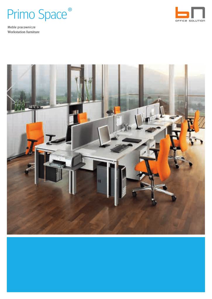 Primo Space ® Meble pracownicze Workstation furniture Sukces współczesnej firmy opiera się na doskonałym współgraniu najdrobniejszych aspektów jej funkcjonowania. Dobrze zaprojektowane biuro stanowi element kluczowy. Idealne wykorzystanie i uporządkowanie przestrzeni pomaga stworzyć miejsce inspirujące do efektywnego działania. Primo Space pozwala na kompletną i spójną aranżację nie tylko gabinetów menedżerskich, ale także wymagających stanowisk pracowniczych. To system elegancki i młody duchem, komfortowy i nowoczesny. Zachwycająca elastyczność oraz wielość funkcjonalnych rozwiązań sprawiają, że wszystkie meble z łatwością dostosowują się do indywidualnych potrzeb związanych z charakterem pracy, profilem firmy czy jej identyfikacją wizualną. Wysublimowany design Primo Space to dzieło znanego włoskiego studia projektowego Castiglia Associati. Eleganckie wzornictwo, materiały najwyższej jakości oraz nieograniczone możliwości aranżacji pozwalają zapomnieć o kompromisach przy wyposażaniu biura. The success of every modern company is based on the excellent integration of the finest aspects of its functional features. A well designed office is certainly a key element here – an ideal use of space and essential order help to create a place, which inspires into effective actions. Primo Space provides for the comprehensive and coherent arrangement of managers’ offices and demanding workstations alike. The system is elegant and youthful in spirit; comfortable and contemporary in outlook. A delightful combination of flexibility and variety of functional features makes the furniture easily adaptable to individual requirements, depending on the nature of your work, your company profile or its visual identity. Primo Space’s sublime design has been created by the well-known Italian design studio Castiglia Associati. The highest quality material, sophisticated pattern design and unlimited possibilities of arrangement mean that you don’t have to compromise when you start thinking about furnishing your office. 3 10 18 4 16 8 6 12 14 5 Zapanuj nad przestrzenią Control your space Ustawienie wielu stanowisk pracowniczych na niewielkiej powierzchni nie musi odbywać się kosztem wygody. Wyprofilowane biurka o ergonomicznej linii zdecydowanie ułatwiają zajęcie optymalnej pozycji. Szersza strona blatu biurka to idealne miejsce na umieszczenie monitora. Przestrzeń roboczą można znacznie powiększyć dzięki dostawianym kontenerom stacjonarnym. Panele montowane do biurek wyciszają miejsce pracy i wspomagają działanie w mniejszych zespołach. Komfort i przestrzeń zwiększają również takie detale jak zawieszane na panelach półki przeznaczone na wszelkie przybory. Comfort doesn’t have to be compromised in the configuration of many workstations in a small space. Our profiled desks with their fine, ergonomic shape will certainly help you find the right position. Deep shaped work surfaces offer ideal space for your computer screen, while the work surface area can be increased by additional, complementary units. The noise-absorbent screen panels, fitted onto the desks, help to reduce work-related noise while dividing space for work in small teams. The system is also accessorized with shelves which can be attached to the panels, providing for additional work space. 6 Szafa ubraniowa Praktyczna szafa do prze chowywania garderoby, niezbędna w każdym biurze. Posiada standar dową dla wszystkich szaf w systemie głębokość, dzięki czemu z łatwością można ją wkomponować w przestrzeń biurową. Wymiary: szer. 80 cm, głęb. 44,5 cm, wys. 5 OH (189,5 cm) lub 6 OH (228,5 cm). Wardrobe A must in every office. Due to its standard depth, it adds flexibility and versatility into any office environment. Size: width 80 cm, depth 44.5 cm, 5 OH (189.5 cm) or 6 OH (228.5 cm). Półka wisząca Półka zawieszana na panel montowany do biurka, przydatna na podręczne przybory biurowe. Półka powiększa przestrzeń roboczą biurka. Wykonana z płyty fornirowanej lub dwustronnie laminowanej, mocowania w kolorze alumi nium. Wymiary: szer. 60 cm, głęb. 22 cm, wys.18,6 cm. Produkt z systemu Easy Space. Hanging shelf The shelf to be hung over the panel fitted onto the desk. Suitable for office accessories, the shelf adds to the size of the desktop, increasing the working space. Made of veneered or double side laminated board, fixtures in alu colour. Size: width 60 cm, depth 22 cm, height 18.6 cm. Product from Easy Space system. 7 Przestrzeń pełna pomysłów Creative Space Wykorzystanie biurek w kształcie trapezu daje ciekawe i efektywne rozwiązania przestrzenne. To doskonały pomysł dla firm wymagających od pracowników błyskotliwości i kreatywności. Kształt blatu oraz zastosowanie kwadratowych stolików pozwala bez ograniczeń integrować stanowiska i według potrzeb powiększać przestrzeń pracowniczą. Nie brak tu również dobrych sposobów na przechowywanie dokumentów: ustawne i eleganckie regały sprawiają, że wszystkie segregatory są zawsze pod ręką. The use of trapezoid desks produces an interesting and effective use of space. It’s an excellent solution for companies which demand nothing short of brilliance and high creativity. The work surfaces, adaptable shape and use of square tables allow for the creation of integrated workstations and expanded work areas. The desks are complemented by elegant, functional shelf units so your files will always be easily accessible. 8 Pionowy kanał kablowy Łatwy w montażu, elastyczny kanał kablowy umożliwiający estetyczne prowa dzenie kabli. Wykonany z wysokiej jakości polipropylenu w kolorze aluminium. Vertical cable conduit Easy to assemble, flexible cable conduit to provide for aesthetically pleasing overall look of the office. Made of high quality polypropylene in alu colour. Stolik kwadratowy Samodzielny element wyposażenia wnętrza biurowego. Przydatny również podczas krótkich sp