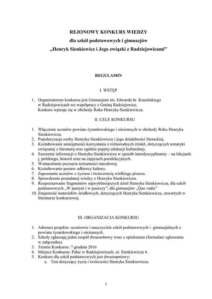 REJONOWY KONKURS WIEDZY dla szkół podstawowych i gimnazjów „Henryk Sienkiewicz i Jego związki z Radziejowicami” REGULAMIN I. WSTĘP 1. Organizatorem konkursu jest Gimnazjum im. Edwarda hr. Krasińskiego w Radziejowicach we współpracy z Gminą Radziejowice. Konkurs wpisuje się w obchody Roku Henryka Sienkiewicza. II. CELE KONKURSU 1. Włączenie uczniów powiatu żyrardowskiego i ościennych w obchody Roku Henryka Sienkiewicza. 2. Popularyzacja osoby Henryka Sienkiewicza i jego działalności literackiej. 3. Kształtowanie umiejętności korzystania z różnorodnych źródeł, dotyczących tematyki związanej z literaturą oraz ogólnie pojętej edukacji kulturalnej. 4. Szerzenie informacji o Henryku Sienkiewiczu w sposób interdyscyplinarny – na lekcjach: j, polskiego, historii oraz na zajęciach pozalekcyjnych. 5. Wzmacnianie poczucia tożsamości narodowej. 6. Kształtowanie postaw odbiorcy kultury. 7. Zapoznanie uczniów z życiem i twórczością wielkiego pisarza. 8. Sprawdzenie posiadanej wiedzy o Henryku Sienkiewiczu. 9. Rozpoznawanie fragmentów najwybitniejszych dzieł Henryka Sienkiewicza, dla szkół podstawowych „W pustyni i w puszczy”; dla gimnazjów „Quo vadis” 10. Znajomość materiałów źródłowych, dotyczących Henryka Sienkiewicza, zawartych w literaturze konkursowej. III. ORGANIZACJA KONKURSU 1. Adresaci projektu: uczniowie i nauczyciele szkół podstawowych i gimnazjalnych z powiatu żyrardowskiego i ościennych. 2. Szkoły zgłaszają jeden zespół dwuosobowy wraz z opiekunem (formularz zgłoszenia w załączniku). 3. Termin Konkursu: 7 grudnia 2016 4. Miejsce Konkursu: Pałac w Radziejowicach, ul. Sienkiewicza 4. 5. Konkurs dla szkół podstawowych jest dwustopniowy: a. Test dotyczący życia i twórczości Henryka Sienkiewicza. 1 b. Rozpoznawanie wybranych fragmentów z „W pustyni i w puszczy” Henryka Sienkiewicza c. W przypadku braku możliwości jednoznacznego rozstrzygnięcia Konkursu organizatorzy przewidują zestaw dodatkowy z zakresu życia i twórczości Henryka Sienkiewicza. 6. Konkurs dla gimnazjalistów jest trzystopniowy: a. Quiz sprawdzający znajomość biografii i dorobku literackiego Henryka Sienkiewicza. b. Rozpoznawanie wybranych fragmentów „Quo vadis” Henryka Sienkiewicza c. Znajomość życia i związków Henryka Sienkiewicza z Pałacem w Radziejowicach. 7. Każdy etap oceniany jest bezpośrednio po jego zakończeniu przez jury składające się z przedstawiciela gminy Radziejowice, pani Moniki Rosca, dyrektora Gimnazjum im. E. hr. Krasińskiego oraz wybranych losowo przedstawicieli zgłoszonych szkół. 8. Termin zgłaszania uczestników wraz z opiekunami upływa z dniem 30 listopada 2016r. Formularz zgłoszeniowy stanowi załącznik do regulaminu. Zgłoszenia można złożyć osobiście, drogą mailową ([email protected]) lub listową (Gimnazjum im. E. hr. Krasińskiego ul. Kubickiego 3a 96-325 Radziejowice). Regulamin dostępny na stronie internetowej szkoły: www.gimnazjum.radziejowice.pl. 9. Zgłoszenia uczniów do udziału w Konkursie jest jednoznaczne z zaakceptowaniem regulaminu. 10. Decyzje jury są ostateczne i nie podlegają weryfikacji. IV. NAGRODY 1. Laureaci I, II, III miejsca otrzymają nagrody rzeczowe, ufundowane przez sponsorów, w postaci wydawnictw książkowych i multimedialnych oraz akcesoria i gadżety komputerowe. 2. Wszyscy uczestnicy Konkursu otrzymają dyplomy i nagrody książkowe. 3. Nauczyciele opiekujący się drużynami otrzymają zaświadczenia przydatne do awansu zawodowego. V. BIBLIOGRAFIA http://www.sienkiewicz.ovh.org/ http://encyklopedia.pwn.pl/haslo/Sienkiewicz-Henryk;3975002.html Strona internetowa: www.palacradziejowice.pl E. Krasiński „O Radziejowicach i ich gościach niektórych” „O Edwardzie hr. Krasińskim i Jego dziełach niektórych” [red.:] Wiesława MielniczukKrupa 6. Warneńska Monika - "Śladami Sienkiewicza" 7. Kulczycka-Saloni Janina - "Henryk Sienkiewicz" 8. Krzyżanowski Julian - "Twórczość Henryka Sienkiewicza" 9. Henryk Sienkiewicz „W pustyni i w puszczy” 10. Henryk Sienkiewicz „Quo vadis” 1. 2. 3. 4. 5. Dyrektor Gimnazjum Krystyna Szymańska 2