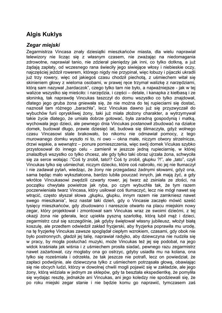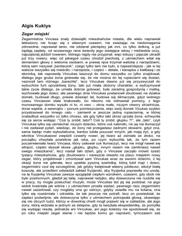 Algis Kuklys Zegar miejski Zegarmistrza Vincasa znały dziesiątki mieszkańców miasta, dla wielu naprawiał telewizory nie licząc się z własnym czasem, nie zważając na niedomagania zdrowotne, naprawiał tanio, nie zdzierał pieniędzy jak inni, co tylko dotkną, a już żądają zapłaty, od wczesnego rana świeciły jego siwiejące włosy i niebieskie oczy, najczęściej jeździł rowerem, którego nigdy nie przypinał, więc łobuzy i pijaczki ukradli już trzy rowery, więc od jakiegoś czasu chodził piechotą, z uśmiechem witał się skinieniem głowy z wieloma osobami, w prawej ręce trzymał walizkę z narzędziami, którą sam nazywał „bardaczok”, czego tylko tam nie było, a najważniejsze - jak w tej walizce wszystko się mieściło: i narzędzia, i części – detale, i kanapka z kiełbasą i ze słoninką, tak naprawdę Vincukas taszczył do domu wszystko co tylko znajdował, dlatego jego gruba żona gniewała się, że nie można do tej rupieciarni się dostać, naznosił tam różnego „barachła”, lecz Vincukas dawno już się przyzwyczaił do wybuchów furii opryskliwej żony, taki już miała złożony charakter, a wytrzymywał takie życie dlatego, że umiała dobrze gotować, była zaradną gospodynią i matką, wychowała jego dzieci, ale pewnego dnia Vincukas postanowił zbudować na działce domek, budował długo, prawie dziesięć lat, budowa się ślimaczyła, gdyż wolnego czasu Vincasowi stale brakowało, bo nikomu nie odmawiał pomocy, z tego murowanego domku wyszło ni to, ni owo – okna małe, niczym otwory strzelnicze, drzwi wąskie, a wewnątrz – ponure pomieszczenia, więc swój domek Vicukas szybko przystosował do innego celu - zamienił w jeszcze jedną rupieciarnię, w której znalazłbyś wszystko co tylko chcesz, ale gdy tylko taki obraz ujrzała żona, schwyciła się za serce wołając :”Coś ty zrobił, tato!? Coś ty zrobił, głupku ?!”, ale „tato”, czyli Vincukas tylko się uśmiechał, niczym dziecko, które coś nabroiło, nic jej nie tłumaczył i nie zadawał pytań, wiedząc, że żony nie przegadasz żadnymi słowami, gdyż ona, sama będąc mało wykształcona, bardzo lubiła pouczać innych, jak mają żyć, a gdy wkrótce Vincukasowi zwędzili czwarty rower, jej twarz aż zsiniała ze złości, na początku chwytała powietrze jak ryba, po czym wybuchła tak, że tym razem poczerwieniała twarz Vincasa, który usiłował coś tłumaczyć, lecz nie mógł nawet się wtrącić, często słyszał słowa „głupku, głupku, innym razem nie zamkniesz nawet swego mieszkania”, lecz nastał taki dzień, gdy o Vincasie zaczęło mówić sześć tysięcy mieszkańców, gdy zbudowano i nareszcie otwarto na placu miejskim nowy zegar, który projektował i zmontował sam Vincukas wraz ze swoimi dziećmi, z tej okazji żona nie gderała, lecz upiekła pyszną szarlotkę, którą lubił mąż i dzieci, zegarmistrz czuł się szczególnie, jak gdyby świętował własny jubileusz, włożył białą koszulę, ale przedtem odwiedził zakład fryzjerski, aby fryzjerka poprawiła mu urodę, na tę fryzjerkę Vincukas zawsze spoglądał ciepłym wzrokiem, czasami, gdy obok nie było postronnych, gładził jej talię, naprawiał radyjko, aby dziewczyna nie nudziła się w pracy, by mogła posłuchać muzyki, może Vincukas też jej się podobał, na jego widok kraśniała jak wiśnia i z uśmiechem prosiła siadać, pewnego razu zegarmistrz nawet zażartował, czy mogłaby ona go ostrzyc, gdyby usiadła mu na kolana, ona tylko się roześmiała i odrzekła, że tak jeszcze nie potrafi, lecz on powiedział, że zapłaci podwójnie, ale dziewczyna tylko z uśmiechem potrząsała głową, obawiając się nie obcych ludzi, którzy w dowolnej chwili mogli pojawić się w zakładzie, ale jego żony, którą widziała w jednym ze sklepów, gdy ta beształa ekspedientkę, że pomyliła się wydając resztę, jednakże ani Vincukas, ani jego koledzy nie spodziewali się, że po roku miejski zegar stanie i nie będzie komu go naprawić, tymczasem zaś zegarmistrz będzie leżał w szpitalu na wpół żywy, bo jego organizm się nadwerężył, Vincukasowa miałą obawy, czy uda się go uratować, zaś „tata” już rozmawiał z aniołami, ale stał się cud, może poskutkowały leki, a może intensywna terapia, lecz Vincukas stanął na nogi, tylko że chodził o kulach, nie władał jedną nogą i ręką, z tej racji otrzymał rentę inwalidzką, wkrótce w mieście zlikwidowano punkt obsługi mieszkańców, w którym Vincukas pracował jako zegarmistrz, zmienił się również jego wygląd – wszystkie włosy zbielały, twarz posmutniała, sąsiedzi mówili, że winę za stan jego zdrowia ponosi żona, która codziennie zadręczała go o byle błahostkę, ale dla niej nastały czarne dni, przybyło kłopotów, a tu jeszcze szef zaczął grozić zwolnieniem, gdyż ta często zrywała się z pracy, a jak nie polecisz do domu, gdy pozostawiony tam mąż może nie wiadomo co wymyślić, pewnego razu po powrocie do domu usłyszała wołanie i walenie w drzwi, okazało się, że „tata” zatrzasnął się w łazience i nie potrafił otworzyć zamka, który sam zmajstrował z nudów, więc zaczęła wołać: „Przez ciebie postradam rozum!”, nagle jakby ktoś szepnął Vincasowi do ucha: „Najpierw trzeba ten rozum mieć”, - powiedział to głośno, a żona osłupiała i poprosiła, aby powtórzył swoje słowa, lecz Vincukas w porę ugryzł się w język i siedząc w łazience rozpłakał się z bezsilności wobec niepowodzeń, niczym duże dziecko, po czym otworzył drzwi, dobrze, że jego dzieci już miały paszporty, jeden zamierzał zostać informatykiem, drugi – specjalistą rolnictwa, tylko wątpliwe, że będzie pracował na roli, gdyż i Vincukas, wprawdzie urodzony na wsi, odwiedzał matkę tylko na święta i podczas urlopu, ale tego lata pojechał do niej, zgarbionej ze starości, gdy matka nareszcie ujrzała osiwia