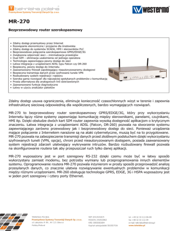 MR-270 Bezprzewodowy router szerokopasmowy • • • • • • • • • • • • • • • • Zdalny dostęp przemysłowy przez Internet Rozwiązanie ekonomiczne i przyjazne dla środowiska Zdalny dostęp do systemów SCADA, HMI i sterowników PLC Bezprzewodowe połączenia szerokopasmowe GPRS/EDGE/3G Zwiększona odporność sieci – minimalizacja przestojów Dual SIM – eliminacja uzależnienia od jednego operatora Technologia zapewniająca pewny dostęp do sieci Łatwa integracja z urządzeniami ADSL typu Falcon czy DR-260 Bezpieczny, pewny dostęp do Internetu Zaawansowany firewall zapobiegający nieautoryzowanemu dostępowi Bezpieczna transmisja danych przez szyfrowane tunele VPN Rozbudowany system rejestracji i nadzoru Szeroka gama rozwiązań dla najczęściej spotykanych problemów z komunikacją Prosta alternatywa dla analogowych linii dzierżawionych Zaawansowane funkcje diagnostyczne Łatwy w użyciu analizator pakietów Zdalny dostęp usuwa ograniczenia, eliminuje konieczność czasochłonnych wizyt w terenie i zapewnia infrastrukturę sieciową odpowiednią dla współczesnych, bardzo wymagających rozwiązań. MR-270 to bezprzewodowy router szerokopasmowy GPRS/EDGE/3G, który przy wykorzystaniu Internetu łączy różne systemy zapewniając komunikację między sterownikami, panelami, czujnikami, HMI itp. Dzięki obsłudze dwóch kart SIM router zapewnia wysoką dostępność aplikacjom o krytycznym znaczeniu. Łatwa integracja z urządzeniami ADSL (Falcon, DR-260) pozwala na stworzenie systemu zapewniającego zarówno przewodowy jak i bezprzewodowy dostęp do sieci. Ponieważ urządzenia mające połączenie z Internetem narażone są na ataki cybernetyczne, muszą być na to przygotowane. MR-270 pozwala na zabezpieczenie transmisji danych przed złośliwym podsłuchem dzięki wykorzystaniu szyfrowanych tuneli (VPN, opcja), chroni przed nieautoryzowanym dostępem, posiada zaawansowany system rejestracji zdarzeń ułatwiający wykrywanie intruzów. Bardzo rozbudowany firewall pozwala na skonfigurowanie routera tak aby przepuszczał ruch tylko danej aplikacji. MR-270 wyposażony jest w port szeregowy RS-232 dzięki czemu może być w łatwy sposób wykorzystany zamiast modemu, bez potrzeby wymiany lub przeprogramowania innych elementów systemu. Oprogramowanie routera MR-270 pozwala inżynierom w prosty sposób przeprowadzić analizę przesyłanych danych, co znacznie ułatwia rozwiązywanie ewentualnych problemów w komunikacji między różnymi urządzeniami. MR-260 obsługuje technologie GPRS, EDGE, 3G i HSPA wyposażony jest w jeden port szeregowy i cztery porty Ethernet. Specyfikacja: MR-270 Specyfikacja: MR-270