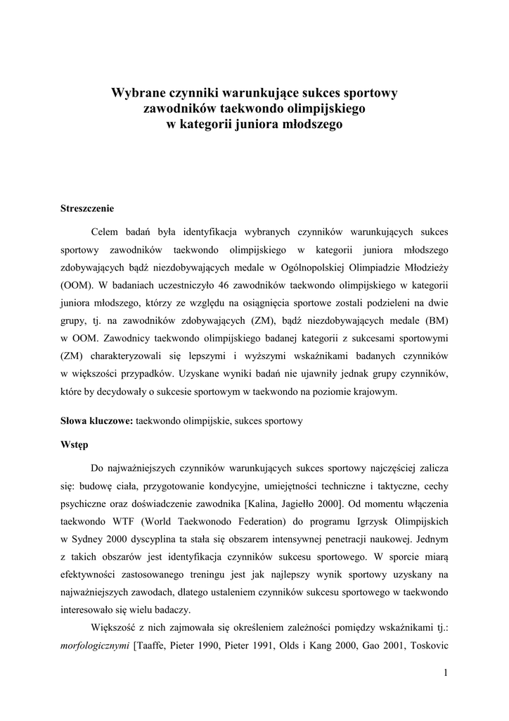 Wybrane czynniki warunkujące sukces sportowy zawodników taekwondo olimpijskiego w kategorii juniora młodszego Streszczenie Celem badań była identyfikacja wybranych czynników warunkujących sukces sportowy zawodników taekwondo olimpijskiego w kategorii juniora młodszego zdobywających bądź niezdobywających medale w Ogólnopolskiej Olimpiadzie Młodzieży (OOM). W badaniach uczestniczyło 46 zawodników taekwondo olimpijskiego w kategorii juniora młodszego, którzy ze względu na osiągnięcia sportowe zostali podzieleni na dwie grupy, tj. na zawodników zdobywających (ZM), bądź niezdobywających medale (BM) w OOM. Zawodnicy taekwondo olimpijskiego badanej kategorii z sukcesami sportowymi (ZM) charakteryzowali się lepszymi i wyższymi wskaźnikami badanych czynników w większości przypadków. Uzyskane wyniki badań nie ujawniły jednak grupy czynników, które by decydowały o sukcesie sportowym w taekwondo na poziomie krajowym. Słowa kluczowe: taekwondo olimpijskie, sukces sportowy Wstęp Do najważniejszych czynników warunkujących sukces sportowy najczęściej zalicza się: budowę ciała, przygotowanie kondycyjne, umiejętności techniczne i taktyczne, cechy psychiczne oraz doświadczenie zawodnika [Kalina, Jagiełło 2000]. Od momentu włączenia taekwondo WTF (World Taekwonodo Federation) do programu Igrzysk Olimpijskich w Sydney 2000 dyscyplina ta stała się obszarem intensywnej penetracji naukowej. Jednym z takich obszarów jest identyfikacja czynników sukcesu sportowego. W sporcie miarą efektywności zastosowanego treningu jest jak najlepszy wynik sportowy uzyskany na najważniejszych zawodach, dlatego ustaleniem czynników sukcesu sportowego w taekwondo interesowało się wielu badaczy. Większość z nich zajmowała się określeniem zależności pomiędzy wskaźnikami tj.: morfologicznymi [Taaffe, Pieter 1990, Pieter 1991, Olds i Kang 2000, Gao 2001, Toskovic 1 i wsp. 2004, Marković i wsp. 2005, Kazemi i wsp. 2006, Fritzsche i Raschka 2008, Pieter 2010], biomechanicznymi [Marković i wsp. 2005, Wąsik 2009], fizjologicznymi, psychologicznymi, kondycyjnymi [Jagiełło, Kalina 2000, Melhim 2001, Taskovic i wsp. 2004, Kazemi i wsp. 2006, Abdossaleh i wsp. 2008] oraz koordynacyjnymi [Sadovski 2003] z wynikiem sportowym w taekwondo. Wyniki wyżej wymienionych badaczy wykazały, że wysokie wyniki sportowe w taekwondo osiągali zawodnicy z mezomorficznym typem budowy ciała, wysokimi wskaźnikami szybkości, siły, wytrzymałości, gibkość, krótszy czasem reakcji oraz dobrą techniką. Dotychczasowy stan wiedzy o uwarunkowaniach wyniku sportowego w taekwondo nie rozstrzyga wielu kwestii. Odczuwa się niedostatek holistycznego podejścia do rozwiązania podjętego problemu uwzględniającego główne rodzaje przygotowania zawodników o różnym zaawansowaniu sportowym. Proces szkolenia sportowego jest długotrwały, dlatego analiza wpływów czynników strukturalnych na wynik sportowy powinna uwzględniać zawodników na różnym poziomie zaawansowania sportowego. Uznano, że podjęcie takich badań rozszerzy stan dotychczasowej wiedzy o dynamice wybranych czynników wpływających na wynik sportowy w taekwondo i pozwoli wyznaczyć kierunki opracowań skutecznych programów treningu. Celem badań była identyfikacja wybranych czynników warunkujących wysoki wynik sportowy uzyskany przez zawodników taekwondo olimpijskiego w kategorii juniora młodszego w kontekście zdobytych bądź niezdobytych medali w Ogólnopolskiej Olimpiadzie Młodzieży (OOM). Materiał i metody badań W badaniach wzięło udział 46 zawodników taekwondo olimpijskiego w kategorii juniora młodszego z 20 losowo wybranych klubów sportowych z 8 województw. Wszyscy badani zostali podzieleni na dwie grupy. Pierwszą grupę stanowili zawodnicy (n=18) zdobywający medale (ZM) w OOM, a drugą niezdobywający (BM) zawodnicy (n=28) zajmujący miejsca poza strefą medalową. Poziom sportowy zawodników odpowiadał stopniowi wyszkolenia od 8 kup do 2 kup. Średni staż treningowy zawodnika to 3,5 roku. Wynik sportowy stanowiła suma punktów zdobytych w OOM w 2010 i w dwóch turniejach kwalifikacyjnych do tych zawodów. Zastosowano punktację Polskiego Związku Taekwondo Olimpijskiego [http:// www.pztaekwondo.pl.]. 2 Tabela 1 Wiek i staż treningowy badanych Wiek sd Staż treningu sd Junior młodszy ogółem z medalem (ZM) bez medal (BM) 13,9 13,9 13,9 0,35 0,32 0,36 3,5 3,4 3,6 1,24 0,97 1,34 Badania pomiary Lp 1 Grupa obejmowały czynników: strukturalnych, kondycyjnych i gibkościowych, technicznych i koordynacyjnych. Spośród parametrów charakteryzujących budowę ciała oceniono: wysokość i masę ciała, wskaźnik smukłości BMI (Queteleta II), długość kończyn dolnych i górnych, szerokość barków i miednicy, obwód ramienia, przedramienia, uda i podudzia, grubość pięciu fałdów skórno-tłuszczowych (na podudziu, nad kolcem biodrowym, na ramieniu, pod łopatką i na brzuchu) [Milicer 1993; Szopa, Mleczko, Żak 1996, Łaska-Mierzejewska 1999, 2002, 2005]. Ocena zdolności kondycyjnych i gibkości obejmowała próby tj: „rzut piłką lekarską znad głowy (2 kg)”, „skok w dal z miejsca”, „siady z leżenia tyłem wykonywane w czasie 30 s”, „bieg na 30 metrów ze startu wysokiego”, „wielostopniowy bieg wahadłowy 20 m” (beep test) [Pilicz 1997, Grabowski, Szopa 1991]. Wydolność beztlenową mięśni kończyn dolnych mierzono z wykorzystaniem 30 sekundowego testu Wingate [Inbar, Bar-Or, Skinner 1996]. Określono następujące parametry: wielkość pracy jaką zawodnik wykonał (J·kg −1 ), moc maksymalną (W·kg −1 ); wskaźnik spadku mocy (%) oraz czas uzyskania i czas utrzymania mocy maksymalnej (s). Gibkość mierzono długością rozkroku podłużnego i poprzecznego [Sadovski 2003]. Umiejętności techniczne oceniano czasem wykonania 10 powtórzeń „dollyo chagi”, „jirugi momtong” oraz „360° dollyo chagi momtong” [http://www. pztaekwon