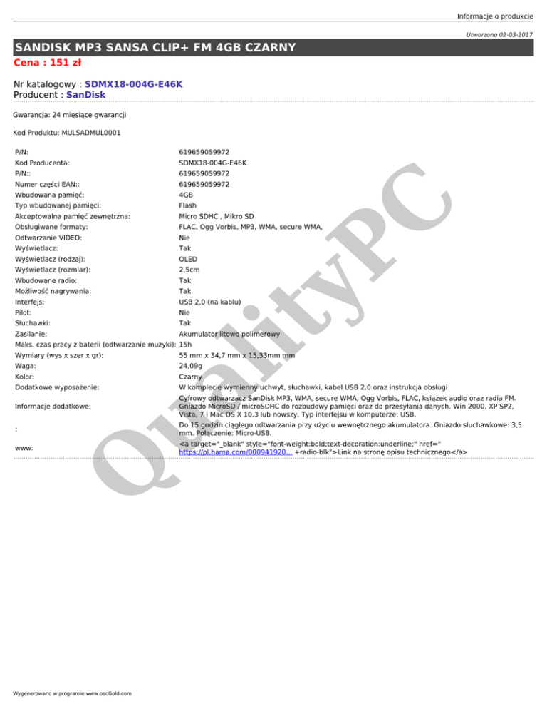Informacje o produkcie Utworzono 02-03-2017 SANDISK MP3 SANSA CLIP+ FM 4GB CZARNY Cena : 151 zł Nr katalogowy : SDMX18-004G-E46K Producent : SanDisk Gwarancja: 24 miesiące gwarancji 619659059972 Kod Producenta: SDMX18-004G-E46K P/N:: 619659059972 Numer części EAN:: 619659059972 Wbudowana pamięć: 4GB Typ wbudowanej pamięci: Flash Akceptowalna pamięć zewnętrzna: Micro SDHC , Mikro SD Obsługiwane formaty: FLAC, Ogg Vorbis, MP3, WMA, secure WMA, Odtwarzanie VIDEO: Nie Wyświetlacz: Tak Wyświetlacz (rodzaj): OLED Wyświetlacz (rozmiar): 2,5cm Wbudowane radio: Tak Możliwość nagrywania: Tak Interfejs: USB 2,0 (na kablu) Pilot: Nie Zasilanie: ua lit Słuchawki: yP P/N: C Kod Produktu: MULSADMUL0001 Tak Akumulator litowo polimerowy Maks. czas pracy z baterii (odtwarzanie muzyki): 15h Wymiary (wys x szer x gr): 55 mm x 34,7 mm x 15,33mm mm Waga: 24,09g Kolor: Czarny Dodatkowe wyposażenie: W komplecie wymienny uchwyt, słuchawki, kabel USB 2.0 oraz instrukcja obsługi Informacje dodatkowe: Cyfrowy odtwarzacz SanDisk MP3, WMA, secure WMA, Ogg Vorbis, FLAC, książek audio oraz radia FM. Gniazdo MicroSD / microSDHC do rozbudowy pamięci oraz do przesyłania danych. Win 2000, XP SP2, Vista, 7 i Mac OS X 10.3 lub nowszy. Typ interfejsu w komputerze: USB. : Do 15 godzin ciągłego odtwarzania przy użyciu wewnętrznego akumulatora. Gniazdo słuchawkowe: 3,5 mm. Połączenie: Micro-USB. <a target="_blank" style="font-weight:bold;text-decoration:underline;" href=" https://pl.hama.com/000941920... +radio-blk">Link na stronę opisu technicznego</a> Q www: Wygenerowano w programie www.oscGold.com
