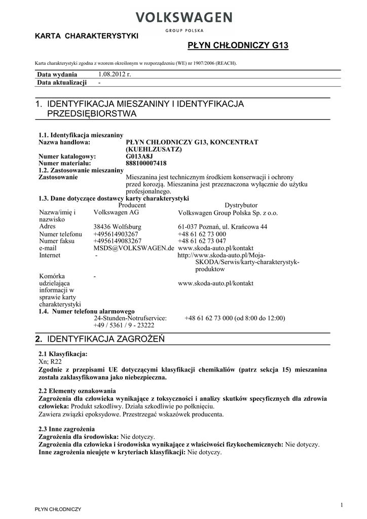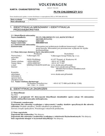 KARTA CHARAKTERYSTYKI PŁYN CHŁODNICZY G13 Karta charakterystyki zgodna z wzorem określonym w rozporządzeniu (WE) nr 1907/2006 (REACH). Data wydania Data aktualizacji 1.08.2012 r. - 1. IDENTYFIKACJA MIESZANINY I IDENTYFIKACJA PRZEDSIĘBIORSTWA 1.1. Identyfikacja mieszaniny Nazwa handlowa: PŁYN CHŁODNICZY G13, KONCENTRAT (KUEHLZUSATZ) Numer katalogowy: G013A8J Numer materiału: 888100007418 1.2. Zastosowanie mieszaniny Zastosowanie Mieszanina jest technicznym środkiem konserwacji i ochrony przed korozją. Mieszanina jest przeznaczona wyłącznie do użytku profesjonalnego. 1.3. Dane dotyczące dostawcy karty charakterystyki Producent Dystrybutor Nazwa/imię i Volkswagen AG Volkswagen Group Polska Sp. z o.o. nazwisko Adres 38436 Wolfsburg 61-037 Poznań, ul. Krańcowa 44 Numer telefonu +495614903267 +48 61 62 73 000 Numer faksu +4956149083267 +48 61 62 73 047 e-mail [email protected] www.skoda-auto.pl/kontakt Internet http://www.skoda-auto.pl/MojaSKODA/Serwis/karty-charakterystykproduktow Komórka udzielająca www.skoda-auto.pl/kontakt informacji w sprawie karty charakterystyki 1.4. Numer telefonu alarmowego 24-Stunden-Notrufservice: +48 61 62 73 000 (od 8:00 do 12:00) +49 / 5361 / 9 - 23222 2. IDENTYFIKACJA ZAGROŻEŃ 2.1 Klasyfikacja: Xn; R22 Zgodnie z przepisami UE dotyczącymi klasyfikacji chemikaliów (patrz sekcja 15) mieszanina została zaklasyfikowana jako niebezpieczna. 2.2 Elementy oznakowania Zagrożenia dla człowieka wynikające z toksyczności i analizy skutków specyficznych dla zdrowia człowieka: Produkt szkodliwy. Działa szkodliwie po połknięciu. Zawiera związki epoksydowe. Przestrzegać wskazówek producenta. 2.3 Inne zagrożenia Zagrożenia dla środowiska: Nie dotyczy. Zagrożenia dla człowieka i środowiska wynikające z właściwości fizykochemicznych: Nie dotyczy. Inne zagrożenia nieujęte w kryteriach klasyfikacji: Nie dotyczy. PŁYN CHŁODNICZY 1 KARTA CHARAKTERYSTYKI PŁYN CHŁODNICZY G13 3. SKŁAD/INFORMACJA O SKŁADNIKACH Składniki niebezpieczne zawarte w produkcie. Glikol etylenowy Zawartość: 70%<C<75% Nr CAS: 107-21-1 Nr WE: 203-473-3 Nr indeksowy: 603-027-00-1 Klasyfikacja: Xn; R22 Kwas 2-etyloheksanowy Zawartość: 2%<C<3% Nr CAS: 149-57-5 Nr WE: 205-743-6 607-230-00-6 Nr indeksowy: Klasyfikacja: Repro. Kat.3; R63 Pełen wykaz zwrotów R oraz zagrożeń patrz sekcja 16. 4. PIERWSZA POMOC Uwagi ogólne W przypadku wystąpienia jakichkolwiek niepokojących objawów wezwać natychmiast lekarza lub odwieźć poszkodowanego do szpitala, pokazać kartę charakterystyki, opakowanie mieszaniny lub etykietę. Objawy zatrucia Narażenie na pary lub kontakt z mieszaniną może wywołać, u osób wrażliwych zaczerwienienie spojówek i łzawienie oczu. Mieszanina działa szkodliwie po połknięciu. W przypadku połknięcia produktu może wystąpić podrażnienie błon śluzowych przewodu pokarmowego (nudności, wymioty, biegunka, ostry ból brzucha) (szczegółowy opis patrz pkt 11). Wdychanie Wyprowadzić lub wynieść poszkodowanego na świeże powietrze. Zapewnić poszkodowanemu ciepło i warunki do odpoczynku. W przypadku zatrzymania lub nieregularnego oddechu zastosować sztuczne oddychanie. Natychmiast wezwać lekarza. Oczy Usunąć szkła kontaktowe. Natychmiast płukać oczy, przytrzymując odchylone powieki, dużą ilością bieżącej, chłodnej wody - nie stosować zbyt silnego strumienia wody ze względu na możliwość uszkodzenia rogówki. Przemywać oczy, przez co najmniej 15 minut. W przypadku zanieczyszczenia jednego oka należy chronić w trakcie przemywania drugie oko przed zanieczyszczeniem. Skonsultować się z lekarzem okulistą. Skóra Natychmiast zdjąć skażoną odzież i buty a następnie przemyć dużą ilością bieżącej, chłodnej wody z mydłem. Nie stosować mydła, jeśli są zmiany na skórze. W przypadku wystąpienia zmian skórnych natychmiast wezwać lekarza. Odzież i buty dokładnie oczyścić i wyprać przed ponownym użyciem. Połknięcie Nie podawać do picia niczego osobie nieprzytomnej! Zapewnić poszkodowanemu ciepło i warunki do odpoczynku. Nie prowokować wymiotów. Jeżeli poszkodowana osoba wymiotuje leżąc na plecach, ułożyć ją w pozycji bocznej ustalonej. Przewieźć zatrutego do szpitala w celu obserwacji i ewentualnego leczenia. Pokazać kartę charakterystyki, opakowanie lub etykietę. UWAGA Pacjenta nieprzytomnego ułożyć w pozycji bocznej ustalonej, zapewnić zatrutemu spokój, chronić przed utratą ciepła, kontrolować oddech i puls. Nigdy nie wywoływać wymiotów ani nie podawać niczego doustnie osobie nieprzytomnej lub zamroczonej. Przewieźć zatrutego do szpitala w celu obserwacji i ewentualnego leczenia. Pokazać kartę charakterystyki, opakowanie lub etykietę. PŁYN CHŁODNICZY 2 KARTA CHARAKTERYSTYKI PŁYN CHŁODNICZY G13 5. POSTĘPOWANIE W PRZYPADKU POŻARU Zalecane środki gaśnicze: wszystkie dostępne środki gaśnicze: gasić gaśnicą proszkową, śniegową, gaśnicą pianową odporną na alkohol, prądami wodnymi rozproszonymi. Zbiorniki narażone na działanie ognia lub wysokiej temperatury chłodzić wodą z bezpiecznej odległości; jeśli to możliwe, usunąć je z obszaru zagrożenia. Nie dopuścić do przedostania się wód gaśniczych do kanalizacji. Nieodpowiednie środki gaśnicze: Nie podano. Szczególne zagrożenie ze strony produktów spalania i wydzielających się gazów: Podczas pożaru powstają niebezpieczne dla zdrowia pyły i dymy zawierające niebezpieczne dla zdrowia produkty rozkładu: tlenki węgla i tlenki azotu. Nie wdychać dymów. Specjalne wyposażenie ochronne strażaków: Odzież ochronna z materiałów powlekanych i aparaty izolujące drogi oddechowe niezależne od otaczającego powietrza. Inne uwagi: − zawiadomić otoczenie o pożarze, usunąć z obszaru zagrożenia wszystkie osoby niebiorące udziału w likwidowaniu pożaru − jeśli jest to możliwe bez narażania zdrowia lub życia ratowników usunąć z zagrożonego obszaru zbiorn