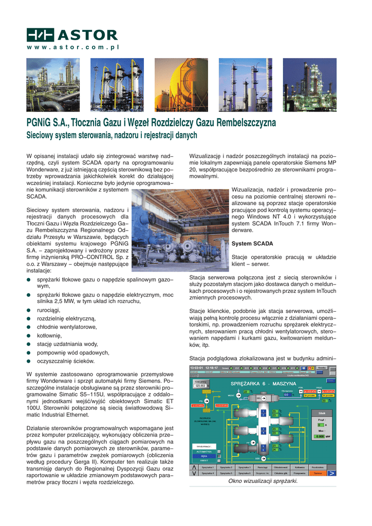 w w w. a s t o r. c o m . p l PGNiG S.A., Tłocznia Gazu i Węzeł Rozdzielczy Gazu Rembelszczyzna Sieciowy system sterowania, nadzoru i rejestracji danych W opisanej instalacji udało się zintegrować warstwę nad− rzędną, czyli system SCADA oparty na oprogramowaniu Wonderware, z już istniejącą częścią sterownikową bez po− trzeby wprowadzania jakichkolwiek korekt do działającej wcześniej instalacji. Konieczne było jedynie oprogramowa− nie komunikacji sterowników z systemem SCADA. Sieciowy system sterowania, nadzoru i rejestracji danych procesowych dla Tłoczni Gazu i Węzła Rozdzielczego Ga− zu Rembelszczyzna Regionalnego Od− działu Przesyłu w Warszawie, będących obiektami systemu krajowego PGNiG S.A. − zaprojektowany i wdrożony przez firmę inżynierską PRO−CONTROL Sp. z o.o. z Warszawy − obejmuje następujące instalacje: ● sprężarki tłokowe gazu o napędzie spalinowym gazo− wym, ● sprężarki tłokowe gazu o napędzie elektrycznym, moc silnika 2,5 MW, w tym układ ich rozruchu, ● rurociągi, ● rozdzielnię elektryczną, ● chłodnie wentylatorowe, ● kotłownię, ● stację uzdatniania wody, ● pompownię wód opadowych, ● oczyszczalnię ścieków. Wizualizację i nadzór poszczególnych instalacji na pozio− mie lokalnym zapewniają panele operatorskie Siemens MP 20, współpracujące bezpośrednio ze sterownikami progra− mowalnymi. Wizualizacja, nadzór i prowadzenie pro− cesu na poziomie centralnej sterowni re− alizowane są poprzez stacje operatorskie pracujące pod kontrolą systemu operacyj− nego Windows NT 4.0 i wykorzystujące system SCADA InTouch 7.1 firmy Won− derware. System SCADA Stacje operatorskie pracują w układzie klient − serwer. Stacja serwerowa połączona jest z siecią sterowników i służy pozostałym stacjom jako dostawca danych o meldun− kach procesowych i o rejestrowanych przez system InTouch zmiennych procesowych. Stacje klienckie, podobnie jak stacja serwerowa, umożli− wiają pełną kontrolę procesu włącznie z działaniami opera− torskimi, np. prowadzeniem rozruchu sprężarek elektrycz− nych, sterowaniem pracą chłodni wentylatorowych, stero− waniem napędami i kurkami gazu, kwitowaniem meldun− ków, itp. Stacja podglądowa zlokalizowana jest w budynku admini− W systemie zastosowano oprogramowanie przemysłowe firmy Wonderware i sprzęt automatyki firmy Siemens. Po− szczególne instalacje obsługiwane są przez sterowniki pro− gramowalne Simatic S5−115U, współpracujące z oddalo− nymi jednostkami wejść/wyjść obiektowych Simatic ET 100U. Sterowniki połączone są siecią światłowodową Si− matic Industrial Ethernet. Działanie sterowników programowalnych wspomagane jest przez komputer przeliczający, wykonujący obliczenia prze− pływu gazu na poszczególnych ciągach pomiarowych na podstawie danych pomiarowych ze sterowników, parame− trów gazu i parametrów zwężek pomiarowych (obliczenia według procedury Gerga II). Komputer ten realizuje także transmisję danych do Regionalnej Dyspozycji Gazu oraz raportowanie w układzie zmianowym podstawowych para− metrów pracy tłoczni i węzła rozdzielczego. Okno wizualizacji sprężarki. MP 20 MP 20 MP 20 S5 115U S5 115U MP 20 S5 115U S5 115U Komputer przeliczający S5 115U S5 115U Światłowodowa sieć sterownikowa S5 115U Przemysłowa baza danych IndustrialSQL Server Server WWW SuiteVoyager Stacje operatorskie Sieć Ethernet − Produkcja S5 115U Stacja podglądowa Przeglądarka Intrnet Explorer 5.01 Narzędzie klienkie InSQL ActiveFactory Sieć Ethernet − Biuro Architektura systemu. ● stracji w pokoju kierownika tłoczni. Wykorzystując przeglą− darkę aplikacji InTouch FactoryFocus, umożliwia ona kie− rownikowi tłoczni pełną i szybką wizualizację pracy wszyst− kich instalacji, jednakże bez działań operatorskich. serwer WWW z oprogramowaniem Wonderware Suite− Voyager 1.0. pracujące pod systemem operacyjnym MS Windows NT Server 4.0. Stacje operatorskie połączone są siecią Ethernet (skrętka), która oddzielona jest od sieci biurowej. Funkcje systemu w zakresie rejestracji danych procesowych i ich udostępnia− nia klientom biurowej sieci Ethernet realizowane są poprzez dwa serwery: Przemysłowa baza danych IndustrialSQL Server ● serwer SQL z oprogramowaniem Wonderware Indu− strialSQL Server 7.1, Serwer bazy danych zbiera dane procesowe bezpośrednio z sieci sterowników, niezależnie od akwizycji i rejestracji danych prowadzonej przez system InTouch. Bezpieczeń− stwo danych składowanych w serwerze SQL podwyższono poprzez zastosowanie dwóch dysków lustrzanych. ● tworzenie prostych obrazów synoptycznych i ich wizu− alizację w trybie on−line, z cyklicznym odświeżaniem w celu szybkiego podglądu na komputerze klienckim wy− branych parametrów pracy Tłoczni lub Węzła Roz− dzielczego (bez konieczności posiadania oprogramo− wania SCADA, np. InTouch). Po stronie klienckiej do analizy danych zgromadzonych w serwerze SQL zastosowano pakiet programów ActiveFac− tory w polskiej wersji językowej. Narzędzie to umożliwia wygodną analizę danych: ● ● ● tworzenie wykresów wybranych zmiennych proceso− wych za wybrany okres czasu, co jest szczególnie przydatne dla śledzenia i wychwytywania długookreso− wych tendencji zmian parametrów głównych ciągów technologicznych tłoczni − np. dzięki wychwyceniu w długim okresie czasu wzrostu nachylenia krzywej re− prezentującej licznik zużycia wody technologicznej, możliwe było wykrycie wycieku na rurociągu prowa− dzącym tę wodę (do czasu zainstalowania serwera In− dustrialSQL przyczyny awarii tego typu nie były wykry− wane), generowanie raportów zmianowych oraz dobowych w formacie MS Word, zawierających zestawienia para− metrów interesujących poszczególne służby zakładowe (ActiveFactory zawiera nakładkę na MS Word), wykonywanie raportów oraz analiz w fo
