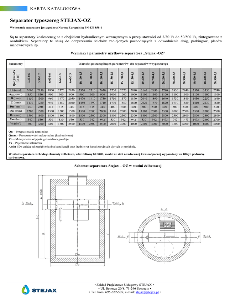 KARTA KATALOGOWA Separator typoszereg STEJAX-OZ Wykonanie separatora jest zgodne z Normą Europejską PN-EN 858-1 Są to separatory koalescencyjne z obejściem hydraulicznym wewnętrznym o przepustowości od 3/30 l/s do 50/500 l/s, zintegrowane z osadnikiem. Separatory te służą do oczyszczania ścieków zaolejonych pochodzących z odwodnienia dróg, parkingów, placów manewrowych itp. Wymiary i parametry użytkowe separatora „Stejax -OZ” 3/30-1,2 6/60-0,6 6/60-1,5 6/60-2,5 10/100-1,5 10/100-2,5 10/100-3,5 15/150-2,0 15/150-3,0 15/150-4,0 20-200-2,5 20/200-4,0 20/200-5,0 30/300-3,5 30/300-6,0 40/400-4,0 40/400-8,0 50/500-5,0 Wartości poszczególnych parametrów dla separatów w typoszeregu 3/30-0,6 Qn/Qmax-Vs (l/s-m3) Parametry Hc(mm) Amin. (mm) B (mm) C (mm) Dn (mm) Dw (mm) 2000 850 1150 1130 250 2150 850 1300 1280 250 1860 900 960 940 315 2370 900 1470 1450 315 2950 900 2050 2020 315 2370 900 1470 1450 315 2310 900 1410 1390 315 2630 900 1730 1710 315 2750 1000 1750 1730 400 2570 1000 1570 1550 400 2890 1000 1890 1870 400 3140 1100 2040 2020 500 2990 1100 1890 1870 500 2740 1100 1640 1620 500 2830 1100 1730 1710 500 2940 1100 1840 1820 500 2530 1100 1430 1410 500 3350 1100 2250 2230 500 2740 1100 1640 1620 500 1200 1500 1500 1500 1500 1500 2000 2000 1500 2000 2000 1500 2000 2500 2000 2500 2500 2500 2500 Dz (mm) Vo (dm3) Vs (dm3) 1500 340 1800 530 1800 530 1800 530 1800 530 1800 530 2300 942 2300 942 1800 530 2300 942 2300 942 1800 530 2300 942 2800 1473 2300 942 2800 1473 2800 1473 2800 2400 2800 2700 600 1200 600 1500 2500 1500 2500 3500 2000 3000 4000 2500 4000 5000 3500 6000 4000 8000 5000 Qn – Przepustowość nominalna Qmax - Przepustowość maksymalna (hydrauliczna) Vo – Maksymalna objętość gromadzonego oleju Vs – Pojemność szlamowa Amin i Dn zależą od zagłębienia dna kanalizacji oraz średnic rur kanalizacyjnych ujętych w projekcie. W skład separatora wchodzą: elementy żelbetowe, właz żeliwny kl.D400, moduł ze stali nierdzewnej kwasoodpornej wyposażony we filtry i poduszkę sorbentową. Schemat separatora Stejax – OZ w studni żelbetowej • Zakład Projektowo Usługowy STEJAX • • Ul. Benesza 20/8, 71-246 Szczecin • • Tel. kom. 695-622-509, e-mail: [email protected] •
