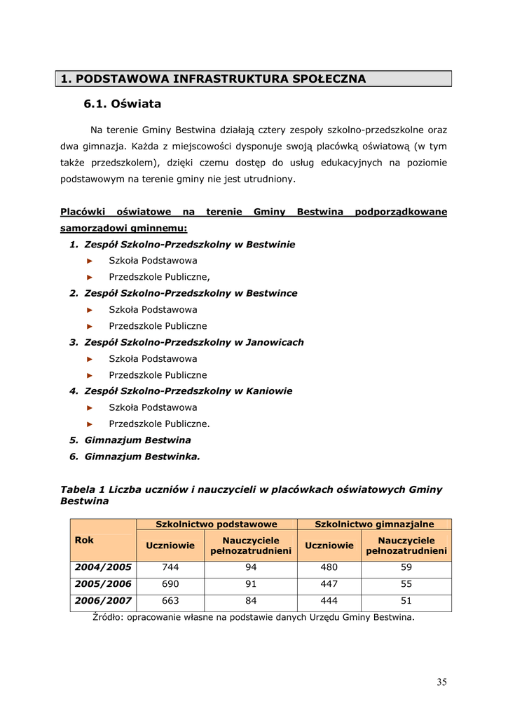 1. PODSTAWOWA INFRASTRUKTURA SPOŁECZNA 6.1. Oświata Na terenie Gminy Bestwina działają cztery zespoły szkolno-przedszkolne oraz dwa gimnazja. Każda z miejscowości dysponuje swoją placówką oświatową (w tym także przedszkolem), dzięki czemu dostęp do usług edukacyjnych na poziomie podstawowym na terenie gminy nie jest utrudniony. Placówki oświatowe na terenie Gminy Bestwina podporządkowane samorządowi gminnemu: 1. Zespół Szkolno-Przedszkolny w Bestwinie ► Szkoła Podstawowa ► Przedszkole Publiczne, 2. Zespół Szkolno-Przedszkolny w Bestwince ► Szkoła Podstawowa ► Przedszkole Publiczne 3. Zespół Szkolno-Przedszkolny w Janowicach ► Szkoła Podstawowa ► Przedszkole Publiczne 4. Zespół Szkolno-Przedszkolny w Kaniowie ► Szkoła Podstawowa ► Przedszkole Publiczne. 5. Gimnazjum Bestwina 6. Gimnazjum Bestwinka. Tabela 1 Liczba uczniów i nauczycieli w placówkach oświatowych Gminy Bestwina Szkolnictwo podstawowe Rok Szkolnictwo gimnazjalne Uczniowie Nauczyciele pełnozatrudnieni Uczniowie Nauczyciele pełnozatrudnieni 2004/2005 744 94 480 59 2005/2006 690 91 447 55 2006/2007 663 84 444 51 Źródło: opracowanie własne na podstawie danych Urzędu Gminy Bestwina. 35 Liczba uczniów w ostatnich czterech latach zmalała, co obrazuje poniższy wykres. liczba uczniów Tabela 2 Liczba uczniów uczęszczających do szkół podstawowych i gimnazjalnych w Gminie Bestwina 1600 1400 1200 1000 800 600 400 200 0 2000 2001 2002 2003 lata 2004 2005 Źródło: opracowanie własne na podstawie danych GUS. Elementem analizy sytuacji oświaty w gminie jest współczynnik skolaryzacji brutto, który pokazuje relację liczby osób uczących się (stan na początku roku szkolnego) na danym poziomie kształcenia (niezależnie od wieku) do liczby ludności (stan w dniu 31 XII) w grupie wieku określonej jako odpowiadająca temu poziomowi nauczania. Współczynnik skolaryzacji brutto w szkołach podstawowych wynosi 92,50 %, natomiast w gimnazjum 94,50 %. Niższy od 100 % wskaźnik wynika z faktu, iż niektóre dzieci uczęszczają do szkół zlokalizowanych poza terenem Gminy. W Gminie Bestwina każda z miejscowości ma swoje przedszkole. Przedszkola podporządkowane są samorządowi gminnemu. W poniższej tabeli zaprezentowano liczbę dzieci uczęszczających do publicznych przedszkoli w Gminie w latach 19952005. 36 Tabela 3 Liczba dzieci uczęszczających do przedszkoli położonych w Gminie Bestwina 300 250 liczba dzieci 200 150 100 50 0 1995 1996 1997 1998 1999 2000 2001 2002 2003 2004 2005 lata Źródło: opracowanie własne na podstawie danych GUS. Zauważalne są wahania w liczbie dzieci uczęszczających do przedszkoli. Zdecydowany spadek dzieci w przedszkolach w Gminie Bestwina miał miejsce w latach 1999-2002. Od roku 2003 wzrasta zainteresowanie wychowaniem przedszkolnym, co ma swoje odzwierciedlenie we wzroście liczby dzieci (tendencja wzrostowa). Powodem zwiększenia zainteresowania rodziców ofertą przedszkoli jest z pewnością poprawa jakości i standardu infrastruktury w tym zakresie, która nastąpiła poprzez wykonanie generalnych remontów zespołów szkolno-przedszkolnych w ostatnich latach. Analizując jakość infrastruktury oświatowej na terenie Gminy w pierwszej kolejności należy jeszcze raz podkreślić, iż wszystkie obiekty szkolne i przedszkolne zostały w ostatnich latach kompleksowo wyremontowane wraz z wykonaniem termomodernizacji architektura). oraz Obiekty infrastruktury oświatowe towarzyszącej Gminy Bestwina (parkingi, są jedynymi zieleń, z mała najlepiej utrzymanych w całym Powiecie Bielskim. Obiekty zostały także doposażone w sprzęt dydaktyczny (na przykład w komputery m.in. w ramach programu IKONKA). Dane statystyczne mówią, że wszystkie placówki oświatowe wyposażone są w 86 komputerów, w tym 59 jest podłączonych do sieci Internet (dane GUS za 2005 r.). Na jeden komputer przypada 23 uczniów szkół podstawowych oraz 24 uczniów gimnazjum, co jest nieco lepszym wynikiem w stosunku do statystyki krajowej, gdzie średnio 28 uczniów przypada na jeden komputer, natomiast zdecydowanie gorszym niż w wyżej rozwiniętych krajach Europy Zachodniej. 37 Doinwestowania wymaga infrastruktura sportowa zewnętrzna placówek oświatowych w Bestwinie, w Janowicach i w Kaniowie. Aktualnie w trakcie rozbudowy znajduje się infrastruktura zewnętrzna w Janowicach. Największych nakładów wymaga infrastruktura sportowa przy szkole w Kaniowie (aktualnie uczniowie muszą korzystać ze stadionu należącego do LKS „Przełom” w Kaniowie). Najlepiej rozwinięta jest infrastruktura sportowa przy szkole w Bestwince. Gmina nie posiada basenu krytego ani też gminnej hali sportowej, gdzie mogłaby odbywać się zajęcia szkolne. 6.2. Ochrona zdrowia Kluczową funkcję w zakresie podstawowej opieki zdrowotnej na terenie Gminy Bestwina pełni Samodzielny Publiczny Zakład Opieki Zdrowotnej w Bestwinie, którego oferta skierowana jest do wszystkich mieszkańców, a większość dostępnych usług jest świadczona nieodpłatnie. Zakład posiada umowę z Narodowym Funduszem Zdrowia w zakresie świadczeń opieki zdrowotnej. Samodzielny Publiczny Zakład Opieki Zdrowotnej jest jednostką organizacyjną Gminy Bestwina. Działalność lecznicza, ambulatoryjna i diagnostyczna prowadzona jest w Ośrodku Zdrowia w Bestwinie i Kaniowie. Aktualnie w ramach Samodzielnego Publicznego Zakładu Opieki Zdrowotnej w Bestwinie działają następujące poradnie i pracownie: 1) Poradnia Podstawowej Opieki Zdrowotnej: 2) Poradnia ginekologiczno-położnicza: 3) Laboratorium – laboratorium analityczne bez bakteriologii. 4) Pracownia RTG 5) Gabinet fizykoterapii – 2 pomieszczenia. 6) Pracownia EKG i spirometrii, 7) Pracownia USG, W poradni Podstawowej Opieki Zdrowotnej SP ZOZ zadeklarowanych jest 6300 osób – Ośrodek Bestwina i 700 osób - Ośrodek Kaniów. W Poradni ginekologiczno - położniczej, która działa od stycznia 2006 r. w Ośrodku w Bestwinie