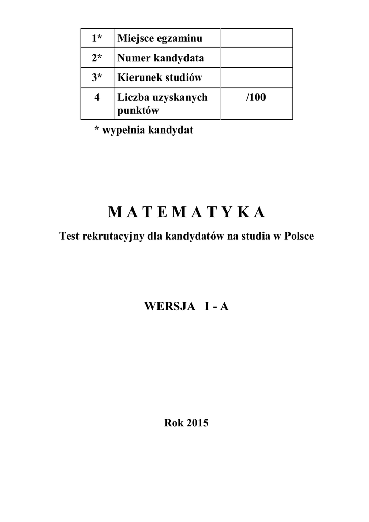 1* Miejsce egzaminu 2* Numer kandydata 3* Kierunek studiów 4 Liczba uzyskanych punktów /100 * wypełnia kandydat MATEMATYKA Test rekrutacyjny dla kandydatów na studia w Polsce WERSJA I - A Rok 2015 Uwaga. Nie wolno używać kalkulatora. Proszę nie używać korektora. Błędne obliczenia lub sformułowania wystarczy wyraźnie skreślić. 1. Znaleźć sumę wszystkich liczb naturalnych podzielnych przez 12 i należących do przedziału [30, 264]. 2. Narysować wykres funkcji dla x , 2, 2x 5 x 1 dla x 2, 0, f ( x) 2 x 0,1, 4 x 4 x 1 dla x dla x 1, 4. y 1 0 2015 x 1 Matematyka, wersja I–A Str. 2 3. Suma wszystkich wyrazów nieskończonego ciągu geometrycznego S=16, a suma jego czterech początkowych wyrazów S4=15. Znaleźć pierwszy wyraz i iloraz tego ciągu. 4. Rozwiązać nierówność 5. Wyznaczyć granice funkcji f ( x ) 6. Rozwiązać nierówność: sin 2 x 2015 x2 2 1. x2 x x 1 na końcach przedziałów określoności. x2 1 dla x 0, 2 . 2 Matematyka, wersja I–A Str. 3 7. Punkty A(-1, 1), B(3, -1) i C(1, 3) są wierzchołkami rombu ABCD. a) Znaleźć współrzędne punktu D. b) Napisać równania prostych, na których leżą przekątne tego rombu. 8. Wyznaczyć dziedzinę funkcji f ( x ) log 2 (3 2 x x 2 ) . 9. Wielomian W x x 3 m 1x 2 mx 6 dzieli się przez dwumian x 3 . Wyznaczyć m i znaleźć pierwiastki tego wielomianu. 10. Z pudełka w którym jest 10 kul ponumerowanych od 1 do 10 wyjmujemy jednocześnie 2 kule. Jakie jest prawdopodobieństwo, że suma numerów wylosowanych kul jest mniejsza niż 5? 2015 Matematyka, wersja I–A Str. 4