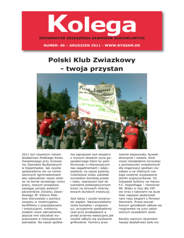 Kolega INFORMATOR ZRZESZENIA ZAWODOW BUDOWLANYCH NUMER: 40 – GRUDZIEN 2011 - WWW.BYGSAM.DK Polski Klub Zwiazkowy - twoja przystan 2011 był czwartym rokiem dzialalnosci Polskiego Klubu Zwiazkowego przy Zrzeszeniu Zawodow Budowlanych w Kopenhadze. Jak zwykle spotykalismy sie na comiesiecznych zgromadzeniach aby uaktualniac nasza wiedze na temat dunskiego rynku pracy, nowych przepisow, zasiegac porady polskich pacownikow Zwiazku Zawodowego 3F. Kilkoro Polakow skorzystalo z pomocy zwiazku w rozstrzyganiu konfliktow z pracodawcami i instytucjami, niektorzy znalezli nowe zatrudnienie, jeszcze inni odzyskali wypracowane a niewyplacone pieniadze. Na nasze spotka- nia zapraszani byli eksperci z roznych dziedzin zycia gospodarczego Danii by poinformowac o interesujacych nas zagadnieniach i odpowiedziec na nasze pytania. Czlonkowie klubu udzielali wywiadow dunskiej prasie i radiu, zapraszani byli do oceniania polskojezycznych tresci na stronach internetowych dunskich instytucji. Jest takze i czysto towarzyski aspekt. Nawiazywalismy nowe kontakty i znajomosci, przyjemnie spedzalismy czas przy przekaskach a przed przerwa wakacyjna jak zwykle odbyło się wystawne grillowanie. Humory prze- waznie dopisywaly, bywalo dowcipnie i wesolo. Klub moze nieodplatnie korzystac z pomieszczen zwiazkowych dla organizacji spotkan czy zabaw a na chetnych czekaja swietnie wyposazone domki wypoczynkowe. 03 listopada bylismy na meczu F.C. Kopenhaga – Hannover 96. Bilety w lozy dla VIPow wraz z talonami na duza ilosc napojow podarował nam nasz ekspert z Pension Danmark. Przed poczatkowym gwizdkiem odbyła sie rozgrzewka na suto zastawionym szwedzkim stole. Bardzo waznym akcentem naszej dzialalnosci było wz- budzanie w rodakach w Danii poczucia wlasnej wartosci i woli walki o sprawiedliwe traktowanie na rynku pracy, zgodnie z obowiazujacymi przepisami Unii Europejskiej i dunskich umow branzowych. Wielu z nas ze wspolnych rozmow wynioslo przekonanie, ze swoja fachowoscia i pracowitoscia zasługujemy na rowne z innymi narodowosciami, w tym z Dunczykami, traktowanie na rynku pracy, wielu zostalo uswiadomionych, ze pracuja w warunkach niezgodnych ze zdrowymi zasadami, ze sa wykorzystywani a niejednokrotnie traktowani przez nieuczciwych pracodawcow jak niewolnicy. Nie tak przedstawiano nam Danie gdy w 2007 roku rzadowy dunski autobus propagandowy objezdzał Polske zapraszajac nas do pracy w Danii. Pamietajac o tym przygotowujemy sie do piatego roku działalnosci Klubu i mamy konkretne plany takie jak wyjazd na Jutlandie w marcu w zwiazku z objeciem przez Danie prezydencji w UE, czy wizyta w dunskim parlamencie 27.02.2012 w godz. 1600–1830. Czekaja takze kolejni eksperci. Wszyscy Polacy sa zaproszeni a uczestnictwo nigdy nic nie kosztuje – trzeba tylko zapisac sie mailem lub sms-em u Roberta – robert.olejnik@3f. dk, tel: 227 989 60. Podjelismy pierwsze kroki w kierunku połaczenia naszego klubu z klubem zrzeszajacym pracownikow restauracji, magazynow, pakowaczy i sprzatajacych by wzmocnić siłe naszego oddzialywania. Maciej Slezak Drodzy koledzy i kolezanki! Zyczymy Wam pelnych radosci Swiat Bozego Narodzenia oraz pomyslnego Nowego Roku 2012. Skladamy takze zyczenia wszystkim tym ktorzy ktorzy nas oszukiwali i wykorzystywali, zyczymy im wiecej kontroli ze strony Inspekcji Pracy, Policji i Urzedu Podatkowego oraz odwiedzin dzialaczy Zwiazkow Zawodowych. Spotkania klubu Zamykamy 2011 rok spotkaniem „zamknietym”/ brak wolnych miejsc klubu w dniu 19 grudnia. Prosimy o informowanie sie o nowych spotkaniach w 2012, po 15 stycznia 2012 na stronie www.bygsam.dk Zrzeszenie Zwiazkow Zawodowych Budownictwa - Jest to zrzeszenie 13 zwiazkow budowlanych w Kopenhadze (murarze, ciesle, malarze, elektrycy, ogrodnicy, pracownicy robot ziemno – betonowych, montezy rusztowan, pracownicy wodno – kanalizacji i gazu oraz hydraulicy, kowale i spawacze). Skontaktuj sie z nami pod adresem: Mølle Alle 26, 2500 Valby. Redakcja: Robert Olejnik og Mads Bruun Pedersen (DJ). Napisz i zadzwon do polsko mowiacych zwiazkowcow: E-mail: [email protected] (22 79 89 60) lub [email protected] (23 45 75 34). Przeczytaj wiecej po polsku na: www.bygsam.dk, www.3f.dk