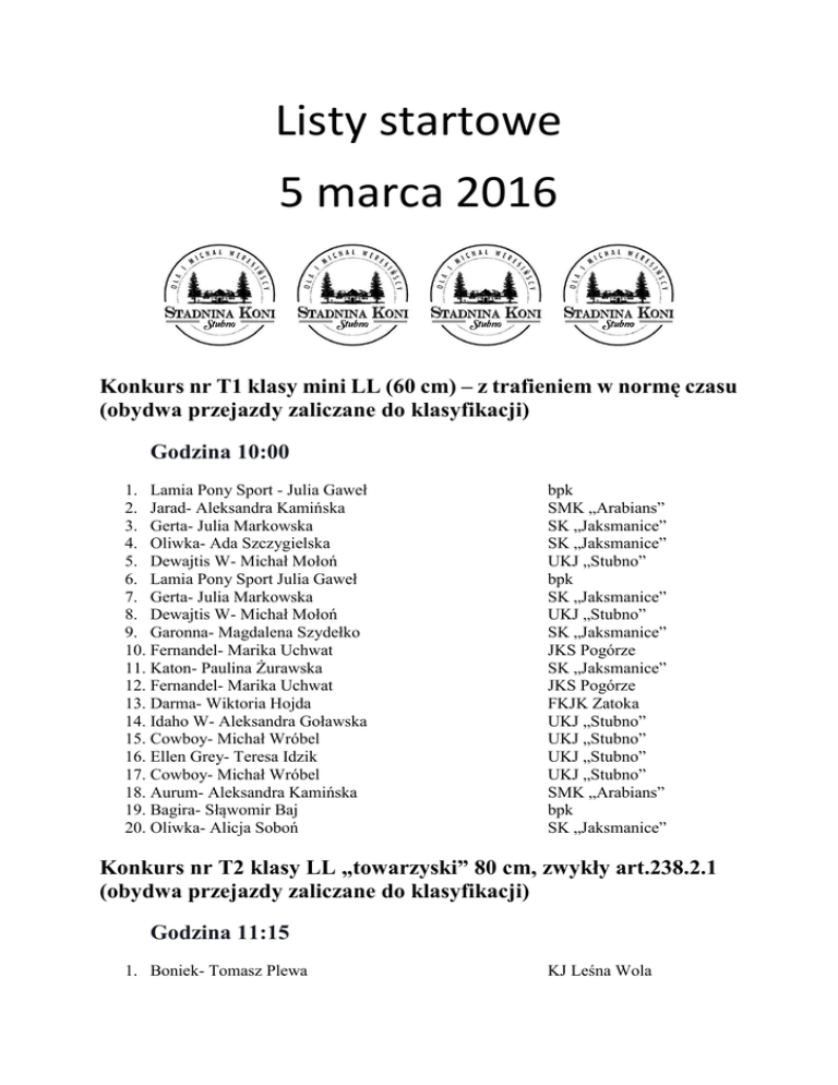 Listy startowe 5 marca 2016 - Stadnina Koni Stubno Ola i Michał