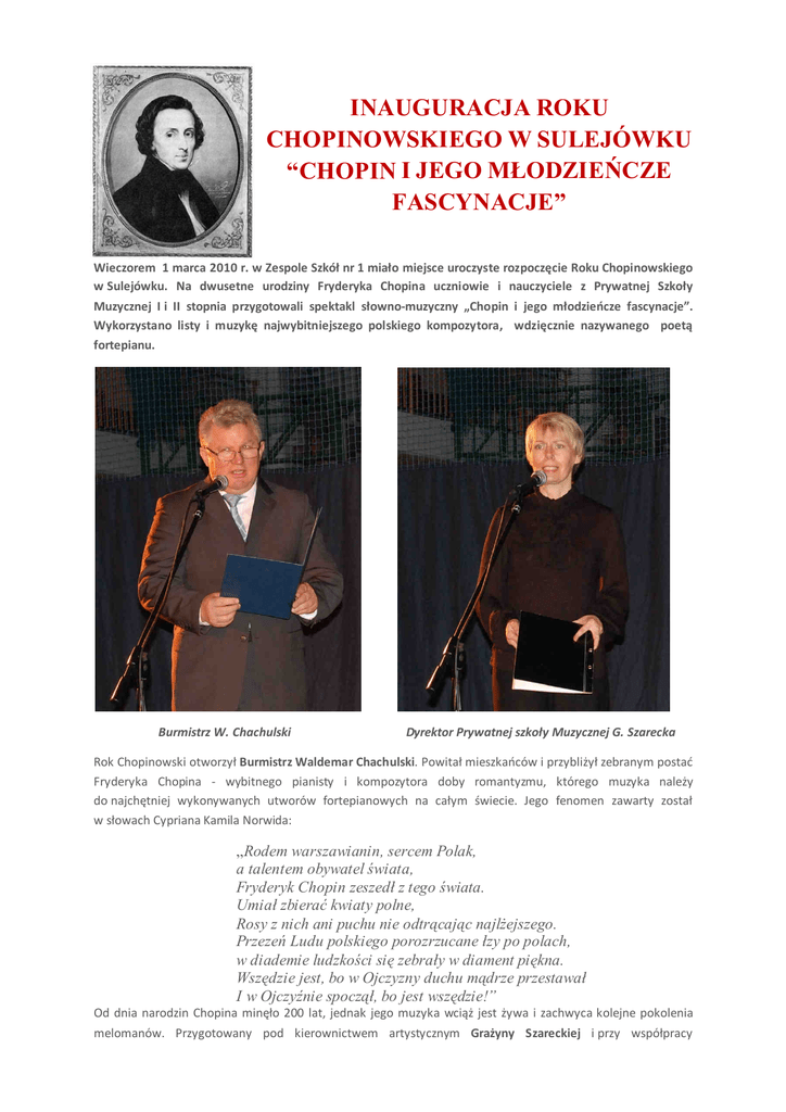 INAUGURACJA ROKU CHOPINOWSKIEGO W SULEJÓWKU “CHOPIN I JEGO MŁODZIEŃCZE FASCYNACJE” Wieczorem 1 marca 2010 r. w Zespole Szkół nr 1 miało miejsce uroczyste rozpoczęcie Roku Chopinowskiego w Sulejówku. Na dwusetne urodziny Fryderyka Chopina uczniowie i nauczyciele z Prywatnej Szkoły Muzycznej I i II stopnia przygotowali spektakl słowno-muzyczny „Chopin i jego młodzieńcze fascynacje”. Wykorzystano listy i muzykę najwybitniejszego polskiego kompozytora, wdzięcznie nazywanego poetą fortepianu. Burmistrz W. Chachulski Dyrektor Prywatnej szkoły Muzycznej G. Szarecka Rok Chopinowski otworzył Burmistrz Waldemar Chachulski. Powitał mieszkańców i przybliżył zebranym postać Fryderyka Chopina - wybitnego pianisty i kompozytora doby romantyzmu, którego muzyka należy do najchętniej wykonywanych utworów fortepianowych na całym świecie. Jego fenomen zawarty został w słowach Cypriana Kamila Norwida: „Rodem warszawianin, sercem Polak, a talentem obywatel świata, Fryderyk Chopin zeszedł z tego świata. Umiał zbierać kwiaty polne, Rosy z nich ani puchu nie odtrącając najlŜejszego. Przezeń Ludu polskiego porozrzucane łzy po polach, w diademie ludzkości się zebrały w diament piękna. Wszędzie jest, bo w Ojczyzny duchu mądrze przestawał I w Ojczyźnie spoczął, bo jest wszędzie!” Od dnia narodzin Chopina minęło 200 lat, jednak jego muzyka wciąż jest żywa i zachwyca kolejne pokolenia melomanów. Przygotowany pod kierownictwem artystycznym Grażyny Szareckiej i przy współpracy nauczycieli: Julii Singalewicz-Sobczak, Jacka Nazarczuka i Ewy Sulikowskiej spektakl połączył wspomnienia o kompozytorze zaklęte w listach do najbliższych z przepełnionymi polskością polonezami i mazurkami w wykonaniu młodych wirtuozów. Listy czytali: Antoś Pluta - Fryderyk lata dziecięce, Adam Buczek – dojrzałe lata Chopina, Barbara Krzyżewska – Georg Sand Weronika Lipka – siostry Fryderyka Paweł Tomasz Miazga (nauczyciel harmonii i kompozycji) – ojciec Chopina. Koncertowali: Paweł Sobótka Kamil Zacharczuk Adriana Trybuchowicz-Mojska Ola Chróst Julia Singalewicz-Sobczak (nauczycielka) Czytane z niemałym talentem listy kompozytora były uzupełnieniem muzyki wydobywającej się spod zwinnych palców uderzających w czarno białe klawisze. Melodia wypełniła salę gimnastyczną zamienioną na tę szczególną okazję w przytulną kawiarenkę. Przy filiżance kawy lub herbaty można było wysłuchać utworów Chopina - muzyki, która wymaga od wykonawcy znakomitego warsztatu i wirtuozerii, a w odbiorcach budzi wrażliwość. Wspaniały wieczór poświęcony niezwykłej muzyce Fryderyka Chopina to efekt ciężkiej pracy nauczycieli i uczniów ze szkoły muzycznej oraz gospodarzy - Zespołu szkół nr 1. W imieniu mieszkańców – dziękujemy. Agnieszka Wyrostkiewicz Listy czytali: Antoś Pluta - Fryderyk lata dziecięce, Adam Buczek – dojrzałe lata Chopina, Barbara Krzyżewska – Georg Sand, Weronika Lipka – siostry Fryderyka oraz Paweł Tomasz Miazga (nauczyciel harmonii i kompozycji) – ojciec Chopina. Muzycy przed koncertem - Kamil Zacharczuk, Ola Chróst, Adriana Trybuchowicz-Mojska, Paweł Sobótka Gra - Kamil Zacharczuk - uczeń Prywatnej szkoły Muzycznej im. I.J. Paderewskiego w Sulejówku Koncert Prywatnej szkoły Muzycznej im. I.J. Paderewskiego w Sulejówku- występ Julii Singalewicz-Sobczak Śpiewa Kaja Litwa