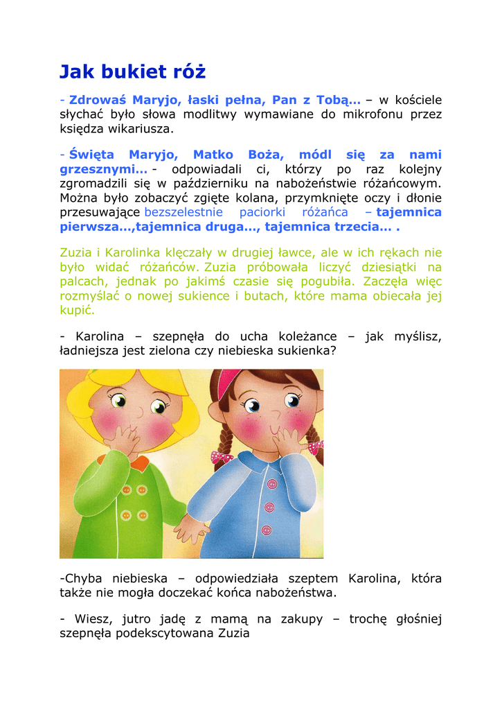 Jak bukiet róż - Zdrowaś Maryjo, łaski pełna, Pan z Tobą… – w kościele słychać było słowa modlitwy wymawiane do mikrofonu przez księdza wikariusza. - Święta Maryjo, Matko Boża, módl się za nami grzesznymi… - odpowiadali ci, którzy po raz kolejny zgromadzili się w październiku na nabożeństwie różańcowym. Można było zobaczyć zgięte kolana, przymknięte oczy i dłonie przesuwające bezszelestnie paciorki różańca – tajemnica pierwsza…,tajemnica druga…, tajemnica trzecia… . Zuzia i Karolinka klęczały w drugiej ławce, ale w ich rękach nie było widać różańców. Zuzia próbowała liczyć dziesiątki na palcach, jednak po jakimś czasie się pogubiła. Zaczęła więc rozmyślać o nowej sukience i butach, które mama obiecała jej kupić. - Karolina – szepnęła do ucha koleżance – jak myślisz, ładniejsza jest zielona czy niebieska sukienka? -Chyba niebieska – odpowiedziała szeptem Karolina, która także nie mogła doczekać końca nabożeństwa. - Wiesz, jutro jadę z mamą na zakupy – trochę głośniej szepnęła podekscytowana Zuzia - Tak? To może mogłabym pojechać z wami? – szept Karoliny także stawał się głośniejszy - No jasne! Mama na pewno się zgodzi! – prawie głośno powiedziała Zuzia i nagle poczuła na swoich ramionach czyjąś dłoń. To ksiądz proboszcz, który przechodził z konfesjonału do zakrystii i usłyszał rozmowę dziewczynek. Nachylił się do ucha Zuzi i szepnął: - Przyjdźcie do zakrystii po nabożeństwie. Będę tam na was czekał. Dziewczynki do końca odmawianego różańca, skruszone, nie odezwały się do siebie ani słowem. Każda z nich myślała o spotkaniu z księdzem proboszczem, które miało nastąpić już za kilka minut. Obawiały się. Miał prawo się na nie zdenerwować, a teraz pewnie będzie na nie krzyczał albo naskarży rodzicom. - Mam dla was prezenty – powiedział ksiądz proboszcz. Jego pogodna mina nie zapowiadała żadnej awantury ani robienia wyrzutów. Sięgnął do kieszeni i wyciągnął dwa kolorowe różańce. - Proszę, to dla uśmiechnął się. was – ksiądz Zuzia i Karolina niepewnie wyciągnęły ręce i wzięły niespodziewane prezenty. - Widziałem, że modliłyście się bez różańców, dlatego pomyślałem, że sprezentuję Wam takie misyjne różańce. Do której klasy chodzicie? - Do drugiej. – odpowiedziały dziewczynki, stojąc ze spuszczonym wzrokiem. - No, to pewnie dostaniecie różańce z okazji pierwszej Komunii Świętej. Ale to nie powód, żeby do tego czasu nie mieć się na czym modlić – ksiądz proboszcz jeszcze raz posłał uśmiech w stronę dziewczynek. – Cieszę się, że przychodzicie na nabożeństwo. Lubicie modlić się różańcem? - Tak, ale czasami nam się nudzi… - odważyła się powiedzieć cicho Zuzia. - Tak, rozumiem… Pewnie chcecie powiedzieć, że kiedy powtarzamy wciąż te same słowa, myśli uciekają w stronę codziennych spraw, problemów i trudno się skupić? Dziewczynki pokiwały głowami i pomyślały, że ksiądz proboszcz rzeczywiście je rozumie. - Pamiętajcie jednak, – ciągnął kapłan - że w powtarzaniu tych samych słów jest głęboki sens. Wszystkie sprawy które cisną się nam do głowy możemy w czasie różańca polecać Matce Bożej, która przecież jest także i naszą Mamą. Papież Jan Paweł II, którego ulubioną modlitwą był właśnie różaniec, mówił, że modląc się w ten sposób, rozmawiamy z Maryją, powierzamy Jej ufnie wszystkie nasze troski i smutki, radości i nadzieje. Ksiądz proboszcz zamyślił się, a dziewczynki nie śmiały się odezwać. Po chwili usłyszały dziwne pytanie: - Kochacie wasze mamusie? - Tak, bardzo. – odpowiedziały bez wahania. - A czy kochacie waszą Mamę, Maryję? - Tak… - Jeśli tak, to przychodźcie na nabożeństwo. Ona na was czeka, na każde wasze „Zdrowaś Maryjo”, które jest jakby różą składaną u Jej stóp. Jeśli chcecie podarowywać Jej całe bukiety, to jak najczęściej odmawiajcie różaniec i noście go zawsze przy sobie. Dziewczynki ściskając mocno w dłoniach podarunek rozpromienione wracały do domu. Spoglądając na kolorowe różańce dziękowały Matce Bożej za wielką dobroć księdza - Całkiem nie potrzebnie tak bałyśmy się proboszcza – z uśmiechem zauważyła Zuzia.
