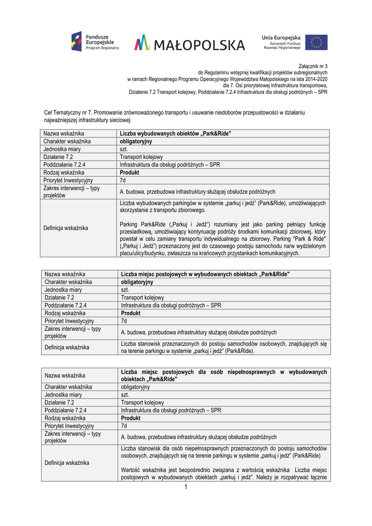 Załącznik nr 3 do Regulaminu wstępnej kwalifikacji projektów subregionalnych w ramach Regionalnego Programu Operacyjnego Województwa Małopolskiego na lata 2014-2020 dla 7. Osi priorytetowej Infrastruktura transportowa, Działanie 7.2 Transport kolejowy, Poddziałanie 7.2.4 Infrastruktura dla obsługi podróżnych – SPR Cel Tematyczny nr 7. Promowanie zrównoważonego transportu i usuwanie niedoborów przepustowości w działaniu najważniejszej infrastruktury sieciowej Nazwa wskaźnika Charakter wskaźnika Jednostka miary Działanie 7.2 Poddziałanie 7.2.4 Rodzaj wskaźnika Priorytet Inwestycyjny Zakres interwencji – typy projektów Liczba wybudowanych obiektów „Park&Ride" obligatoryjny szt. Transport kolejowy Infrastruktura dla obsługi podróżnych – SPR Produkt 7d A. budowa, przebudowa infrastruktury służącej obsłudze podróżnych Liczba wybudowanych parkingów w systemie „parkuj i jedź” (Park&Ride), umożliwiających skorzystanie z transportu zbiorowego. Definicja wskaźnika Nazwa wskaźnika Charakter wskaźnika Jednostka miary Działanie 7.2 Poddziałanie 7.2.4 Rodzaj wskaźnika Priorytet Inwestycyjny Zakres interwencji – typy projektów Definicja wskaźnika Nazwa wskaźnika Charakter wskaźnika Jednostka miary Działanie 7.2 Poddziałanie 7.2.4 Rodzaj wskaźnika Priorytet Inwestycyjny Zakres interwencji – typy projektów Parking Park&Ride („Parkuj i Jedź”) rozumiany jest jako parking pełniący funkcję przesiadkową, umożliwiający kontynuację podróży środkami komunikacji zbiorowej, który powstał w celu zamiany transportu indywidualnego na zbiorowy. Parking "Park & Ride" („Parkuj i Jedź”) przeznaczony jest do czasowego postoju samochodu na/w wydzielonym placu/ulicy/budynku, zwłaszcza na krańcowych przystankach komunikacyjnych. Liczba miejsc postojowych w wybudowanych obiektach „Park&Ride" obligatoryjny szt. Transport kolejowy Infrastruktura dla obsługi podróżnych – SPR Produkt 7d A. budowa, przebudowa infrastruktury służącej obsłudze podróżnych Liczba stanowisk przeznaczonych do postoju samochodów osobowych, znajdujących się na terenie parkingu w systemie „parkuj i jedź” (Park&Ride). Liczba miejsc postojowych dla osób niepełnosprawnych w wybudowanych obiektach „Park&Ride" obligatoryjny szt. Transport kolejowy Infrastruktura dla obsługi podróżnych – SPR Produkt 7d A. budowa, przebudowa infrastruktury służącej obsłudze podróżnych Liczba stanowisk dla osób niepełnosprawnych przeznaczonych do postoju samochodów osobowych, znajdujących się na terenie parkingu w systemie „parkuj i jedź” (Park&Ride) Definicja wskaźnika Wartość wskaźnika jest bezpośrednio związana z wartością wskaźnika Liczba miejsc postojowych w wybudowanych obiektach „parkuj i jedź”. Należy je rozpatrywać łącznie 1 jako odsetek miejsc dla osób niepełnosprawnych w liczbie miejsc ogółem w nowo wybudowanych obiektach „parkuj i jedź”. Nazwa wskaźnika Charakter wskaźnika Jednostka miary Działanie 7.2 Poddziałanie 7.2.4 Rodzaj wskaźnika Priorytet Inwestycyjny Zakres interwencji – typy projektów Definicja wskaźnika Nazwa wskaźnika Charakter wskaźnika Jednostka miary Działanie 7.2 Poddziałanie 7.2.4 Rodzaj wskaźnika Priorytet Inwestycyjny Zakres interwencji – typy projektów Definicja wskaźnika Nazwa wskaźnika Charakter wskaźnika Jednostka miary Działanie 7.2 Poddziałanie 7.2.4 Rodzaj wskaźnika Priorytet Inwestycyjny Zakres interwencji – typy projektów Definicja wskaźnika Liczba wybudowanych obiektów „Bike&Ride” obligatoryjny szt. Transport kolejowy Infrastruktura dla obsługi podróżnych – SPR Produkt 7d A. budowa, przebudowa infrastruktury służącej obsłudze podróżnych Liczba wybudowanych parkingów przeznaczonych umożliwiających skorzystanie z transportu zbiorowego. do pozostawiania rowerów, Liczba stanowisk postojowych w wybudowanych obiektach „Bike&Ride” obligatoryjny szt. Transport kolejowy Infrastruktura dla obsługi podróżnych – SPR Produkt 7d A. budowa, przebudowa infrastruktury służącej obsłudze podróżnych Liczba stanowisk przeznaczonych do przyczepienia ramy roweru, znajdujących się na terenie parkingu przeznaczonego do pozostawiania rowerów. Liczba przebudowanych / odnowionych dworców kolejowych obligatoryjny szt. Transport kolejowy Infrastruktura dla obsługi podróżnych – SPR Produkt 7d A. budowa, przebudowa infrastruktury służącej obsłudze podróżnych Liczba wybudowanych, przebudowanych lub zmodernizowanych obiektów budowlanych (łącznie z przystankami osobowymi/kolejowymi) lub zespołów obiektów budowlanych usytuowanych na obszarze kolejowym do obsługi podróżnych lub usług towarzyszących tej obsłudze, który może również obejmować urządzenia do wykonywania czynności związanych z prowadzeniem ruchu pociągów. W przypadku objęcia interwencją kilku obiektów budowlanych składających się na dworzec, należy zliczyć jako jeden zespół budynków. Podstawa prawna – Def. dworca kolejowego - Ustawa o transporcie kolejowym (Dz.U. 2003 Nr 86 poz. 789 z poz. zm.) z dnia 28 marca 2003 r., art. 4 pkt 2 ustawy. Nazwa wskaźnika Charakter wskaźników Jednostka miary Działanie 7.2 Poddziałanie 7.2.4 Rodzaj wskaźnika Priorytet Inwestycyjny Liczba samochodów korzystających z miejsc postojowych w wybudowanych obiektach „parkuj i jedź” obligatoryjny szt. Transport kolejowy Infrastruktura dla obsługi podróżnych – SPR Rezultat bezpośredni 7d 2 Zakres interwencji – typy projektów A. budowa, przebudowa infrastruktury służącej obsłudze podróżnych Liczba samochodów, które skorzystały z miejsc postojowych na terenie parkingu w systemie „parkuj i jedź” („Park&Ride”) w ciągu pełnego roku od zakończenia realizacji projektu. Definicja wskaźnika Nazwa wskaźnika Charakter wskaźnika Jednostka miary Działanie 7.2 Poddziałanie 7.2.4 Rodzaj wskaźnika Priorytet Inwestycyjny Zakres interwencji 