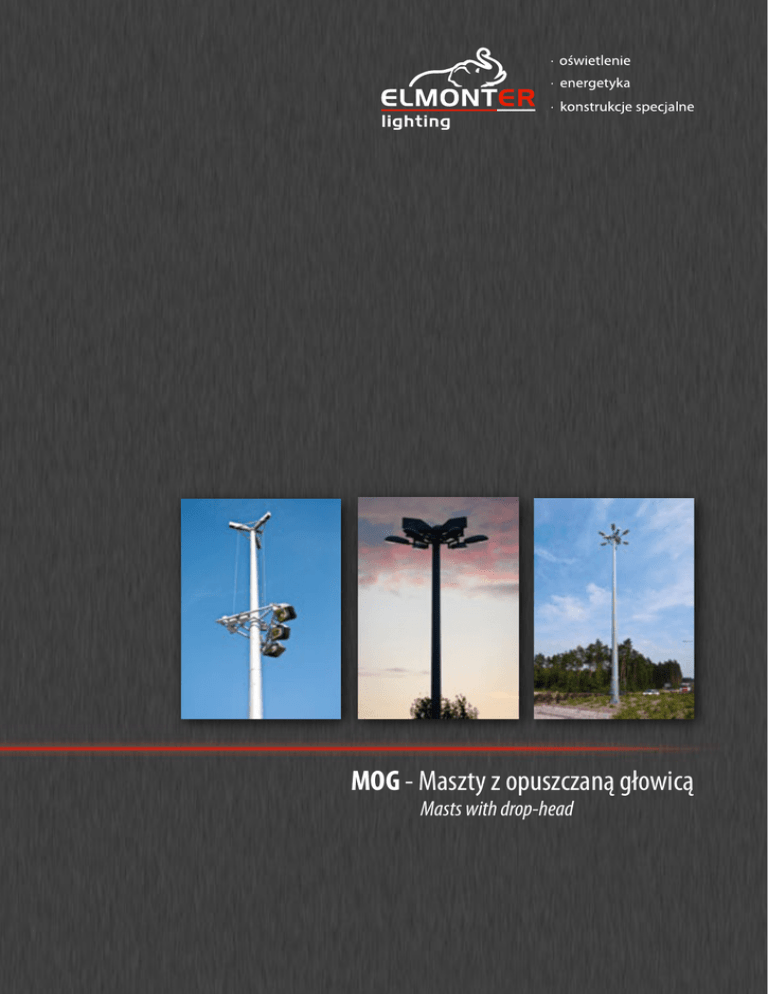 MOG - Maszty z opuszczaną głowicą Masts with drop-head MOG - Maszty z opuszczaną głowicą Masts with drop-head 2 NOWE ROZWIĄZANIE New Solution Z wielką przyjemnością oddajemy w Państwa ręce katalog zawierający maszty oświetleniowe z opuszczaną głowicą MOG. Na kolejnych stronach katalogu znajdziecie Państwo wszelkie informacje na temat naszego systemu, począwszy od doboru masztu do strefy wiatrowej a kończąc na doborze zespołu napędowego. With great pleasure we would like to present you our directory with drop-head lightening masts MOG. The next pages of the directory contain information on our system, from the choice of the mast according to the wind zone to the choice of the power unit. Maszty z opuszczaną głowicą znajdują zastosowanie na terenach o ograniczonym i utrudnionym dostępie, a także w miejscach gdzie niezbędne jest zapewnienie szybkiej i sprawnej obsługi projektorów z poziomu ziemi. The drop-head masts are used in the areas with limited and difficult access and in places, where it is necessary to ensure fast and efficient projector service from the ground. Wszystkie elementy masztów z opuszczaną głowicą produkowane w zakładach firmy Elmonter Oświetlenie w Polsce. All the elements of the drop-head masts are manufactured in the factories Elmonter Oświetlenie in Poland. 3 MOG - Maszty z opuszczaną głowicą Masts with drop-head Strefy wiatrowe Wind zones Celem prawidłowego doboru masztu z opuszczaną głowicą należy uwzględnić: obciążenie wiatrem w zależności od miejsca instalacji masztu, wysokość całkowitą masztu, wymiary, ilość oraz konfigurację zainstalowanych projektorów oświetleniowych na głowicy masztu. Informacje zawarte w tabelach maja charakter orientacyjny i służą do wstępnego doboru systemu MOG. Możliwe jest niesymetryczne ułożenie projektorów, jak również ułożenie projektorów na dwóch poziomach. KOSZALIN OLSZTYN SZCZECIN BYDGOSZCZ GORZÓW WIELKOPOLSKI CIECHANÓW WARSZAWA KONIN ZIELONA GÓRA LESZNO ZAGÓRÓW SIERADZ RADOM LEGNICA Maszty MOG zaprojektowano zgodnie z obowiązującymi normami na terenie Polski. W przypadku chęci zastosowania słupów z poniższego katalogu dla innych warunków lub w innej konfiguracji projektorów niż zawarte w katalogu, prosimy o kontakt z firmą Elmonter Oświetlenie celem zweryfikowania poprawności zastosowania konstrukcji w nowych warunkach pracy. SIEDLCE SKIERNIEWICE KALISZ Opuszczana głowica LUBLIN PIOTRKÓW TRYBUNALSKI JELENIA GÓRA Drop-head KIELCE OPOLE TARNOBRZEG KATOWICE KRAKÓW TARNÓW Opuszczana głowica składa się z dwóch głównych elementów. Nieruchomego elementu głowicy osadzonego na stałe na szczycie masztu za pomocą połączenia kołnierzowego. Ruchomego elementu głowicy opuszczanego za pomocą trzech stalowych lin wzdłuż trzonu masztu. Ruchoma głowica zaczepiona jest do nieruchomej głowicy za pomocą specjalnie zaprojektowanych zaczepów. Dodatkowo w głowicy zainstalowane są styczniki krańcowe zapobiegające przemieszczaniu się głowicy poza ustalony zakres. Podczas konserwacji ruchoma głowica wraz z zainstalowanymi projektorami opiera się na wspornikach dając wygodny dostęp do projektorów z poziomu ziemi. RZESZÓW KROSNO Na terenie Polski wyróżnia się trzy strefy obciążenia wiatrem The drop head consists of two main elements. Stable head element placed permanently on the top of the mast with a flange connection. Movable element of the head dropped with three steel ropes along the mast shaft. Movable head is connected with the stable head with specially designed hooks. The head contains also installed limit contactors that prevent the head from moving out of the set range. During maintenance works the movable head with the installed projectors rests on brackets to enable comfortable access to the projectors from the ground. In Poland we distinguish three zones of wind load Strefa Zone I II III Wysokość n.p.m Elevation AMSL Vk [m/s] qk [Pa] H ≤ 300 m 22 300 H > 300 m 22×[1+0,0006×(H-300)] 300×[1+0,0006×(H-300)]2 H ≤ 300 m 26 420 H ≤ 300 m 22 300 H > 300 m 22×[1+0,0006×(H-300)] 300×[1+0,0006×(H-300)] × [(20000-H) / (20000+H)] Typ projektora Projector type characteristic wind speed (speed in 10 minutes on the height of 10 meters above the ground in the open area) qk - charakterystyczne ciśnienie prędkości wiatru External size L x H [mm x mm] 2 Vk - charakterystyczna prędkość wiatru (dziesięciominutowa prędkość wiatru na wysokości 10 m nad poziomem gruntu w terenie otwartym) Wymiary zewnętrzne L x H characteristic wind pressure In order to choose a proper drop-head mast it is necessary to take into account the following elements: wind load depending on the place of the mast installation, the height of the mast, quantity and the configuration of the installed floodlights on the mast head. The information presented in the tables is indicative and serves the pre-selection of the MOG system. It is possible to arrange the projectors in an asymmetric way and to arrange them on two levels. Maksymalna waga projektora Maximum projector weight [kg] Maksymalna powierzchnia projektora Maximum projector area [m ] 2 Maksymalna powierzchnia Scx L Maximum area Scx [m2] 2000W 700x600 26 0,42 0,25 1000W 620x500 22 0,31 0,20 400W 500x450 20 0,23 0,16 H Powyższa tabela zawiera orientacyjne zestawienie wymiarów, powierzchni i wag dla typowych projektorów oświetleniowych. The above table includes indicative set of size, area and weight for the typical lighting projectors. The MOG masts were designed according to the applicable standards on the territory of Poland. If you want to use the columns from this directory for other conditions or in a different configuration of projectors than specified here, please contact the company Elmonter Oświetlenie in order to verify the proper use of the construction in the new work conditions. 4 5 MOG - Maszty z opuszczaną głowicą Masts with drop-head Maksymalna liczba pro