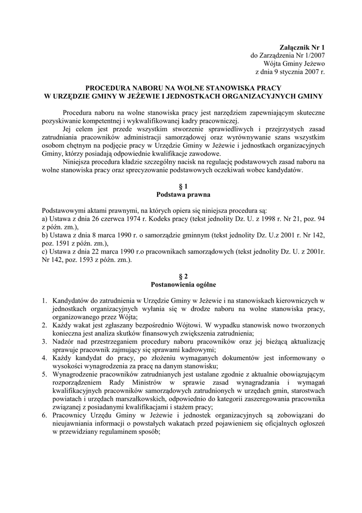 Załącznik Nr 1 do Zarządzenia Nr 1/2007 Wójta Gminy JeŜewo z dnia 9 stycznia 2007 r. PROCEDURA NABORU NA WOLNE STANOWISKA PRACY W URZĘDZIE GMINY W JEśEWIE I JEDNOSTKACH ORGANIZACYJNYCH GMINY Procedura naboru na wolne stanowiska pracy jest narzędziem zapewniającym skuteczne pozyskiwanie kompetentnej i wykwalifikowanej kadry pracowniczej. Jej celem jest przede wszystkim stworzenie sprawiedliwych i przejrzystych zasad zatrudniania pracowników administracji samorządowej oraz wyrównywanie szans wszystkim osobom chętnym na podjęcie pracy w Urzędzie Gminy w JeŜewie i jednostkach organizacyjnych Gminy, którzy posiadają odpowiednie kwalifikacje zawodowe. Niniejsza procedura kładzie szczególny nacisk na regulację podstawowych zasad naboru na wolne stanowiska pracy oraz sprecyzowanie podstawowych oczekiwań wobec kandydatów. §1 Podstawa prawna Podstawowymi aktami prawnymi, na których opiera się niniejsza procedura są: a) Ustawa z dnia 26 czerwca 1974 r. Kodeks pracy (tekst jednolity Dz. U. z 1998 r. Nr 21, poz. 94 z późn. zm.), b) Ustawa z dnia 8 marca 1990 r. o samorządzie gminnym (tekst jednolity Dz. U.z 2001 r. Nr 142, poz. 1591 z późn. zm.), c) Ustawa z dnia 22 marca 1990 r.o pracownikach samorządowych (tekst jednolity Dz. U. z 2001r. Nr 142, poz. 1593 z późn. zm.). §2 Postanowienia ogólne 1. Kandydatów do zatrudnienia w Urzędzie Gminy w JeŜewie i na stanowiskach kierowniczych w jednostkach organizacyjnych wyłania się w drodze naboru na wolne stanowiska pracy, organizowanego przez Wójta; 2. KaŜdy wakat jest zgłaszany bezpośrednio Wójtowi. W wypadku stanowisk nowo tworzonych konieczna jest analiza skutków finansowych zwiększenia zatrudnienia; 3. Nadzór nad przestrzeganiem procedury naboru pracowników oraz jej bieŜącą aktualizację sprawuje pracownik zajmujący się sprawami kadrowymi; 4. KaŜdy kandydat do pracy, po złoŜeniu wymaganych dokumentów jest informowany o wysokości wynagrodzenia za pracę na danym stanowisku; 5. Wynagrodzenie pracowników zatrudnianych jest ustalane zgodnie z aktualnie obowiązującym rozporządzeniem Rady Ministrów w sprawie zasad wynagradzania i wymagań kwalifikacyjnych pracowników samorządowych zatrudnionych w urzędach gmin, starostwach powiatach i urzędach marszałkowskich, odpowiednio do kategorii zaszeregowania pracownika związanej z posiadanymi kwalifikacjami i staŜem pracy; 6. Pracownicy Urzędu Gminy w JeŜewie i jednostek organizacyjnych są zobowiązani do nieujawniania informacji o powstałych wakatach przed pojawieniem się oficjalnych ogłoszeń w przewidziany regulaminem sposób; §3 Wymagania konieczne wobec kandydatów do pracy. 1. Obywatelstwo polskie; 2. Odpowiednie wykształcenie, staŜ pracy i kwalifikacje (zgodnie z aktualnie obowiązującym rozporządzeniem Rady Ministrów w sprawie zasad wynagradzania i wymagań kwalifikacyjnych pracowników samorządowych zatrudnionych w urzędach gmin, starostwach powiatowych i urzędach marszałkowskich); 3. Pełna zdolność do czynności prawnych oraz korzystanie z pełni praw publicznych; 4. Niekaralność za przestępstwa popełnione umyślnie; 5. Stan zdrowa pozwalający na zatrudnienie na określone stanowisko §4 Wymagania formalne wobec kandydatów do pracy 1. Kandydaci do zatrudnienia w Urzędzie Gminy w JeŜewie i na stanowiska kierownicze w jednostkach organizacyjnych składają w sekretariacie bądź przesyłają na adres urzędu pisemne oferty zawierające: a) Ŝyciorys kandydata ( CV ), b) list motywacyjny, c) oświadczenie o korzystaniu w pełni praw publicznych, d) oświadczenie o niekaralności za przestępstwa popełnione umyślnie, e) kopię dokumentów potwierdzających wykształcenie, f) kopię trzech pierwszych stron dowodu osobistego oraz stronę zawierającą informację o zameldowaniu, bądź kopię nowego dowodu osobistego; 2. Oferty pracy na wolne stanowiska przyjmowane są tylko od kandydatów, którzy spełniają wymogi określone w ogłoszeniu. Dokumenty moŜna przesłać listem na adres: Urząd Gminy JeŜewo, ul Świecka 12, 86-131 JeŜewo, (decyduje data wpływu do urzędu) lub złoŜyć osobiście w sekretariacie – pokój nr 15 (I piętro), w podanym w ogłoszeniu terminie; 3. Wszystkie oferty, które są kompletne i spełniają wymagania biorą udział w procesie rekrutacji. §5 Obowiązki pracownika odpowiedzialnego za sprawy kadrowe związane z obsadzaniem wolnych stanowisk Pracownik odpowiedzialny za sprawy kadrowe, gdy pojawi się wakat przygotowuje opis stanowiska pracy zawierający: 1. Cel istnienia stanowiska, 2. Podstawowy zakres obowiązków, 3. Wymagania dotyczące kandydata (wykształcenie, kwalifikacje zawodowe, cechy osobiste, predyspozycje). §6 Rekrutacja 1. Rekrutacja odbywa się na podstawie analizy nadesłanych bądź dostarczonych osobiście dokumentów poszczególnych kandydatów; 2. Czas na składanie ofert nie moŜe być krótsze niŜ 14 dni; 3. Osoby o najwyŜszych kwalifikacjach zostaną zaproszone na rozmowę kwalifikacyjną. Zakres rozmowy kwalifikacyjnej oraz ewentualne sprawdzenie umiejętności kandydatów odbywa się stosownie do wymagań wynikających z opisu stanowiska pracy; 4. Dokumenty aplikacyjne osób, które w procesie rekrutacji zakwalifikowały się do dalszego etapu i zostały umieszczone w protokole, będą przechowywane, zgodnie z instrukcją kancelaryjną przez okres 2 lat, a następnie przekazane do archiwum zakładowego. 5. Dokumenty aplikacyjne osób, które nie zostały zakwalifikowane do zatrudnienia, będzie moŜna odebrać osobiście w terminie 5 dni od daty zakończenie procesu rekrutacji. Nie odebrane dokumenty zostaną komisyjnie zniszczone; 6. Wyniki rekrutacji zostaną podane do publicznej wiadomości poprzez ogłoszenie zamieszczone na tablicy informacyjnej Urzędzie Gminy w JeŜewie i BIP w terminie 14 dni od dnia zatrudnienia wybranego kandydata lub zakończenia procedury naboru, w przypadku, gdy w jego wyniku nie doszło do zatrudnienia Ŝadnego kandy