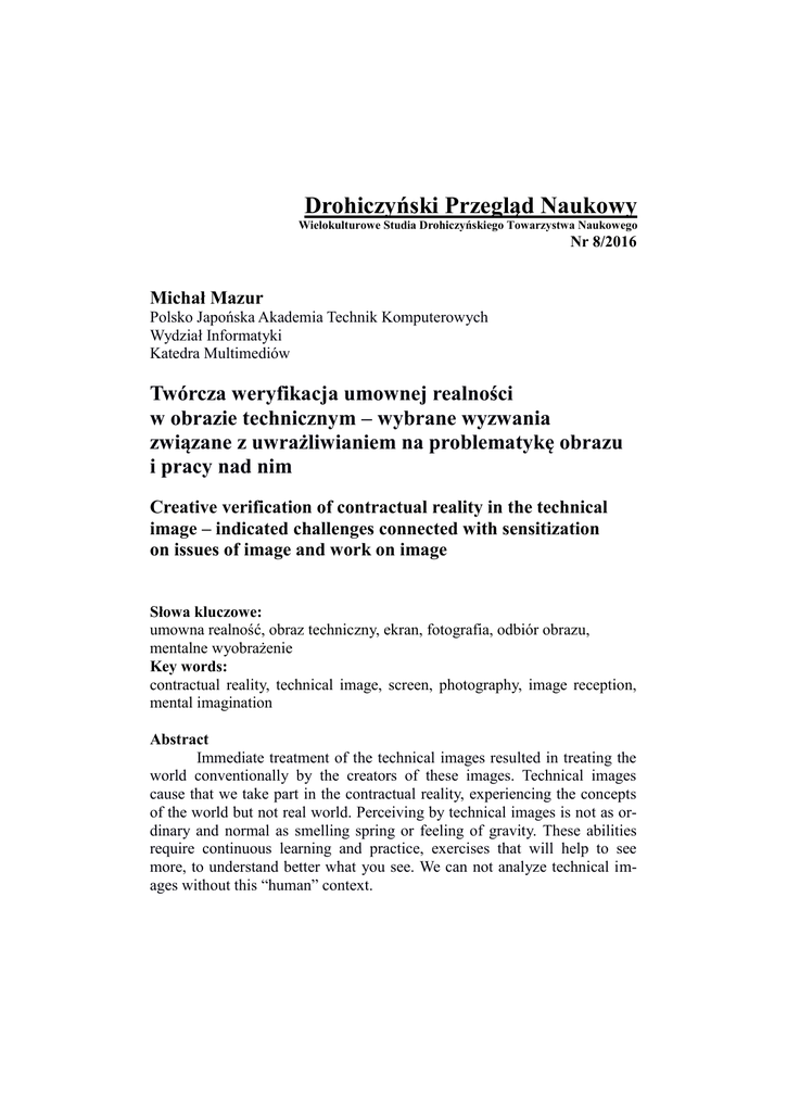 Drohiczyński Przegląd Naukowy Wielokulturowe Studia Drohiczyńskiego Towarzystwa Naukowego Nr 8/2016 Michał Mazur Polsko Japońska Akademia Technik Komputerowych Wydział Informatyki Katedra Multimediów Twórcza weryfikacja umownej realności w obrazie technicznym – wybrane wyzwania związane z uwrażliwianiem na problematykę obrazu i pracy nad nim Creative verification of contractual reality in the technical image – indicated challenges connected with sensitization on issues of image and work on image Słowa kluczowe: umowna realność, obraz techniczny, ekran, fotografia, odbiór obrazu, mentalne wyobrażenie Key words: contractual reality, technical image, screen, photography, image reception, mental imagination Abstract Immediate treatment of the technical images resulted in treating the world conventionally by the creators of these images. Technical images cause that we take part in the contractual reality, experiencing the concepts of the world but not real world. Perceiving by technical images is not as ordinary and normal as smelling spring or feeling of gravity. These abilities require continuous learning and practice, exercises that will help to see more, to understand better what you see. We can not analyze technical images without this “human” context. 472 Michał Mazur Chciałbym przybliżyć wybrane zagadnienia związane z doświadczaniem realności, a w zasadzie iluzji realności w obrazach tworzonych dzisiaj przy użyciu współczesnych narzędzi i technologii np. informatycznych. Piszę z perspektywy dydaktyka, który próbuje w przestrzeni twórczości dać młodym adeptom sztuk mediów jakieś drogowskazy, podpowiedzi. Wynalezienie i wprowadzenie w obieg kulturowy obrazu technicznego w XIX wieku spowodowało, że fotografia, film ze względu na swoją bezpośredniość, mechaniczność, wydawały się przybliżyć doznawanie świata poprzez obraz. Częstą praktyką stało się dosłowne traktowanie tego co przedstawiają mechaniczne obrazy, na tym samym niejako poziomie bezpośredniości co kontakt ze światem. Sęk w tym, że przyglądanie się światu bezpośrednio jest odmiennym doświadczeniem od uczestnictwa w obrazie świata. Życie, dzianie się spraw, które obserwujemy w świecie są zjawiskami poprzez które możemy doświadczać świata, obecności w nim. Zaś życie, które obserwujemy na obrazie, ekranie jest efektem sprzężenia zwrotnego, projekcji naszej świadomości, na płaszczyznę i polega na odnajdowaniu we wzorzystości, wielobarwności płaszczyzny znaczeń (komunikatów). Gdy na płaszczyźnie widzimy tylko ziarno, szum, rozmyte piksele, białe światło jesteśmy przekonani, ze tam nic nie ma, bo nie możemy dostrzec żadnego znaczenia, sensu. Nie oznacza to, że tam nic nie ma. Nie ma tylko czegoś co by nam się mogło przydać. Co mogłoby mieć znaczenie. Jak widać obrazy techniczne powodują, że uczestniczymy w umownej realności opartej na przeżywaniu sensów, a nie na doświadczaniu wykadrowanych, transmitowanych fragmentów świata. Sprawczość obrazów Obrazy techniczne (fotografie, ujęcia z filmu) zachowują się jakby były żywe. Umieszczone w sąsiedztwie (czasowym) „nakręcają się”, „kleją się do siebie”, zachowują się tak jakby były zdeterminowane, posiadały jakąś przyczynę, były skutkiem czegoś, budując relacje, nowe sensy tworząc w ten sposób swój niezależny świat obrazów w którym możemy się zanurzyć. Ale to nie w obrazach technicznych należy szukać tej dziwnej sprawczości tylko w przyzwoleniu, przychylności tego, który na nie patrzy. W jaki jeszcze inny sposób obrazy techniczne mogą być inspirowane przez umysł patrzącego? Aby odpowiedzieć na to pytanie, wróćmy i przyjrzyjmy się temu zastanawiającemu determinizmowi obrazów technicznych. Normalnie przed- Twórcza weryfikacja umownej realności w obrazie technicznym… 473 mioty które jesteśmy w stanie zobaczyć czy dotknąć są względem siebie w pewnych silnych relacjach typowych dla materialnego świata, np. jabłko leży na stole, stół jest podstawą dla jabłka, dzięki temu jabłko nie spada na podłogę, itd. Obrazy zaś odwołują się do mentalnych wyobrażeń. W świecie mentalnym wyobrażone przedmioty mogą pozostawać we wzajemnych relacjach ale nie możemy oczekiwać aby te relacje miały charakter silnych relacji, w umyśle człowieka fakty są połączone siecią wyuczonych zależności o charakterze logicznym, zależnościowym tak jak fakt, że po jedynce jest dwójka, po dwójce trójka, itd. Istnieją też połączenia fantastyczne, fantazyjne, głupie, nieoczekiwane, którym oddaje się umysł człowieka. Ludzkie skłonności, powodują, że podczas refleksji pewne fakty (obrazy w głowie) łączymy ze sobą, a innych wolelibyśmy nie widzieć razem albo nie chce nam się ich widzieć. Obrazy techniczne, wydają się wychodzić na przeciw tym przyzwyczajeniom, przekonaniom, obawom. Nie można więc analizować obrazów technicznych, bez tego „ludzkiego” kontekstu. Jaki wpływ może mieć przedstawiony kontekst w badaniu nad umowną realnością? Wydaje mi się, że odbieranie realności przy pomocy obrazów technicznych nie jest procesem tak zwykłym jak czucie zapachów, odczuwanie grawitacji. Wymaga ciągłego uczenia się i praktyki. Ćwiczeń które pozwolą widzieć więcej, rozumieć co się widzi, ćwiczeń, których możemy unikać np. z powodu lenistwa intelektualnego. Exodus pracy twórczej w świat z powodu obrazów technicznych Mówimy tutaj o meta powodzie – obrazy są zdeterminowane tym, że zostały uczynione z jakiegoś konkretnego powodu. Z tej perspektywy są traktowane jako komunikaty, jako dzieło sztuki, jako rozrywka, itp. Warto się zastanowić jaki był w ogóle powód wynalezienia obrazów technicznych? V. Flusser uważał, że obrazy techniczne pojawiły się pod koniec ery słowa, historii by dowartościować teksty, odhermetyzować je, napełnić je ponow