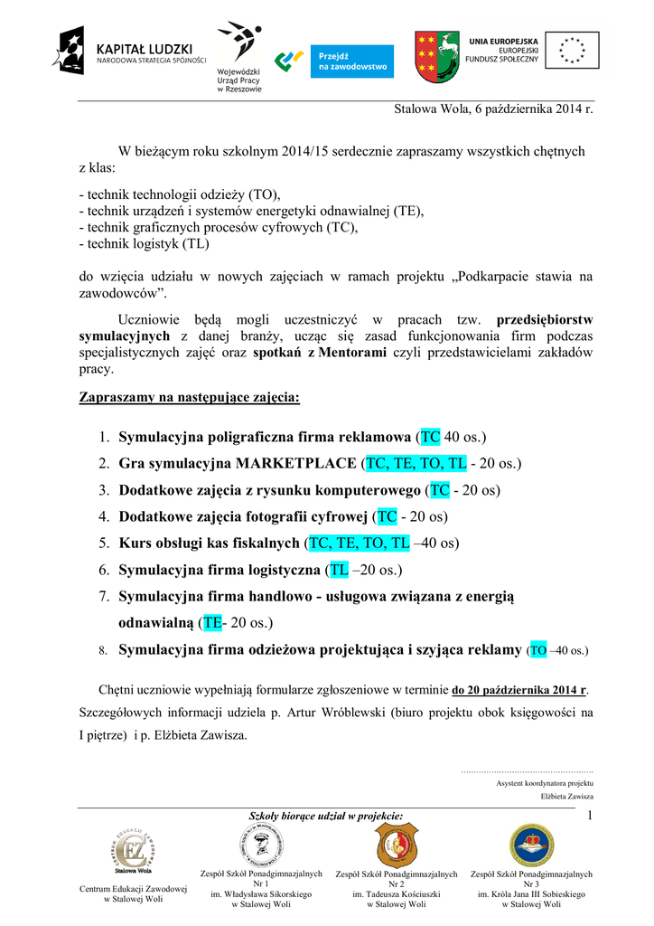 Stalowa Wola, 6 października 2014 r. W bieżącym roku szkolnym 2014/15 serdecznie zapraszamy wszystkich chętnych z klas: - technik technologii odzieży (TO), - technik urządzeń i systemów energetyki odnawialnej (TE), - technik graficznych procesów cyfrowych (TC), - technik logistyk (TL) do wzięcia udziału w nowych zajęciach w ramach projektu „Podkarpacie stawia na zawodowców”. Uczniowie będą mogli uczestniczyć w pracach tzw. przedsiębiorstw symulacyjnych z danej branży, ucząc się zasad funkcjonowania firm podczas specjalistycznych zajęć oraz spotkań z Mentorami czyli przedstawicielami zakładów pracy. Zapraszamy na następujące zajęcia: 1. Symulacyjna poligraficzna firma reklamowa (TC 40 os.) 2. Gra symulacyjna MARKETPLACE (TC, TE, TO, TL - 20 os.) 3. Dodatkowe zajęcia z rysunku komputerowego (TC - 20 os) 4. Dodatkowe zajęcia fotografii cyfrowej (TC - 20 os) 5. Kurs obsługi kas fiskalnych (TC, TE, TO, TL –40 os) 6. Symulacyjna firma logistyczna (TL –20 os.) 7. Symulacyjna firma handlowo - usługowa związana z energią odnawialną (TE- 20 os.) 8. Symulacyjna firma odzieżowa projektująca i szyjąca reklamy (TO –40 os.) Chętni uczniowie wypełniają formularze zgłoszeniowe w terminie do 20 października 2014 r. Szczegółowych informacji udziela p. Artur Wróblewski (biuro projektu obok księgowości na I piętrze) i p. Elżbieta Zawisza. ……………………………………………. Asystent koordynatora projektu Elżbieta Zawisza Szkoły biorące udział w projekcie: Centrum Edukacji Zawodowej w Stalowej Woli Zespół Szkół Ponadgimnazjalnych Nr 1 im. Władysława Sikorskiego w Stalowej Woli Zespół Szkół Ponadgimnazjalnych Nr 2 im. Tadeusza Kościuszki w Stalowej Woli 1 Zespół Szkół Ponadgimnazjalnych Nr 3 im. Króla Jana III Sobieskiego w Stalowej Woli