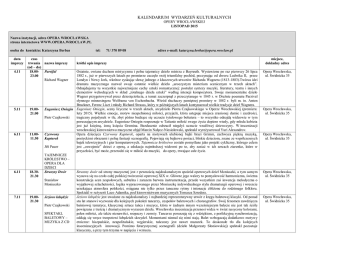 KALENDARIUM WYDARZEŃ KULTURALNYCH OPERY WROCŁAWSKIEJ LISTOPAD 2015 Nazwa instytucji, adres OPERA WROCŁAWSKA strona internetowa WWW.OPERA.WROCLAW.PL osoba do kontaktu: Katarzyna Berbas data imprezy 4.11 czas trwania nazwa imprezy (od – do) 18.00Parsifal 23.00 Richard Wagner 5.11 19.0021.00 6.11 11.0011.50 6.11 18.3021.30 7.11 19.0021.30 tel: 71/ 370 89 08 adres e-mail: [email protected] krótki opis imprezy Ostatnie, owiane duchem mistycyzmu i pełne tajemnicy dzieło mistrza z Bayreuth. Wystawione po raz pierwszy 26 lipca 1882 r., już w pierwszych latach po premierze zaczęło swój triumfalny pochód, poczynając od dworu Ludwika II, przez Londyn i Nowy Jork, wkrótce zyskując sławę jednego z kluczowych utworów Richarda Wagnera (1813-1883).Twórca idei dramatu muzycznego nazwał swoje ostatnie wielkie dzieło „uroczystym misterium scenicznym w trzech aktach”. Odnajdujemy tu wszystkie najważniejsze cechy sztuki romantycznej: postulat syntezy muzyki, literatury, teatru i innych elementów wchodzących w skład „totalnego dzieła sztuki” według intencji kompozytora. Swoje monumentalne dzieło Wagner przygotowywał przez dziesięciolecia, a temat zaczerpnął z przeczytanego w 1845 r. w Dreźnie poematu Parzival słynnego minnesingera Wolframa von Eschenbacha. Wśród słuchaczy pamiętnej premiery w 1882 r. byli m. in. Anton Bruckner, Ferenc Liszt i młody Richard Strauss, który w późniejszych latach kontynuował wielkie tradycje dzieł Wagnera. Eugeniusz Oniegin Eugeniusz Oniegin, sceny liryczne w trzech aktach, arcydzieło Piotra Czajkowskiego w Operze Wrocławskiej (premiera: luty 2015). Wielkie emocje, motyw niespełnionej miłości, przyjaźń, która ustępuje miejsca zranionej dumie i zazdrości, Piotr Czajkowski tragiczny pojedynek w tle, zbyt późno budzące się uczucie tytułowego bohatera – to wszystko odnajdą widzowie w tym poruszającym arcydziele. Eugeniusz Oniegin rozpoznaje w Tatianie miłość swego życia dopiero wtedy, gdy młoda kobieta jest już księżną, żoną księcia Gremina. Bezdusznie odrzucił niegdyś uczucie wrażliwej dziewczyny. W inscenizacji wrocławskiej kierownictwo muzyczne objął Marcin Nałęcz-Niesiołowski, spektakl wyreżyserował Yuri Alexandrov. Opera dziecięca Czerwony Kapturek, oparta na motywach ulubionej bajki braci Grimm, zachwyca piękną muzyką, Czerwony poetyckimi obrazami i pełną fantazji scenografią. Pojawiają się bajkowe postaci, bliskie dzieciom, znane ze współczesnych Kapturek bajek telewizyjnych i gier komputerowych. Tajemnicze królestwo zostało pomyślane jako projekt cykliczny, którego celem Jiří Pauer jest „oswojenie” dzieci z operą, a edukacja najmłodszej widowni po to, aby zasiać w ich sercach ziarenko, które w przyszłości, być może, przerodzi się w miłość do muzyki, do opery, trwające całe życie. TAJEMNICZE KRÓLESTWO – OPERA DLA DZIECI Straszny dwór od strony muzycznej jest z pewnością najdoskonalszym spośród operowych dzieł Moniuszki, a tym samym Straszny Dwór wysuwa się na czoło całej polskiej twórczości operowej XIX w. Główne jego walory to pomysłowość harmoniczna, świetna Stanisław konstrukcja scen zespołowych, subtelna i zarazem barwna instrumentacja, przede wszystkim zaś inwencja melodyczna o Moniuszko wyjątkowej szlachetności, logika wypracowanego przez Moniuszkę indywidualnego stylu dramaturgii operowej i wreszcie urzekająca atmosfera polskości, osiągana nie tylko przez taneczne rytmy i intonacje zbliżone do rodzimego folkloru. Spektakl w reżyserii Laco Adamika, pod kierownictwem muzycznych Tomasza Szredera. Jezioro łabędzie jest uważane za najdoskonalszy i najbardziej reprezentatywny utwór z kręgu baletowej klasyki. Od ponad Jezioro łabędzie stu lat stanowi wyzwanie dla kolejnych pokoleń tancerzy, zespołów baletowych i choreografów. Swój fenomen zawdzięcza Piotr Czajkowski baśniowej tematyce, klasycznej sztuce tańca i muzyce, która w żadnym innym wcześniejszym balecie nie jest tak ściśle powiązana z treścią i dramatycznym wyrazem dzieła. Wrocławska inscenizacja przenosi widza w świat nasycony kolorami, SPEKTAKL pełen miłości, ale także nienawiści, rozpaczy i zemsty. Tancerze poruszają się z wdziękiem, z perfekcyjną synchronizacją, BALETOWY – oddają się wręcz trzepotowi łabędzich skrzydeł. Momentami niemal się nimi stają. Balet wzbogacają dodatkowo motywy MUZYKA Z CD etniczne: hiszpańskie, neapolitańskie, węgierskie, tańczony jest nawet mazurek. To doskonałe tło dla kolejnych inscenizacyjnych innowacji. Pomimo futurystycznej scenografii (dzieło Małgorzaty Słoniowskiej) spektakl pozostaje klasyczny, a przy tym trzyma w napięciu i wzrusza. miejsce, dokładny adres Opera Wrocławska, ul. Świdnicka 35 Opera Wrocławska, ul. Świdnicka 35 Opera Wrocławska, ul. Świdnicka 35 Opera Wrocławska, ul. Świdnicka 35 Opera Wrocławska, ul. Świdnicka 35 KALENDARIUM WYDARZEŃ KULTURALNYCH OPERY WROCŁAWSKIEJ LISTOPAD 2015 8.11 17.0019.00 Raj utracony Krzysztof Penderecki 12.11 19.0022.00 Rycerskość wieśniacza/Pajace Pietro Mascagni/Ruggero Leoncavallo 13.11 19.0021.20 Kwartet Ronald Harwood 14.11 19.0022.00 Traviata Giuseppe Verdi 15.11 17.0020.00 Wesele Figara Wolfgang Amadeus Mozart 17.11 19.0021.00 Córka źle strzeżona Louis Joseph Ferdinand Harold 18.11 11.0013.40 SPEKTAKL BALETOWY – MUZYKA Z CD Falstaff – Wesołe Kumoszki z Windsoru Giuseppe Verdi Opera Krzysztofa Pendereckiego, czołowego polskiego kompozytora naszych czasów, obchodzącego niedawno 75. urodziny. Przejmujące, trzymające w napięciu współczesne widowisko, które jest muzyczną interpretacją biblijnej historii. Sam kompozytor uznał wrocławską inscenizację autorstwa Waldemara Zawodzińskiego za najlepszą ze wszystkich dotychczasowych. Reżyser nie przedstawił na scenie monumentalnej wizji raju. Akcja rozgrywa się w umownych, prostych dekoracjach. Barw dodają natomiast wyrafinowane kostium