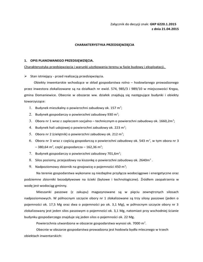 Załącznik do decyzji znak: GKP 6220.1.2015 z dnia 21.04.2015 CHARAKTERYSTYKA PRZEDSIĘWZIĘCIA 1. OPIS PLANOWANEGO PRZEDSIĘWZIĘCIA. Charakterystyka przedsięwzięcia i warunki użytkowania terenu w fazie budowy i eksploatacji. Stan istniejący - przed realizacją przedsięwzięcia. Obiekty inwentarskie wchodzące w skład gospodarstwa rolno – hodowlanego prowadzonego przez inwestora zlokalizowane są na działkach nr ewid. 574, 985/3 i 989/10 w miejscowości Krępa, gmina Domaniewice. Obecnie w obszarze ww. działek znajdują się następujące budynki i obiekty towarzyszące: 1. Budynek mieszkalny o powierzchni zabudowy ok. 157 m2; 2. Budynek gospodarczy o powierzchni zabudowy 930 m 2; 3. Obora nr 1 wraz z zapleczem socjalno – technicznym o powierzchni zabudowy ok. 1660,2m 2; 4. Budynek hali udojowej o powierzchni zabudowy ok. 223 m 2; 5. Obora nr 2 (cielętnik) o powierzchni zabudowy ok. 212 m 2; 6. Obora nr 3 wraz z częścią gospodarczą o powierzchni zabudowy ok. 543 m 2, w tym obora nr 3 – 380,64 m2, część gospodarcza – 162,36 m2; 7. Budynek gospodarczy o powierzchni zabudowy 701,6m 2; 8. Silos poziomy, przejazdowy na kiszonkę o powierzchni zabudowy ok. 2640m 2 . 9. Nadpoziomowy zbiornik na gnojowicę o pojemności 450 m 3; Na terenie gospodarstwa wykonane są niezbędne przyłącza wodociągowe i energetyczne oraz podziemne zbiorniki bezodpływowe na ścieki (bytowe i technologiczne). Źródłem zaopatrzenia w wodę jest wodociąg gminny. Mieszanki paszowe (z zakupu) magazynowane są w pięciu zewnętrznych silosach nadpoziomowych. W północnym szczycie obory nr 1 zlokalizowane są trzy silosy paszowe (jeden o pojemności ok. 17,5 Mg oraz dwa o pojemności po ok. 3,1 Mg), w północnym szczycie obory nr 3 zlokalizowany jest jeden silos paszowym o pojemności ok. 3,1 Mg, natomiast przy wschodniej ścianie budynku gospodarczego znajduje się jeden silos o pojemności ok. 22 Mg. Powierzchnia utwardzona w obszarze gospodarstwa wynosi ok. 7000 m 2. Obecnie w obszarze gospodarstwa prowadzona jest hodowla bydła mlecznego w trzech obiektach inwentarskich: Obora nr 1 jest to obiekt jednokondygnacyjny, przejazdowy, wykonany w technologii tradycyjnej, murowanej, z dwuspadowym dachem. W południowo-wschodniej części budynku znajduje się dwukondygnacyjne zaplecze socjalno – techniczne, ogrzewane za pomocą kotła o mocy ok. 20 kW, opalanego węglem kamiennym (ekogroszkiem). Ścieki bytowe z zaplecza socjalno-sanitarnego odprowadzane są do szczelnego zbiornika bezodpływowego o pojemności ok. 3m 3, który zlokalizowany jest w południowym szczycie obory. Przez całą długość budynku przebiega korytarz paszowy, po bokach którego znajdują się kojce dla zwierząt. W oborze nr 1 utrzymywane jest bydło – maksymalnie 120 DJP. Gnojowica gromadzona jest w żelbetowych zbiornikach znajdujących się pod podłogą budynku o łącznej pojemności ok. 1052 m 3. Obora nr 1 wentylowana jest grawitacyjnie. Nawiew powietrza odbywa się głównie otworami zlokalizowanymi pomiędzy ścianą osłonową a poszyciem dachu, zaś wywiew kanałem wyciągowym wzdłuż kalenicy dachu stanowiącym jednocześnie doświetlenie obory (świetlik). W oborze zainstalowane są 3 mieszacze powietrza, które w okresie wysokich temperatur zewnętrznych zapewniają ruch świeżego powietrza wokół zwierząt oraz stabilizują mikroklimat wewnątrz obiektu. Obora nr 1 nie jest ogrzewana. Budynek wyposażony jest w instalację wodociągową i elektryczną. W północnym szczycie budynku zlokalizowane są 3 nadpoziomowe zbiorniki na mieszanki paszowe (z zakupu) o pojemności ok.: 17,5 Mg, 3,1 Mg i 3,1 Mg. Do południowej części wschodniej ściany obory nr 1 dobudowany jest budynek hali udojowej. W budynku znajduje się dojarnia karuzelowa DeLaval na 22 stanowiska umieszczone na ruchomej platformie z komputerowym zarządzaniem stada oraz zbiornik schładzający do mleka o pojemności ok. 8 m3. Obora nr 2 jest to obiekt jednokondygnacyjny, z poddaszem użytkowym, wykonany w technologii tradycyjnej, murowanej, z dwuspadowym dachem. W budynku utrzymywane są cielęta na ściółce głębokiej. Maksymalna obsada w budynku wynosi 70 stanowisk dla cieląt do pół roku (10,5 DJP). Obora nr 2 wentylowana jest grawitacyjnie. Nawiew powietrza odbywa się głównie otworami zlokalizowanymi pomiędzy ścianą osłonową a poszyciem dachu, zaś wywiew za pośrednictwem dwóch wywietrzaków dachowych, zadaszonych. Budynek nie jest ogrzewany. Budynek wyposażony jest w instalację wodociągową i elektryczną. Obora nr 3 jest to obiekt jednokondygnacyjny, wykonany w technologii tradycyjnej, murowanej z dwuspadowym dachem. W osi budynku znajduje się korytarz paszowym, po bokach którego rozmieszczono kojce dla zwierząt. W oborze nr 3 utrzymywane są jałówki w systemie bezuwięziowym, bezściółkowym (na rusztach z matami legowiskowymi). Maksymalna obsada w budynku wynosi 45 stanowisk dla jałówek od pół roku do jednego roku (13,5 DJP) oraz 45 stanowisk dla jałówek powyżej jednego roku (36 DJP). Gnojowica gromadzona jest w żelbetowych zbiornikach pod podłogą budynku o łącznej pojemności ok. 400 m3. Obora nr 3 wentylowana jest grawitacyjnie. Nawiew powietrza odbywa się głównie otworami zlokalizowanymi pomiędzy ścianą osłonową a poszyciem dachu, zaś wywiew kanałem wyciągowym wzdłuż kalenicy dachu stanowiącym jednocześnie doświetlenie obory (świetlik). Obora nr 3 nie jest ogrzewana. Budynek wyposażony jest w instalację wodociągową i elektryczną. W południowej części budynku znajduję się część gospodarcza. W północnym szczycie budynku zlokalizowany jest nadpoziomowy zbiornik na mieszanki paszowe (z zakupu) o pojemności ok. 3,1 Mg. Nadmiar gnojowicy ze zbiorników żelbetowych znajdujących się pod oborą nr 1 przepompowywany jest do nadpoziomowego zbiornika żelbetowego o średnicy 12m, wysokości 2,0 m npt. i pojemności 450 m3. Kiszonki na potrzeby gospodarstwa wytwa