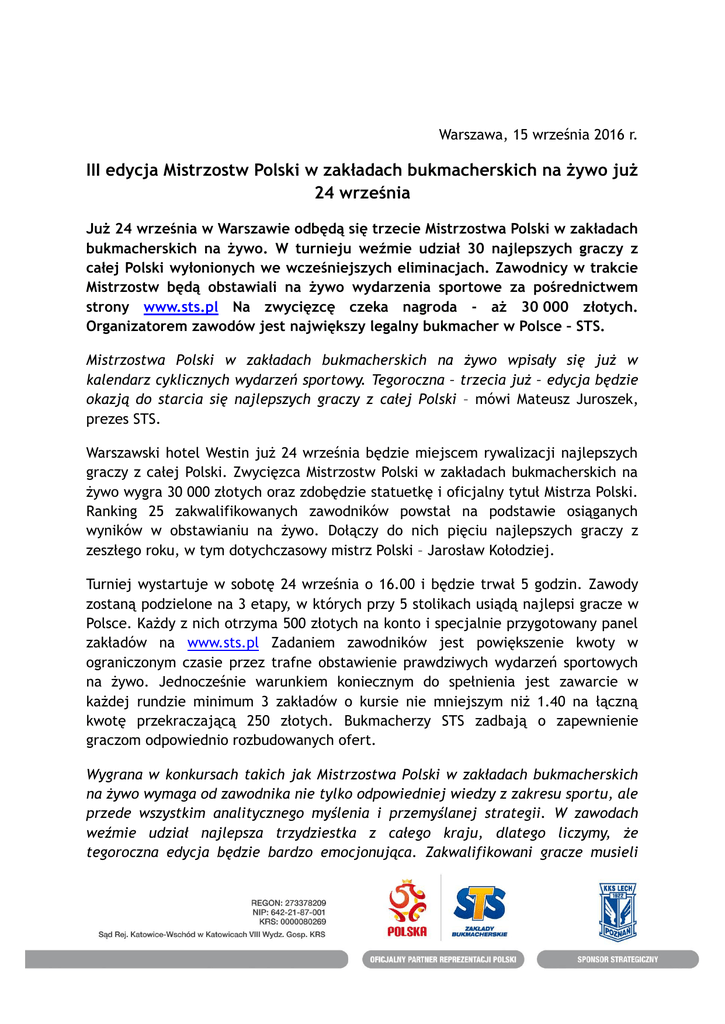 Warszawa, 15 września 2016 r. III edycja Mistrzostw Polski w zakładach bukmacherskich na żywo już 24 września Już 24 września w Warszawie odbędą się trzecie Mistrzostwa Polski w zakładach bukmacherskich na żywo. W turnieju weźmie udział 30 najlepszych graczy z całej Polski wyłonionych we wcześniejszych eliminacjach. Zawodnicy w trakcie Mistrzostw będą obstawiali na żywo wydarzenia sportowe za pośrednictwem strony www.sts.pl Na zwycięzcę czeka nagroda - aż 30 000 złotych. Organizatorem zawodów jest największy legalny bukmacher w Polsce – STS. Mistrzostwa Polski w zakładach bukmacherskich na żywo wpisały się już w kalendarz cyklicznych wydarzeń sportowy. Tegoroczna – trzecia już – edycja będzie okazją do starcia się najlepszych graczy z całej Polski – mówi Mateusz Juroszek, prezes STS. Warszawski hotel Westin już 24 września będzie miejscem rywalizacji najlepszych graczy z całej Polski. Zwycięzca Mistrzostw Polski w zakładach bukmacherskich na żywo wygra 30 000 złotych oraz zdobędzie statuetkę i oficjalny tytuł Mistrza Polski. Ranking 25 zakwalifikowanych zawodników powstał na podstawie osiąganych wyników w obstawianiu na żywo. Dołączy do nich pięciu najlepszych graczy z zeszłego roku, w tym dotychczasowy mistrz Polski – Jarosław Kołodziej. Turniej wystartuje w sobotę 24 września o 16.00 i będzie trwał 5 godzin. Zawody zostaną podzielone na 3 etapy, w których przy 5 stolikach usiądą najlepsi gracze w Polsce. Każdy z nich otrzyma 500 złotych na konto i specjalnie przygotowany panel zakładów na www.sts.pl Zadaniem zawodników jest powiększenie kwoty w ograniczonym czasie przez trafne obstawienie prawdziwych wydarzeń sportowych na żywo. Jednocześnie warunkiem koniecznym do spełnienia jest zawarcie w każdej rundzie minimum 3 zakładów o kursie nie mniejszym niż 1.40 na łączną kwotę przekraczającą 250 złotych. Bukmacherzy STS zadbają o zapewnienie graczom odpowiednio rozbudowanych ofert. Wygrana w konkursach takich jak Mistrzostwa Polski w zakładach bukmacherskich na żywo wymaga od zawodnika nie tylko odpowiedniej wiedzy z zakresu sportu, ale przede wszystkim analitycznego myślenia i przemyślanej strategii. W zawodach weźmie udział najlepsza trzydziestka z całego kraju, dlatego liczymy, że tegoroczna edycja będzie bardzo emocjonująca. Zakwalifikowani gracze musieli przecież wykazać się dużą mądrością i sprytem w trakcie eliminacji – podsumowuje Mateusz Juroszek. Film z zeszłorocznej, drugiej edycji Mistrzostw Polski w obstawianiu na żywo: https://www.youtube.com/watch?v=XL4BRp8AfEc ** Dodatkowych informacji udzielają: E-mail: [email protected] Paweł Rabantek Doradca Zarządu ds. PR Tel. (+48) 603 870 044 Łukasz Borkowski Starszy Specjalista ds. PR Tel. (+48) 519 871 423