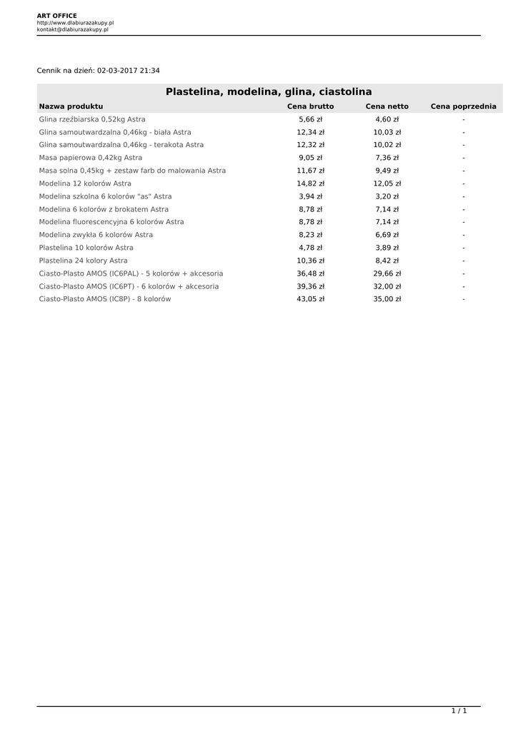 ART OFFICE http://www.dlabiurazakupy.pl [email protected] Cennik na dzień: 02-03-2017 21:34 Plastelina, modelina, glina, ciastolina Nazwa produktu Glina rzeźbiarska 0,52kg Astra Cena brutto Cena netto Cena poprzednia 5,66 zł 4,60 zł - Glina samoutwardzalna 0,46kg - biała Astra 12,34 zł 10,03 zł - Glina samoutwardzalna 0,46kg - terakota Astra 12,32 zł 10,02 zł - Masa papierowa 0,42kg Astra 9,05 zł 7,36 zł - Masa solna 0,45kg + zestaw farb do malowania Astra 11,67 zł 9,49 zł - Modelina 12 kolorów Astra 14,82 zł 12,05 zł - Modelina szkolna 6 kolorów "as" Astra 3,94 zł 3,20 zł - Modelina 6 kolorów z brokatem Astra 8,78 zł 7,14 zł - Modelina fluorescencyjna 6 kolorów Astra 8,78 zł 7,14 zł - Modelina zwykła 6 kolorów Astra 8,23 zł 6,69 zł - Plastelina 10 kolorów Astra 4,78 zł 3,89 zł - Plastelina 24 kolory Astra 10,36 zł 8,42 zł - Ciasto-Plasto AMOS (IC6PAL) - 5 kolorów + akcesoria 36,48 zł 29,66 zł - Ciasto-Plasto AMOS (IC6PT) - 6 kolorów + akcesoria 39,36 zł 32,00 zł - Ciasto-Plasto AMOS (IC8P) - 8 kolorów 43,05 zł 35,00 zł - 1/1 Powered by TCPDF (www.tcpdf.org)