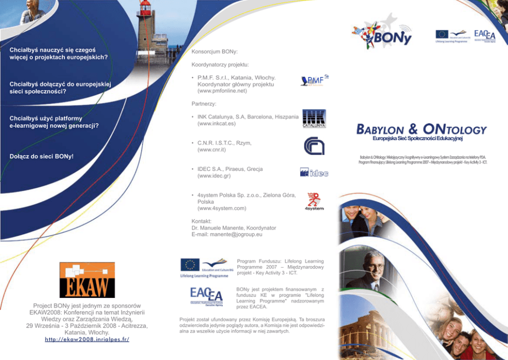 Chciałbyś nauczyć się czegoś więcej o projektach europejskich? Chciałbyś dołączyć do europejskiej sieci społeczności? Konsorcjum BONy: Koordynatorzy projektu: • P.M.F. S.r.l., Katania, Włochy. Koordynator główny projektu (www.pmfonline.net) Partnerzy: Chciałbyś użyć platformy e-learnigowej nowej generacji? Dołącz do sieci BONy! • INK Catalunya, S.A, Barcelona, Hiszpania (www.inkcat.es) • C.N.R. I.S.T.C., Rzym, (www.cnr.it) Babylon & ONtology: Wielojęzyczny i kognitywny e-Learningowy System Zarządzania na telefony PDA. Program Finansujący: Lifelong Learning Programme 2007 – Międzynarodowy projekt - Key Activity 3 - ICT. • IDEC S.A., Piraeus, Grecja (www.idec.gr) • 4system Polska Sp. z.o.o., Zielona Góra, Polska (www.4system.com) Kontakt: Dr. Manuele Manente, Koordynator E-mail: [email protected] Program Funduszu: Lifelong Learning Programme 2007 – Międzynarodowy projekt - Key Activity 3 - ICT. Project BONy jest jednym ze sponsorów EKAW2008: Konferencji na temat Inżynierii Wiedzy oraz Zarządzania Wiedzą, 29 Września - 3 Październik 2008 - Acitrezza, Katania, Włochy. http://ek aw 2008.inrialpes.fr/ Europejska Sieć Społeczności Edukacyjnej BONy jest projektem finansowanym z funduszu KE w programie "Lifelong Learning Programme" nadzorowanym przez EACEA. Projekt został ufundowany przez Komisję Europejską. Ta broszura odzwierciedla jedynie poglądy autora, a Komisja nie jest odpowiedzialna za wszelkie użycie informacji w niej zawartych. Cele BONy Nowa Generacja E-learning BONy Użytkowanie Użytkowanie BONy BONy Celem projektu jest opracowanie nowej generacji Systemu Zarządania Nauką, , bedącego w stanie stworzyć wielojęzyczny, ukształtowany schemat zaprojektowany dla potrzeb użutkowników. Konsorcjum BONy testuje nową technologię opracowaną od okresu istnienia projektu przy pomocy e-kursu na temat Zarządzania Cyklem Projektu. Kurs ten adresowany jest do menedżerów projektu, którzy chcą nauczyć się więcej na ten temat oraz do początkujących w temacie europejskiego zarządzania projektem. Główna technologia zaproponowana przez projekt BONy oparta jest na ostatnich nowościach w dziedzinie sztucznej inteligencji, sieci społecznej oraz informacyjnych i komunikacyjnych technologii: Możemy Możemy sobie sobie wyobrazić wyobrazić Greckiego Greckiego praktykanta praktykanta jadącego jadącego do do Włoch Włoch aby aby zdobyć zdobyć doświadczenie doświadczenie jako jako asystant asystant menedżera menedżera projektu projektu w w pewnej pewnej Włoskiej Włoskiej firmie. firmie. Nasz Nasz praktykant praktykant potrzebowałby potrzebowałby konkretnych konkretnych matariałów matariałów dotyczących dotyczących zarządzania zarządzania cyklem cyklem projektu projektu oraz oraz odpowiedniego odpowiedniego kursu kursu języka języka włoskiego. włoskiego. Okres projektu : Start: 01/01/2008; Koniec: 31/12/2009. • Zaadaptowana do poziomu użytkownika, jego zachowania i języka: System BONy pozwala znaleźć i nauczyć się jednostek ściśle żądanych i potrzebnych użytkownikom by sprostać ich doświadczeniu w szkoleniu. BONy zapewnia wielojęzyczny dostęp do informacji (Angielski, Włoski, Grecki, Francuski, Hiszpański, Kataloński, Polski, Niemiecki, Węgierski, Słowacki i Czeski). • Wspólny system: Celem projektu BONy jest zmotywować użytkowników do tworzenia materiałów eudkacyjnych w sposób kooperatywny, narazie jednak konsorcjum BONy tworzy e-kurs o Eurpejskim Zarządzaniu Projektem. • Strona Semantyczna: BONy obejmuje ponadnaukowy wpływ na wiedzę oraz wzajemne połączenie pomiędzy kształtowaniem treści i interaktywnych multimediów dzieki stronom w metodologii semantycznej • PC, PDA i inne urządzenia mobilne: Społeczność kursantów BONy bedą współpracować używająć telefonów PDA (lub innnych urządzeń takich jak PC lub inne przenośne). • Social network: BONy jest siecią społeczną gdzie użytkownicy mogą odgrywać dwie role: ucznia i/lub nauczyciela, zależnie od ich umiejetności i potrzeb. BONy planuje dostarczyć ekspertów w pełni oddanych sprawie europejskiej wspólpracy nad zarządzaniem projektem. BONy BONy automatycznie automatycznie wygeneruje wygeneruje test test językowy językowy oraz oraz profesjonalny profesjonalny test test wprowadzający wprowadzający (modelowanie (modelowanie postępowania postępowania użytkownika). użytkownika). Kiedy Kiedy system system zidentyfikował zidentyfikował poziom poziom wiedzy wiedzy praktykanta, praktykanta, zasugeruje zasugeruje odpowiednie odpowiednie materiały materiały na na temat temat Zarządzania Zarządzania Cyklem Cyklem Projektu Projektu w w pożądanym pożądanym języku języku (wielojęzyczny (wielojęzyczny dostęp). dostęp). Użytkownik Użytkownik może może wybrać wybrać odpowiednie odpowiednie dla dla niego niego materiały materiały spełniające spełniające jego jego preferencje preferencje (faza (faza uczenia uczenia się). się). Tak Tak szybko szybko jak jak użytkownik użytkownik czuje czuje się się gotowy gotowy do do przetesprzetestowania towania nabytej nabytej wiedzy, wiedzy, wirtualny wirtualny nauczyciel nauczyciel automatyautomatycznie cznie wygeneruje wygeneruje odpowiedni odpowiedni test test wielokrotnego wielokrotnego wyboru wyboru na na podstawie podstawie rozważanego rozważanego materiału. materiału. System System następnie następnie zaproponuje zaproponuje zmianę zmianę treści treści (przejście (przejście na na wyższy wyższy poziom poziom wiedzy) wiedzy) odpowiednio odpowiednio do do rezultatów rezultatów w w teście teście oraz oraz poziomu poziomu zainteresowania zainteresowania ze ze strony strony użytkownika użytkownika lub lub tym tym podobnych podobnych (interakcja (interakcja człowiek-maszyna). człowiek-maszyna). Dzięki Dzięki Sieci Sieci Społecznej Społecznej użytkownik użytkownik może może zostać zostać wsparty wsparty