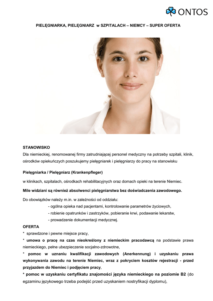 PIELĘGNIARKA, PIELĘGNIARZ w SZPITALACH – NIEMCY – SUPER OFERTA STANOWISKO Dla niemieckiej, renomowanej firmy zatrudniającej personel medyczny na potrzeby szpitali, klinik, ośrodków opiekuńczych poszukujemy pielęgniarek i pielęgniarzy do pracy na stanowisku Pielęgniarka / Pielęgniarz (Krankenpfleger) w klinikach, szpitalach, ośrodkach rehabilitacyjnych oraz domach opieki na terenie Niemiec. Mile widziani są również absolwenci pielęgniarstwa bez doświadczenia zawodowego. Do obowiązków należy m.in. w zależności od oddziału: - ogólna opieka nad pacjentami, kontrolowanie parametrów życiowych, - robienie opatrunków i zastrzyków, pobieranie krwi, podawanie lekarstw, - prowadzenie dokumentacji medycznej. OFERTA * sprawdzone i pewne miejsce pracy, * umowa o pracę na czas nieokreślony z niemieckim pracodawcą na podstawie prawa niemieckiego, pełne ubezpieczenie socjalno-zdrowotne, * pomoc w uznaniu kwalifikacji zawodowych (Anerkennung) i uzyskaniu prawa wykonywania zawodu na terenie Niemiec, wraz z pokryciem kosztów rejestracji - przed przyjazdem do Niemiec i podjęciem pracy, * pomoc w uzyskaniu certyfikatu znajomości języka niemieckiego na poziomie B2 (do egzaminu językowego trzeba podejść przed uzyskaniem nostryfikacji dyplomu), * atrakcyjne wynagrodzenie 1900-2300 euro netto za miesiąc obejmujące: stawkę podstawową 11,31 euro brutto; dodatek za pracę w soboty +7,5%; dodatek za pracę w niedzielę +25%; dodatek za pracę w nocy +15%, dopłatę do wyżywienia w wysokości ok. 250 euro na miesiąc, dodatki za nadgodziny, pracę w weekendy i zmiany nocne, zwrot kosztów dojazdów do pracy, raz w miesiącu zwrot kosztów podróży do rodziny w Polsce (ok.300 euro) * praca na zmianach dziennych i nocnych według grafiku (38,5 h tygodniowo), * wysokiej klasy zakwaterowanie z TV i internetem (pokój od 330 euro/mies. lub mieszkanie i od 450 euro/mies. – koszt z opłatami, koszt potrącany z wynagrodzenia), możliwość przyjazdu i zamieszkania z rodziną), * płatny urlop (25 dni w pierwszym roku pracy), * możliwość zdobycia bogatego doświadczenia zawodowego w przyjaznej atmosferze pracy, * miejsce pracy: głównie południe Niemiec (Stuttgart, Monachium), * pełne wsparcie organizacyjne podczas przeprowadzki do Niemczech i przez cały czas trwania kontraktu. WYMAGANIA * wykształcenie kierunkowe pielęgniarskie potwierdzone dyplomem: licencjat, magister, * aktualne prawo wykonywania zawodu, * komunikatywna znajomość jęz. niemieckiego (poziom B1), * doświadczenie w zawodzie mile widziane, ale nie jest wymagane (możliwość pracy przez pierwszych kilka miesięcy w domu opieki na stanowisku pielęgniarskim, a później – przejście do pracy w szpitalu), * profesjonalne i kompetentne podejście do obowiązków, * dobry stan zdrowia, * umiejętność odnalezienia się w różnych sytuacjach zawodowych, * staranność i rzetelność, empatia i dyskrecja, * elastyczność i umiejętność pracy w zespole, * niekaralność. ONTOS Agencja Pośrednictwa Pracy Jesteśmy polską agencją pośrednictwa pracy zarejestrowaną pod numerem 4824 w KRAZ. Od 2008 roku oferujemy legalną pracę w opiece zdrowotnej za granicą. Zapewniamy życzliwą i kompetentną - oraz bezpłatną - obsługę osób poszukujących pracy, a także indywidualne podejście do oczekiwań naszych kandydatów. Pomagamy przygotować dokumenty niezbędne w procesie rekrutacji, pomagamy zorganizować przejazd na miejsce pracy, zapewniamy pomoc i wsparcie. Prosimy o przesłanie CV w języku niemieckim na adres: [email protected] Agencja Pośrednictwa Pracy ONTOS ul. Krótka 6B/6, 80-209 Chwaszczyno k. Gdyni tel. +48 58 781 93 81, +48 502 154 951, faks: +48 58 781 9381, GG: 4310386 www.ontos.pl