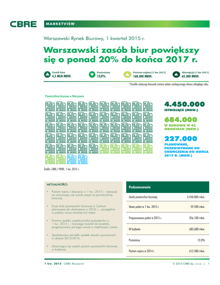 MARKETVIEW Warszawski Rynek Biurowy, 1 kwartał 2015 r. Warszawski zasób biur powiększy się o ponad 20% do końca 2017 r. Zasób biur Pustostany Poziom najmu (1 kw.2015) Absorpcja (1 kw.2015) 4,5 MLN MKW. 13,0% 168.300 MKW. 62.300 MKW. *Strzałki wskazują kierunek zmiany wobec analogicznego okresu ubiegłego roku. Powierzchnia biurowa w Warszawie 4.450.000 ISTNIEJĄCE (MKW.) 684.000 W BUDOWIE W 42 OBIEKTACH (MKW.) 227.000 PLANOWANE, PRZEWIDYWANE DO UKOŃCZENIA DO KOŃCA 2017 R. (MKW.) Źródło: CBRE / PORF, 1 kw. 2015 r. AKTUALNOŚCI: • Poziom najmu i absorpcji w 1 kw. 2015 r. wskazuje na utrzymujący się wysoki popyt na powierzchnię biurową. • Duża ilość powierzchni biurowej w Centrum planowana do ukończenia w 2016 r., szczególnie w pobliżu nowo otwartej linii metra. • Pomimo spadku współczynnika pustostanów w 1 kw. 2015 r., liczonego kwartał do kwartału, prognozowany jest jego wzrost w najbliższym czasie. • • Spodziewany jest lekki spadek stawek czynszowych w okresie 2015-2016. Utrzymujący się wysoki poziom powierzchni biurowej w budowie. 1 kw. 2015 CBRE Research Podsumowanie Zasób powierzchni biurowej Nowa podaż w 1 kw. 2015 r. 4.450.000 mkw. 59.200 mkw. Prognozowana podaż w 2015 r. 356.100 mkw. W budowie 683.600 mkw. Pustostany 13.0% Poziom najmu w 2014 r. 612.400 mkw. © 2015 CBRE Sp. z o.o. | 1 M A R K E T V I E W WARSZAWSKI RYNEK BIUROWY WYSOKA PODAŻ POWIERZCHNI W CENTRUM MIASTA Podaż nowej powierzchni biurowej w Warszawie 300 300 000 000 250 250 000 000 200 200 000 000 150 150 000 000 100 100 000 000 50 000 000 50 2015P 2016P 2014 2013 2012 1 kw. 2015 2011 0 0 4 kw. 2014 Nowa powierzchnia jest silnie skoncentrowana w dużych budynkach. 10 największych budowanych obiektów odpowiada za ponad 50% powierzchni w budowie. 400 400 000 000 350 350 000 000 2010 Najemcy znacznie chętniej decydują się na ukończone projekty. Zaledwie 20% powierzchni w budowie jest objęte umowami przednajmu. Poza Centrum Poza Centrum - planowane 500 500 000 000 450 450 000 000 2009 Obecnie w Warszawie budowane jest 684.000 mkw. biur. 40% tej powierzchni znajduje się w Centrum, co przekłada się na wysoki poziom konkurencji na tym obszarze. Centrum Centrum - planowane 2008 Od początku 2015 r. oddano do użytkowania blisko 60.000 mkw. powierzchni biurowej w 8 obiektach. Źródło: CBRE / PORF, 1 kw. 2015 r., P– prognoza. ABSORPCJA PRZEKROCZYŁA NOWĄ PODAŻ W 1 KW. 2015 R. Absorpcja i podaż powierzchni biurowej w Warszawie W 1 kw. 2015r. absorpcja powierzchni biurowej wyniosła 62.300 mkw., znacznie przewyższając średnią z ostatnich 4 lat (ok. 39.000 mkw.). Drugi kwartał z rzędu absorpcja przekroczyła poziom podaży powodując niewielki spadek wskaźnika pustostanów. W 1 kw. 2015r. 14.300 mkw. powierzchni biurowej zostało wchłonięte w Centrum, a pozostałe 48.000 mkw. w lokalizacjach poza Centrum. Podaż 140 000 120 000 100 000 80 000 60 000 40 000 20 000 0 3 kw. 2014 2 kw. 2014 1 kw. 2014 4 kw. 2013 3 kw. 2013 2 kw. 2013 1 kw. 2013 4kw. 2012 3 kw. 2012 Absorpcja powierzchni biurowej klasy A wyniosła ok. 62.300 mkw., podczas gdy absorpcja powierzchni biurowej klasy B osiągnęła wartość ujemną, bliską 0 mkw. Absorpcja Źródło: CBRE / PORF, 1 kw. 2015 r. 1 kw. 2015 CBRE Research © 2015 CBRE Sp. z o.o. | 2 M A R K E T V I E W WARSZAWSKI RYNEK BIUROWY WZROST PUSTOSTANÓW NAWET W NAJLEPSZYM SCENARIUSZU W 1 kw. 2015 r. współczynnik pustostanów zmalał o 0,3 punktu procentowego w odniesieniu do ostatniego kwartału 2014 r. i wyniósł 13%. Jednocześnie, ze względu na stosunkowo duży poziom powierzchni biurowej w budowie, przewidywany jest ponowny wzrost współczynnika pustostanów w kolejnych kwartałach. Odsetek powierzchni niewynajętej wyniósł 14.5% w Centrum oraz 12.4% poza Centrum. Pesymistyczny Realistyczny Optymistyczny 22% 20% 18% 16% 14% 12% 10% 8% 6% 4% 2 kw. 2017 1 kw. 2017 4 kw. 2016 3 kw. 2016 2 kw. 2016 1 kw. 2016 4 kw. 2015 3 kw. 2015 2 kw. 2015 1 kw. 2015 4 kw. 2014 3 kw. 2014 2 kw. 2014 1 kw. 2014 4 kw. 2013 3 kw. 2013 2 kw. 2013 1 kw. 2013 4 kw. 2012 Według realistycznego scenariusza spodziewany jest wzrost wskaźnika pustostanów, który może osiągnąć poziom 19% w połowie 2016 r. Współczynnik pustostanów-prognozy Źródło: CBRE / PORF, 1 kw. 2015 r. POZIOM NAJMU WSKAZUJE NA WYSOKI STOPIEŃ POPYTU Prognoza 800 000 700 000 600 000 500 000 400 000 300 000 200 000 100 000 2017P 2016P 2015P 2014 2013 2012 0 2011 Co istotne, poziom najmu w 1 kw. 2015 r. został wygenerowany przez duże transakcje. Zawarto 3 umowy na wynajem powierzchni biurowych powyżej 10.000 mkw. Poza Centrum 2010 54% powierzchni biurowej zostało wynajęte w oparciu o nowe umowy w istniejących budynkach. Renegocjacje i przednajem stanowiły odpowiednio 26% i 14%. Centrum 2009 W 1 kw. 2015 r. wynajęto 51.000 mkw. w Centrum oraz 117.300 mkw. w lokalizacjach poza Centrum. Poziom najmu w Warszawie 2008 Poziom najmu w 1 kw. 2015 r. był o 30% wyższy w relacji do analogicznego okresu w 2014 r. Źródło: CBRE / PORF, 1 kw. 2015 r., P – prognoza. 24,5 18,0 15,0 1 kw. 2015 CBRE Research POZA CENTRUM CENTRUM UTRZYMUJĄCA SIĘ PRESJA NA SPADEK CZYNSZÓW 15,0 13,0 11,5 NAJWYŻSZE CZYNSZE TRANSAKCYJNE ŚREDNIE CZYNSZE TRANSAKCYJNE (KLASA A) ŚREDNIE CZYNSZE TRANSAKCYJNE (KLASA B) TREND (EUR/MKW./MIESIĄC) © 2015 CBRE Sp. z o.o. | 3 M A R K E T V I E W WARSZAWSKI RYNEK BIUROWY BIELANY (N) 209.300 50.900 19,6% 17,5 EUR CENTRUM (CC) 1.333.000 276.900 14,5% 18,0 EUR PRAGA (E) 184.100 22.000 7,8% 14,0 EUR WILANÓW (SE) 211.900 27.000 7,8% 14,5 EUR WOLA (W) 338.300 35.900 16,4% 15,5 EUR OCHOTA (SW) 798.800 120.000 14,0% 14,0 EUR MOKOTÓW (US) 1.197.900 135.000 11,3% 13,0 EUR PUŁAWSKA (LS) 176.400 16.000 7,5% 12,0 EUR OBSZAR • ZASÓB BIUR(MKW.) • W BUDOWIE (MKW.) • PUSTOSTANY• ŚREDNIE CZYNSZE W NOWYCH BUDYNKACH ( ZA MKW./MIESIĄC) Q1 2015 CBRE Research © 2015 CBRE Sp. z o.o. | 4 M A R K E T V I E W WARSZAWSKI RYNEK BIUROWY 10 największych umów na