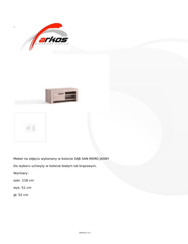 Mebel na zdjęciu wykonany w kolorze DĄB SAN REMO JASNY Do wyboru uchwyty w kolorze białym lub brązowym. Wymiary: szer. 118 cm wys. 51 cm gł. 52 cm Strona 1 z 1