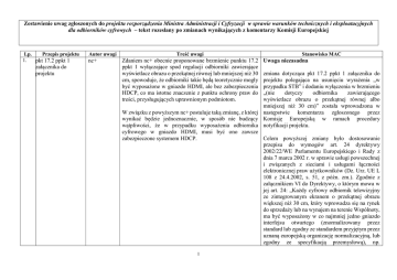 Zestawienie uwag zgłoszonych do projektu rozporządzenia Ministra Administracji i Cyfryzacji w sprawie warunków technicznych i eksploatacyjnych dla odbiorników cyfrowych – tekst rozesłany po zmianach wynikających z komentarzy Komisji Europejskiej Lp. Przepis projektu 1. pkt 17.2 ppkt 1 załącznika do projektu Autor uwagi nc+ Treść uwagi Zdaniem nc+ obecnie proponowane brzmienie punktu 17.2 ppkt 1 wyłączające spod regulacji odbiorniki zawierające wyświetlacz obrazu o przekątnej równej lub mniejszej niż 30 cm, spowoduje, że odbiorniki takie będą teoretycznie mogły być wyposażone w gniazdo HDMI, ale bez zabezpieczenia HDCP, co ma istotne znaczenie z punktu ochrony praw do treści, przysługujących uprawnionym podmiotom. Stanowisko MAC Uwaga niezasadna zmiana dotycząca pkt 17.2 ppkt 1 załącznika do projektu polegająca na usunięciu wyrażenia „w przypadku STB” i dodaniu wyłączenia w brzmieniu „(nie dotyczy odbiornika zawierającego wyświetlacz obrazu o przekątnej równej albo mniejszej niż 30 cm)” została wprowadzona w W związku z powyższym nc+ postuluje taką zmianę, z której następstwie komentarza zgłoszonego przez wynikać będzie jednoznacznie, w sposób nie budzący Komisję Europejską w ramach procedury wątpliwości, że w przypadku wyposażenia odbiornika notyfikacji projektu. cyfrowego w gniazdo HDMI, musi być ono zawsze zabezpieczone systemem HDCP. Celem powyższej zmiany było dostosowanie przepisu do wymogów art. 24 dyrektywy 2002/22/WE Parlamentu Europejskiego i Rady z dnia 7 marca 2002 r. w sprawie usługi powszechnej i związanych z sieciami i usługami łączności elektronicznej praw użytkowników (Dz. Urz. UE L 108 z 24.4.2002, s. 51, z późn. zm.). Zgodnie z załącznikiem VI do Dyrektywy, o którym mowa w jej art. 24: „Każdy cyfrowy odbiornik telewizyjny ze zintegrowanym ekranem o przekątnej obrazu większej niż 30 cm, który wprowadza się na rynek do sprzedaży lub na wynajem na terenie Wspólnoty, ma być wyposażony w co najmniej jedno gniazdo interfejsu otwartego (znormalizowany przez standard lub zgodny ze standardem przyjętym przez uznaną europejską organizację normalizacyjną, lub zgodny ze specyfikacją przemysłową), np. 1 ujednolicone złącze interfejsu DBV, pozwalające na proste przyłączenie urządzeń peryferyjnych i zdolne przesyłać wszystkie składniki cyfrowego sygnału telewizyjnego, łącznie z informacją związaną z usługami interaktywnymi i dostępnymi warunkowo.”. W związku z powyższym oraz ze względu na fakt, iż sugerowana przez nc+ zmiana wykracza poza zakres ww. dyrektywy uwaga została uznana za niezasadną. 2. pkt 17.3 ppkt 1 Cyfrowy Polsat Cyfrowy Polsat uznał zmianę pkt 17.2 ppkt 1 załącznika do rozporządzenia za neutralną i akceptowalną dla spółki. Niemniej jednak zasugerował modyfikację pkt 17.3 poprzez usunięcie ppkt 1 powołując się na powszechność standardu HDMI i brak uzasadnienia utrzymania w odbiorniku gniazda analogowego SCART. Uwaga niezasadna Konsultacje dotyczyły wyłącznie wprowadzonych w wyniku przeprowadzonej procedury notyfikacji projektu rozporządzenia zmian tj. punktu 17.2 ppkt 1 załącznika do projektu. Jednocześnie należy zauważyć, że wymóg wyposażania odbiornika cyfrowego w analogowe gniazdo SCART dotyczy wyłącznie przystawki STB, która dzięki tej funkcjonalności może zostać podłączona do telewizora „starszego typu” niewyposażonego w gniazdo HDMI – umożliwiając w ten sposób odbiór naziemnej telewizji cyfrowej. 2