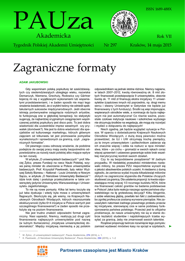 PAUza ISSN 1689-488X Akademicka Tygodnik Polskiej Akademii Umiejętności Rok VII Nr 297 Kraków, 14 maja 2015 Zagraniczne formaty ADAM JAKUBOWSKI Gdy wspominam polską popkulturę lat sześćdziesiątych czy siedemdziesiątych ubiegłego wieku, nazwiska Demarczyk, Niemena, Grechuty, Rodowicz czy Gärtner kojarzą mi się z wyjątkowymi wykonaniami lub wspaniałymi przedstawieniami, i w żaden sposób nie mąci tego wrażenia świadomość, że ci wybitni twórcy nie odnieśli spektakularnych sukcesów międzynarodowych. Jeśli obecnie istnieją porównywalne osiągnięcia rodzimych artystów, to funkcjonują one w głębokiej konspiracji, bo statystyki sugerują, że najbardziej oryginalnym osiągnięciem współczesnej polskiej popkultury jest disco polo. To jest dobra wiadomość dla uczestników imprez weselnych czy prywatek (domówek?). Nie jest to dobra wiadomość dla specjalistów od kulturowego marketingu, których głównym zajęciem od kilkunastu lat jest promowanie pomysłów wynalezionych i sprawdzonych za granicą, czyli „zagranicznych formatów”. Od pewnego czasu odnoszę wrażenie, że podobne podejście do swojej pracy mają osoby bezpośrednio odpowiedzialne za rozwój nauki polskiej albo mające wpływ na ten rozwój. W artykule „O uniwersytetach badawczych” 1 prof. Maciej Żylicz, prezes Fundacji na rzecz Nauki Polskiej, wzywa panią minister do utworzenia w Polsce uniwersytetów badawczych. Prof. Krzysztof Pawłowski, były rektor Wyższej Szkoły Biznesu – National – Louis University w Nowym Sączu, w artykule „O Narodowe Uniwersytety Badawcze” 2 idzie krok dalej i postuluje przekształcenie w takie uniwersytety jedynie Uniwersytetu Warszawskiego i Uniwersytetu Jagiellońskiego. To nie są nowe pomysły. Kilka lat temu toczyła się już taka dyskusja i wtedy była mowa o uniwersytetach flagowych. Skończyło się, jak wiemy, na Krajowych Naukowych Ośrodkach Wiodących, których niezrozumiała ekskluzywność (tylko 6+4 inicjatyw w Polsce wartych jest szczególnego finansowania?) w żaden sposób nie przełożyła się na poziom finansowania. Nie jest trudno znaleźć odpowiedni format zagraniczny. Nasi sąsiedzi, Niemcy, realizują już drugi cykl finansowania najlepszych uniwersytetów pod nazwą (w luźnym tłumaczeniu) „inicjatywa uniwersyteckiej doskonałości”. Między inicjatywą niemiecką a jej polskim 1 2 odpowiednikiem są jednak istotne różnice. Niemcy najpierw, w latach 2007–2012, kwotą równoważną ok. 8 mld złotych finansowali przedsięwzięcia 9 uniwersytetów, obecnie kwotą ok. 11 mld zł finansują ekstra inicjatywy 11 uniwersytetów (częściowo innych niż poprzednio, np. drogi memu sercu i sławny Uniwersytet w Getyndze nie będzie już finansowany z tych funduszy). Środki są więc imponujące, wspieranych ośrodków wiele, a nominacja do bycia najlepszym nie jest automatyczna! Co równie ważne, pozostałe czołowe instytucje naukowe i szkolnictwa wyższego nie otrzymują środków na wegetację, ale mogą się rozwijać i myśleć o dołączeniu do najlepszych! Niech zgadnę, jak będzie wyglądać sytuacja w Polsce. W oparciu o doświadczenia Krajowych Naukowych Ośrodków Wiodących, z dużą dozą pewności można przewidzieć, że UJ i UW otrzymają trochę pieniędzy, za to innym uniwersytetom i politechnikom zabierze się ich znacznie więcej i odda na rozkurz w ręce ministerstwa, które – po cichu – gromadzi w swoich rękach coraz więcej uprawnień i ustawowo gwarantuje sobie brak wszelkiej merytorycznej kontroli swoich działań. Czy to są bezpodstawne posądzenia? W żadnym przypadku. W niedalekiej przeszłości ministerstwo rozdawało miliony, bo prezes PZU niepochlebnie wyraził się o jakości absolwentów polskich uczelni. A niedawno z dumą ogłosiło, że zamierza wydać trzysta kilkadziesiąt milionów złotych na zagraniczne stypendia dla Polaków chcących studiować za granicą. Dla ustalenia proporcji: to kwota odpowiadająca mniej więcej 1/3 rocznego budżetu NCN, które ma finansować całość grantów na badania podstawowe w Polsce! Jaka była reakcja naszego społeczeństwa obywatelskiego na tę groteskową decyzję? Kilku blogerów, z sobie właściwą głębią, powitało ten fakt z zadowoleniem, bo zgniłej profesurze zostaną wyrwane pieniądze. Nie zauważyłem natomiast żadnego poważnego protestu przeciw tej inicjatywie, stanowiącej cios w same podstawy funkcjonowania państwa polskiego. Przecież jest to oficjalna proklamacja, że nasze uniwersytety nie są w stanie dobrze kształcić studentów i najzdolniejszych trzeba wysyłać za granicę, żeby nie zmarnowali swoich talentów. Rządowi proponuję twórcze rozwinięcie tego pomysłu: zamiast wydawać mnóstwo kasy na sprzęt w szpitalach, M. Żylicz, „O uniwersytetach badawczych”, Pauza Akademicka, 274 (2014), s. 1. K. Pawłowski, „O Narodowe Uniwersytety Badawcze”, Pauza Akademicka, 294 (2015), s. 1–2 Partnerem czasopisma jest Miasto Kraków ► 2 www.pauza.krakow.pl ► kształcenie specjalistów lub zakup leków – należy ufundować promesy na leczenie w klinikach zagranicznych! Najlepiej, oczywiście, w najlepszych. Jakież to pole do popisu dla urzędników w procesie wyłaniania kandydatów do leczenia! Ale powróćmy do oryginalnego pomysłu przekształcenia UJ i UW w uniwersytety badawcze z ekstra finansowaniem, co może awansuje nasze najlepsze uniwersytety z 4. do 3. setki w rankingu szanghajskim i niechybnie spowoduje, że w krótkim czasie doczekamy się wytęsknionego laureata naukowego Nobla. Otóż jest pewna istotna różnica między Polską a Niemcami, którą zdają się ignorować zwolennicy tej inicjatywy. Na przestrzeni ostatnich dwudziestu kilku lat polskie uniwersytety zostały poddane wyniszczającej dyktaturze wolnego rynku edukacyjnego, a niemieckie nie! Co to oznacza? Że zarówno na UJ, jak i na UW istnieją słabe naukowo jednostki nastawione na konsumpcję (minionego) boomu e