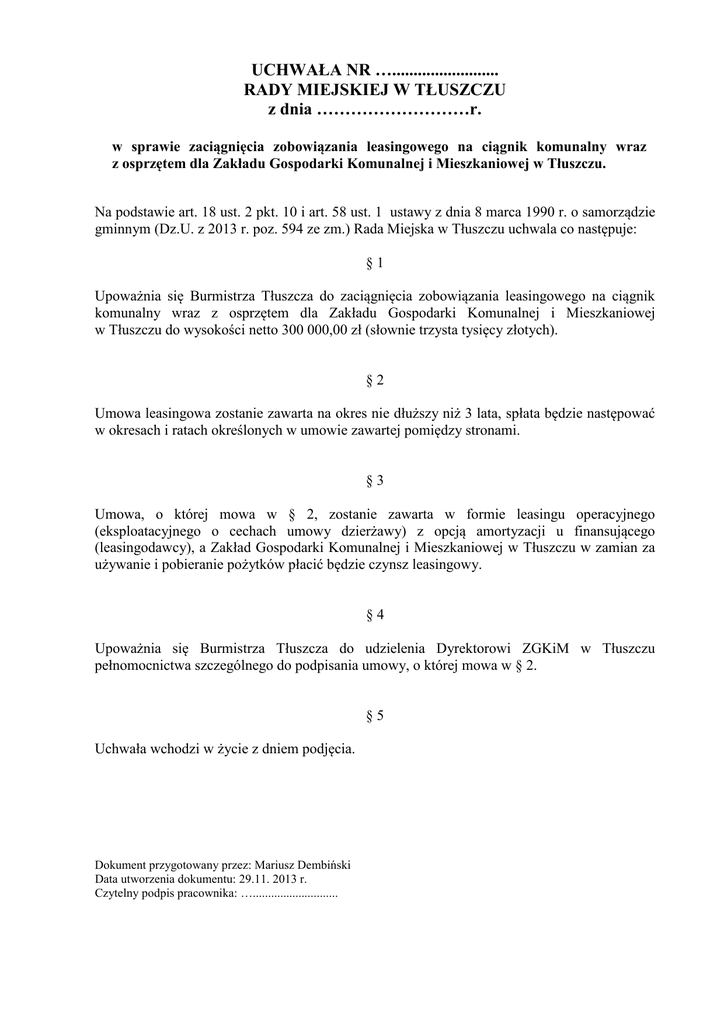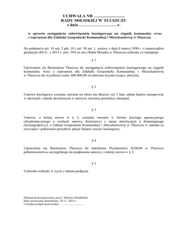 UCHWAŁA NR …......................... RADY MIEJSKIEJ W TŁUSZCZU z dnia ………………………r. w sprawie zaciągnięcia zobowiązania leasingowego na ciągnik komunalny wraz z osprzętem dla Zakładu Gospodarki Komunalnej i Mieszkaniowej w Tłuszczu. Na podstawie art. 18 ust. 2 pkt. 10 i art. 58 ust. 1 ustawy z dnia 8 marca 1990 r. o samorządzie gminnym (Dz.U. z 2013 r. poz. 594 ze zm.) Rada Miejska w Tłuszczu uchwala co następuje: §1 Upoważnia się Burmistrza Tłuszcza do zaciągnięcia zobowiązania leasingowego na ciągnik komunalny wraz z osprzętem dla Zakładu Gospodarki Komunalnej i Mieszkaniowej w Tłuszczu do wysokości netto 300 000,00 zł (słownie trzysta tysięcy złotych). §2 Umowa leasingowa zostanie zawarta na okres nie dłuższy niż 3 lata, spłata będzie następować w okresach i ratach określonych w umowie zawartej pomiędzy stronami. §3 Umowa, o której mowa w § 2, zostanie zawarta w formie leasingu operacyjnego (eksploatacyjnego o cechach umowy dzierżawy) z opcją amortyzacji u finansującego (leasingodawcy), a Zakład Gospodarki Komunalnej i Mieszkaniowej w Tłuszczu w zamian za używanie i pobieranie pożytków płacić będzie czynsz leasingowy. §4 Upoważnia się Burmistrza Tłuszcza do udzielenia Dyrektorowi ZGKiM w Tłuszczu pełnomocnictwa szczególnego do podpisania umowy, o której mowa w § 2. §5 Uchwała wchodzi w życie z dniem podjęcia. Dokument przygotowany przez: Mariusz Dembiński Data utworzenia dokumentu: 29.11. 2013 r. Czytelny podpis pracownika: …............................ Uzasadnienie do uchwały Rady Miejskiej w Tłuszczu w sprawie zaciągnięcia zobowiązania leasingowego na ciągnik komunalny wraz z osprzętem dla Zakładu Gospodarki Komunalnej i Mieszkaniowej w Tłuszczu. W związku z zakresem zadań realizowanych przez Zakład Gospodarki Komunalnej i Mieszkaniowej w Tłuszczu zachodzi potrzeba nabycia ciągnika komunalnego. Postanawia się nabyć ciągnik poprzez zawarcie umowy leasingowej, która kreuje zobowiązania wymagalne w następnych latach budżetowych ( z tytułu opłat czynszu leasingowego będących wydatkami bieżącymi). Umowa ta zostanie zawarta w formie leasingu operacyjnego o cechach umowy dzierżawy z opcją amortyzacji u finansującego (leasingodawcy), a Zakład Gospodarki komunalnej i Mieszkaniowej w zamian za używanie i pobieranie pożytków, płacić będzie czynsz leasingowy. Do zawarcia powyższej umowy potrzebne jest upoważnienie organu stanowiącego w oparciu o przepis art. 18 ust. 2 pkt 10 ustawy o samorządzie gminnym, który stanowi, że do wyłącznej właściwości rady gminy należy określenie wysokości sumy, do której burmistrz może samodzielnie zaciągać zobowiązanie. Uprawnienie do zaciągania zobowiązań organ wykonawczy może przenieść na kierownika jednostki organizacyjnej, ale wyłącznie w granicach upoważnienia otrzymanego od Rady Gminy. Zgodnie z art. 47 ustawy o samorządzie gminnym kierownicy jednostek organizacyjnych gminy nieposiadających osobowości prawnej działają jednoosobowo na podstawie pełnomocnictwa udzielonego przez burmistrza. Umowa leasingowa jest umową wieloletnią, co oznacza, że wydatki związane z realizacją tej umowy będą musiały być ujęte w planach finansowych kolejnych lat, w których ponoszone będą płatności z tytułu leasingu – tj. w planach finansowych Zakładu Gospodarki Komunalnej i Mieszkaniowej w Tłuszczu.