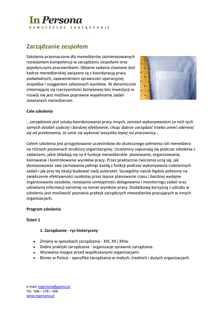 Zarządzanie zespołem Szkolenia przeznaczone dla menedżerów zainteresowanych rozwijaniem kompetencji w zarządzaniu zespołami oraz pojedynczymi pracownikami. Główne zadania stawiane dziś kadrze menedżerskiej związane są z koordynacją pracy podwładnych, zapewnieniem sprawności operacyjnej zespołów i osiąganiem założonych wyników. W dynamicznie zmieniającej się rzeczywistości biznesowej bez inwestycji w rozwój nie jest możliwe poprawne wypełnianie zadań stawianych menedżerom. Cele szkolenia ...zarządzanie jest sztuką koordynowania pracy innych, zamiast wykonywaniem za nich tych samych działań szybciej i bardziej efektywnie; chcąc dobrze zarządzać trzeba umieć oderwać się od przekonania, że umie się wykonać wszystko lepiej niż pracownicy... Celem szkolenia jest przygotowanie uczestników do skutecznego pełnienia roli menedżera na różnych poziomach struktury organizacyjnej. Uczestnicy zapoznają się podczas szkolenia z zadaniami, jakie składają się na 4 funkcje menedżerskie: planowanie, organizowanie, kierowanie i kontrolowanie wyników pracy. Przez praktyczne ćwiczenia uczą się, jak dostosowywać swe zachowania pełniąc każdą z funkcji podczas wykonywania codziennych zadań i jak przy tej okazji budować swój autorytet. Szczególny nacisk będzie położony na zwiększenie efektywności osobistej przez lepsze planowanie czasu i bardziej wydajne organizowanie zasobów, rozwijanie umiejętności delegowania i monitoringu zadań oraz udzielania informacji zwrotnej na temat wyników pracy. Dodatkową korzyścią z udziału w szkoleniu jest możliwość poznania praktyk zarządczych menedżerów pracujących w innych organizacjach. Program szkolenia Dzień 1 1. Zarządzanie - rys historyczny Zmiany w sposobach zarządzania - XIX, XX i XXIw. Dobre praktyki zarządzania - organizacje sprawnie zarządzane. Wyzwania stojące przed współczesnymi organizacjami. Biznes w Polsce - specyfika zarządzania w małych, średnich i dużych organizacjach. e-mail: [email protected] Tel. 506 – 178 – 506 www.inpersona.pl 2. Organizacja - co to jest? Organizacja - zespół zespołów nakierowanych na dostarczanie usług, produktów. Ludzie w organizacji - rola i funkcje menedżera, pracowników liniowych, Zarządu i Właścicieli. Komunikacja wewnętrzna - co daje i co się dzieje, gdy pojawiają się bariery w przepływie informacji. Wizerunek organizacji. Konkurencja - żadna organizacja nie działa w próżni - czyli wszystko już było i jest wiele firm w naszej branży, ale... Zagrożenia dla organizacji - jakie trudności musi pokonać organizacja, by nie upaść. 3. Współczesne podejście do zarządzania w organizacji Uniwersalne czynniki sukcesu organizacji. Teorie i metody zarządzania - przegląd współcześnie wykorzystywanych koncepcji i metod zarządzania. 4. Rola lidera w organizacji nastawionej na rozwój Partycypacja pracowników w określaniu celów firmy. Tworzenie kultury organizacji i przewagi konkurencyjnej. Najczęściej popełniane błędy w pracy menedżera i ich konsekwencje. Na kim się wzorować chcąc sprawnie zarządzać? 5. Przywództwo przez sprawne zarządzanie – 4 funkcje menedżerskie Planowanie: zarządzanie sobą w czasie, praca z kalendarzem, modele określania priorytetów, ustalanie celów, negocjowanie celów z przełożonym, powoływanie grup zadaniowych i zespołów projektowych. Dzień 2 6. Przywództwo przez sprawne zarządzanie – 4 funkcje menedżerskie cd. Organizowanie: delegowania zadań (korzyści dla zespołu, organizacji, menedżera), unikanie błędów w komunikacji podczas delegowania (symulacje rozmów delegujących). Kierowanie: monitoring zadań jako sposób zarządzania ryzykiem, rola poziomu zaangażowania menedżera w działania zespołu, podejmowanie działań korygujących, elementy motywowania i zarządzania zmianą. Kontrolowanie wyników pracy: rozliczanie zadań/ kończenie prac zespołów projektowych, porównywanie rzeczywistości z planami, udzielanie informacji zwrotnej na temat jakości wykonanej pracy, poziomu kompetencji pracowników i rekomendacji rozwojowych (symulacje rozmów z udzielania informacji zwrotnej). e-mail: [email protected] Tel. 506 – 178 – 506 www.inpersona.pl 7. Trudne sytuacje - analiza przypadków i symulacje rozmów dotyczących trudnych sytuacji w zarządzaniu zespołem Wprowadzanie zmian w zespole i organizacji pracy Informowanie o redukcji zatrudnienia/likwidacji działu. Rozwiązywanie konfliktów między pracownikami. Postępowanie w przypadkach poważnego łamania dyscypliny pracy. Rozwiązywanie konfliktów w zespole. Czas trwania: 2 dni szkoleniowe Liczba uczestników: 8-15 osób Koszt udziału w szkoleniu: 750 PLN + 23% VAT. Cena obejmuje udział w szkoleniu, materiały szkoleniowe i catering. Terminy szkolenia ustalone będą po zebraniu grupy. Prosimy wysłać zgłoszenie przez Formularz Zgłoszenia e-mail: [email protected] Tel. 506 – 178 – 506 www.inpersona.pl