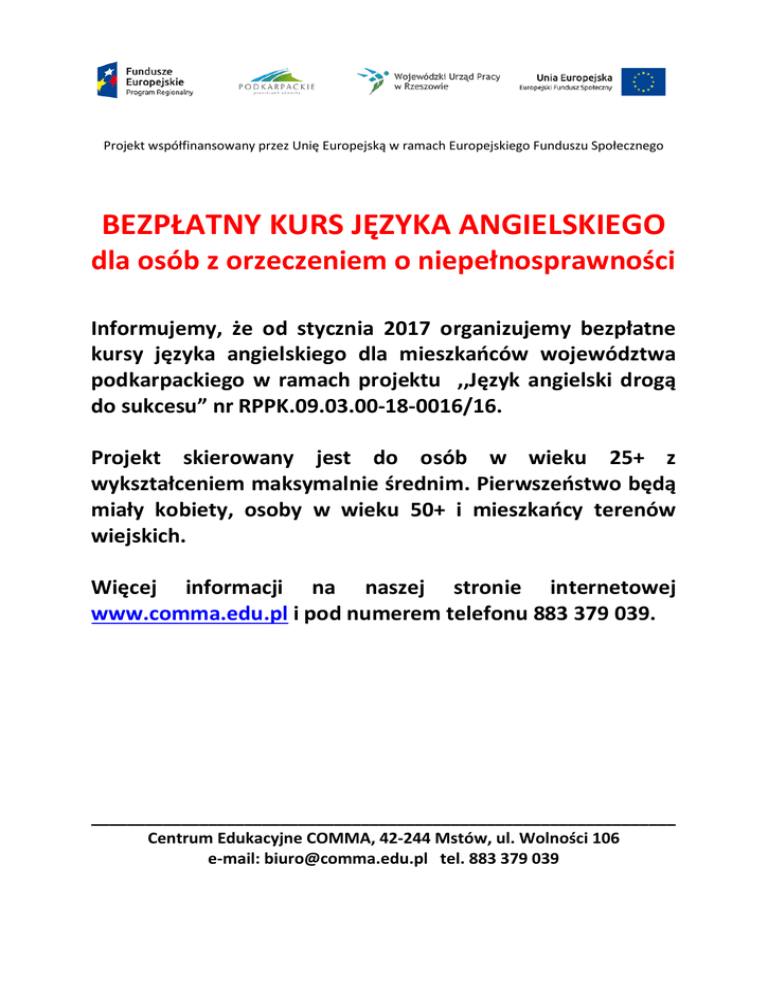 Projekt współfinansowany przez Unię Europejską w ramach Europejskiego Funduszu Społecznego BEZPŁATNY KURS JĘZYKA ANGIELSKIEGO dla osób z orzeczeniem o niepełnosprawności Informujemy, że od stycznia 2017 organizujemy bezpłatne kursy języka angielskiego dla mieszkańców województwa podkarpackiego w ramach projektu ,,Język angielski drogą do sukcesu” nr RPPK.09.03.00-18-0016/16. Projekt skierowany jest do osób w wieku 25+ z wykształceniem maksymalnie średnim. Pierwszeństwo będą miały kobiety, osoby w wieku 50+ i mieszkańcy terenów wiejskich. Więcej informacji na naszej stronie internetowej www.comma.edu.pl i pod numerem telefonu 883 379 039. _________________________________________________________________ Centrum Edukacyjne COMMA, 42-244 Mstów, ul. Wolności 106 e-mail: [email protected] tel. 883 379 039