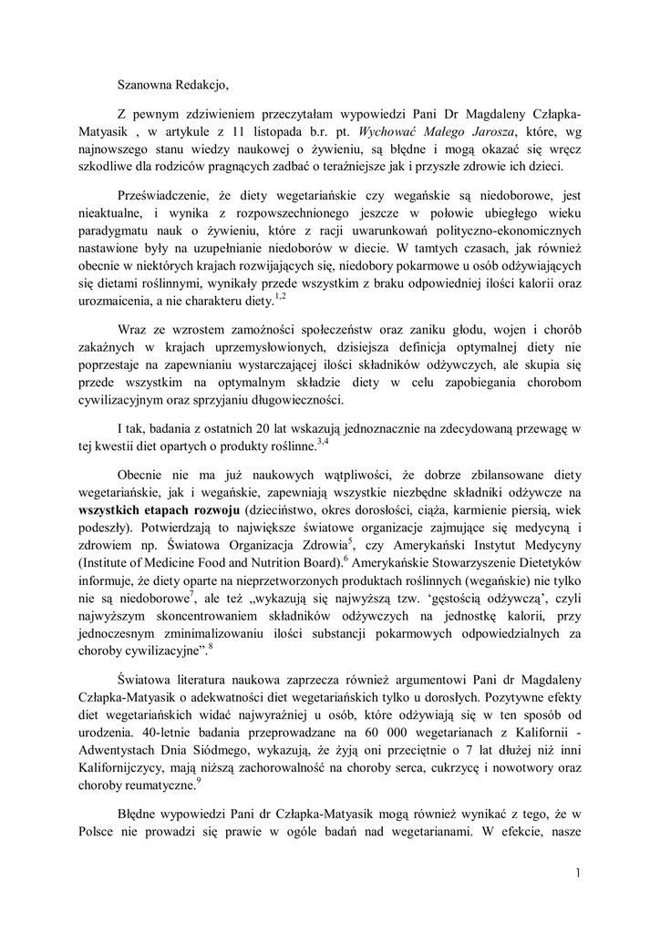 Szanowna Redakcjo, Z pewnym zdziwieniem przeczytałam wypowiedzi Pani Dr Magdaleny CzłapkaMatyasik , w artykule z 11 listopada b.r. pt. Wychować Małego Jarosza, które, wg najnowszego stanu wiedzy naukowej o żywieniu, są błędne i mogą okazać się wręcz szkodliwe dla rodziców pragnących zadbać o teraźniejsze jak i przyszłe zdrowie ich dzieci. Przeświadczenie, że diety wegetariańskie czy wegańskie są niedoborowe, jest nieaktualne, i wynika z rozpowszechnionego jeszcze w połowie ubiegłego wieku paradygmatu nauk o żywieniu, które z racji uwarunkowań polityczno-ekonomicznych nastawione były na uzupełnianie niedoborów w diecie. W tamtych czasach, jak również obecnie w niektórych krajach rozwijających się, niedobory pokarmowe u osób odżywiających się dietami roślinnymi, wynikały przede wszystkim z braku odpowiedniej ilości kalorii oraz urozmaicenia, a nie charakteru diety.1,2 Wraz ze wzrostem zamożności społeczeństw oraz zaniku głodu, wojen i chorób zakaźnych w krajach uprzemysłowionych, dzisiejsza definicja optymalnej diety nie poprzestaje na zapewnianiu wystarczającej ilości składników odżywczych, ale skupia się przede wszystkim na optymalnym składzie diety w celu zapobiegania chorobom cywilizacyjnym oraz sprzyjaniu długowieczności. I tak, badania z ostatnich 20 lat wskazują jednoznacznie na zdecydowaną przewagę w tej kwestii diet opartych o produkty roślinne.3,4 Obecnie nie ma już naukowych wątpliwości, że dobrze zbilansowane diety wegetariańskie, jak i wegańskie, zapewniają wszystkie niezbędne składniki odżywcze na wszystkich etapach rozwoju (dzieciństwo, okres dorosłości, ciąża, karmienie piersią, wiek podeszły). Potwierdzają to największe światowe organizacje zajmujące się medycyną i zdrowiem np. Światowa Organizacja Zdrowia5, czy Amerykański Instytut Medycyny (Institute of Medicine Food and Nutrition Board).6 Amerykańskie Stowarzyszenie Dietetyków informuje, że diety oparte na nieprzetworzonych produktach roślinnych (wegańskie) nie tylko nie są niedoborowe7, ale też „wykazują się najwyższą tzw. ‘gęstością odżywczą’, czyli najwyższym skoncentrowaniem składników odżywczych na jednostkę kalorii, przy jednoczesnym zminimalizowaniu ilości substancji pokarmowych odpowiedzialnych za choroby cywilizacyjne”.8 Światowa literatura naukowa zaprzecza również argumentowi Pani dr Magdaleny Człapka-Matyasik o adekwatności diet wegetariańskich tylko u dorosłych. Pozytywne efekty diet wegetariańskich widać najwyraźniej u osób, które odżywiają się w ten sposób od urodzenia. 40-letnie badania przeprowadzane na 60 000 wegetarianach z Kalifornii Adwentystach Dnia Siódmego, wykazują, że żyją oni przeciętnie o 7 lat dłużej niż inni Kalifornijczycy, mają niższą zachorowalność na choroby serca, cukrzycę i nowotwory oraz choroby reumatyczne.9 Błędne wypowiedzi Pani dr Człapka-Matyasik mogą również wynikać z tego, że w Polsce nie prowadzi się prawie w ogóle badań nad wegetarianami. W efekcie, nasze 1 społeczeństwo, włączając w to polskie kręgi naukowe, ma ograniczoną wiedzę na ten temat. Amerykanie, natomiast, badają wegetarian i wegan już od 60 lat. Dziesiątki badań nad dziećmi wegetariańskimi i wegańskimi potwierdzają to, że rozwijają się one normalnie, mają niższe ryzyko otyłości, cukrzycy, oraz jako dorośli -niższe ryzyko chorób serca oraz niektórych nowotworów. 10,11,12,13, 14, 15 Podobnie, ostatni raport Światowego Funduszu Badań nad Rakiem (World Cancer Research Fund)–największa metaanaliza dotycząca wpływu diety na występowanie chorób nowotworowych, wyraźnie apeluje o ograniczenie produktów zwierzęcych w diecie16. Dotyczy to również białka zwierzęcego, które, wbrew wypowiedzi Pani Doktor, może mieć niekorzystne skutki dla naszego zdrowia. Jeżeli spożywane jest regularnie, tak jak to ma miejsce w przeciętnej polskiej diecie, przyczynia się m.in. utraty wapnia z moczem17,18 czy podwyższenia we krwi pewnych czynników wzrostu, tj. insulinopodobnego czynnika wzrostu 1 (IGF-1), co z kolei może podwyższać ryzyko nowotworów piersi, prostaty czy jelita grubego. 19 Również nieaktualne jest przeświadczenie, że komponowanie w posiłku roślinnym aminokwasów egzogennych jest sztuką trudną. Dziś wiemy, że wystarczy po prostu spożywać odpowiednią ilość energii z różnorodnych pokarmów roślinnych w ciągu dnia, co potwierdzają największe organizacje naukowe, takie jak wyżej wspomniana Światowa Organizacja Zdrowia, Amerykańskie Stowarzyszenie Dietetyków, czy Institute of Medicine Food nad Nutrition Board. Niekorzystne konsekwencje zdrowotne, wymieniane przez Panią dr Magdalenę Człapka-Matyasik, mogą pojawić się w wyniku niewłaściwego zaplanowania diet roślinnych. Jednakże każda dieta niewłaściwie zaplanowana może prowadzić do niedoborów, i straszenie tysięcy wegetariańskich rodziców w Polsce tak poważnymi chorobami wydaje mi się sprzeczne z zasadami ‘evidence-based medicine’, czyli medycyny opartej na faktach naukowych. Zamiast straszyć, powinniśmy szerzyć wiedzę na temat prawidłowego zaplanowania diety małego jarosza, co zdecydowanie zmniejszy ryzyko jakichkolwiek niedoborów, i dobroczynnie wpłynie na przyszłe jego zdrowie. Z wyrazami szacunku, Małgorzata Rzeszutek-Desmond Mgr Małgorzata Desmond, ukończyła kierunek Medycyna Żywienia na Uniwersytecie Thames Valley w Londynie oraz kurs Epidemiologii Żywienia w Imperial College London; gościnnie wykłada na Warszawskim Uniwersytecie Medycznym ; na co dzień zajmuje się edukacją i poradnictwem z zakresu dietetyki w Dublinie. 2 1 Sukahatme PV. Size and nature of the protein gap. J Nutr. 1986; 116:1364-1370. 2 Millward DJ, Jackson AA. Protein/energy ratios of current diets in developed and developing countries compared with a safe protein/energy ratio: implications for recommended protein and amino acid