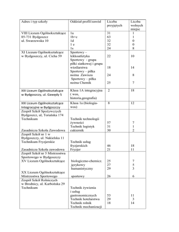 Adres i typ szkoły Oddział profil/zawód Liczba przyjętych VIII Liceum Ogólnokształcące 85-731 Bydgoszcz ul. Swarzewska 10 1a 1b+c 1d 1e 1s Sportowy – lekkoatletyka Sportowy - grupa piłki siatkowej i grupa wioślarstwa Sportowy – piłka nożna Zawisza Sportowy – piłka nożna Chemik 31 63 32 32 24 Liczba wolnych miejsc 1 1 0 0 8 22 10 18 14 24 8 25 7 XIII Liceum Ogólnokształcące w Bydgoszczy, ul. Gawędy 5 Klasa 1A integracyjna ( wos, historia,geografia) 2 18 XXI Liceum Ogólnokształcące Integracyjne w Bydgoszczy Zespół Szkół Spożywczych Bydgoszcz, ul, Toruńska 174 Technikum Klasa 1a (biologiawos) 8 12 Technik technologii żywności Technik logistyk cukiernik 57 31 30 7 1 2 Technik usług fryzjerskich Fryzjer 46 21 18 11 biologiczno-chemicz. językowy humanistyczny 25 27 29 7 5 3 sportowy 26 6 53 29 18 11 3 14 XI Liceum Ogólnokształcące w Bydgoszczy, ul. Cicha 59 Zasadnicza Szkoła Zawodowa Zespół Szkół nr 1 w Bydgoszczy, ul. Nakielska 11 Technikum Fryzjerskie Zasadnicza Szkoła zawodowa Zespół Szkół nr 5 Mistrzostwa Sportowego w Bydgoszczy XV Liceum Ogólnokształcące XX Liceum Ogólnokształcące Mistrzostwa Sportowego Zespół Szkół Rolniczych w Brodnicy, ul. Karbońska 29 Technikum Technik żywienia i usług gastronomicznych Technik hotelarstwa Technik rolnik Technik mechanizacji Zasadnicza Szkoła Zawodowa Zespół Szkół Ponadgimnazjalnych nr 1 w Inowrocławiu Technikum Zespół Szkół Ponadgimnazjalnych nr 5 w Inowrocławiu, ul. Narutowicza 34 Zespół Szkół Ponadgimnazjalnych nr 3 w Iniowrocławiu, ul. Dworcowa 25 Technikum Zasadnicz Szkoła Zawodowa Zespół Szkół Żeglugi Śródlądowej w Nakle nad Notecią Technikum Zasadnicz Szkoła Zawodowa Zespół Szkół Ponadgimnazjalnych w Lubaszczu Zasadnicza Szkoła Zawodowa rolnictwa Technik architektury krajobrazu kucharz 25 7 29 10 3 22 Technik elektronik Technik analityk Technik technologii żywności 26 24 4 6 25 5 Technik budownictwa 56 4 Technik informatyk Technik elektryk Technik procesów drukowania Technik mechanik Mechanik pojazdów samochodowych Elektromechanik pojazdów samochodowych 28 19 5 11 20 31 10 2 13 4 15 2 37 11 41 7 17 7 15 9 10 20 14 4 61 32 Technik żeglugi śródlądowej Technik pojazdów samochodowych Technik eksploatacji portów i terminali Mechanik pojazdów samochodowych Elektromechanik pojazdów samochodowych ślusarz Wielozawodowa (2 lub 3 klasy integracyjne, w tym 1 dwuzawodowa) Zespół Szkół nr 1 w Rypinie, ul. Kościuszki 51 Liceum Ogólnokształcące Zespół Szkół nr 2 w Rypinie, ul.Dworcowa 11 Liceum Ogólnokształcące Technikum Zasadnicza Szkoła Zawodowa Zespół Szkół Ponadgimnazjalnych w Sępólnie Krajeńskim Technikum Zasadnicza Szkoła Zawodowa Zespół Szkół –Centrum Edukacyjne w Więcborku, ul. Pocztowa 16 b Technikum Zasadnicza Szkoła Zawodowa I Liceum Ogólnokształcące w Szubinie II Liceum Ogólnokształcące w Świeciu, ul. Wojska Matematyczno-fizycz. 57 3 Mundurowe Technik żywienia i usług gastronomicznych Technik spedytor Technik ekonomista Technik informatyk Technik handlowiec Sprzedawca Kucharz Mechanik pojazdów samochodowych Ślusarz Blacharz Cukiernik Elektryk Fryzjer Lakiernik piekarz 55 5 24 19 29 26 14 18 5 6 11 1 4 16 12 25 13 16 2 9 7 9 4 1 17 14 28 21 23 21 26 29 Technik mechanik Oddziały wielozawodowe 10 5 73 17 Technik ekonomista Technik informatyk Technik hotelarstwa Wielozawodowa Biologiczny Humanistycznopolitechniczny 26 24 24 35 21 4 6 6 25 9 25 5 Rozszerzenia według wyboru uczniów 20 10 Polskiego 85 Zespół Szkół Ponadgimnazjalnych w Świeciu Technikum Liceum Ogólnokształcące im. Bartłomieja Nowodworskiego Nowodworskiego Tucholi, ul. Pocztowa 8A Zespół Szkół Licealnych Licealnych i Agrotechnicznych w Tucholi Technikum Zespół Szkół Licealnych i Technicznych Technicznych Tucholi, ul.Świecka 89 a Technikum Zasadnicza Szkoła Zawodowa Zasadnicz Szkoła Zawodowa w Śliwicach Zespół Szkół Specjalnych w Żninie Szkoła Zawodowa Specjalna Zespół Szkół Ponadgimnazjalmych w Żninie, ul. Browarowa 14 Technikum Zasadnicza Szkoła Zawodowa Zespół Szkół Ponadgimnazjalnych w Świeciu Technik ekonomista Technik handlowiec Technik logistyk Rozszerz. matematyka Rozszerz. język polski Rozszerz. biologia Rozszerz. historia 27 27 38 26 25 23 23 3 3 2 Technik ekonomista Technik architektury krajobrazu Technik agrobiznesu 44 6 24 25 5 4 Technik informatyk Technik mechanik Technik żywienia i organizacji usług gastronomicznych Technik handlowiec Sprzedawca Kucharz 23 24 7 6 23 12 26 25 7 18 6 5 Wielozawodowa 27 3 wielozawodowa 11 5 Technik żywienia i usług gastronomicznych operator obrabiarek skrawających wielozawodowa 26 3 14 74 14 10 4 5 7 7 Technikum Zespół Szkół Ponadgimnazjalnych w Nowem ul. Myśliwska 1 Liceum Ogólnokształcące Technikum Liceum Ogólnokształcące w Więcborku ul. Pocztowa 14 b Technikum Zespół Edukacyjny Blok Batorego 37/41 w Trouniu Zasadnicza Szkoła Zawodowa Zespół Edukacyjny Blok Batorego 37/41 w Toruniu Zespół Szkół we Wroniu Technikum I Liceum Ogólnokształcące Chełmno Dominikańska 35 Zespół Szkół nr 2 w Chełmnie Szkolna 14 Zespół Szkół Samochodowych Grunwaldzka 25b w Toruniu Technik ekonomista Technik handlowiec 27 27 3 3 Klasa ogólna Technik handlowiec Technik informatyk 22 24 6 4 25 10 30 5 9 21 16 1 14 29 21 0 4 9 30 26 16 9 6 10 17 20 22 28 22 8 2 8 31 27 31 1 5 1 28 4 45 19 86 10 Klasa lingwistycznoprawna Klasa biotechnologiczna/ ogólna Technikum Renowacji Elementów Architektury Murarz-tynkarz Betoniarz-zbrojarz Monter zabudowy i robót wykończeniowych w budownictwie Cieśla Kucharz Technik architektury krajobrazu Technik informatyk Technik rolnik Klasa matematycznofizyczna Klasa medyczna Klasa ekonomiczna Technikum: Technik logistyk Technik informatyk Technik ekonomista Zasadnicza Szkoła Zawodowa: Sprzedawca Klasa wielozawodowa Technikum: Technik pojazdów samochodowych Zasadnicza Szkoła Zawodowa: Mechanik pojazdów samochodo