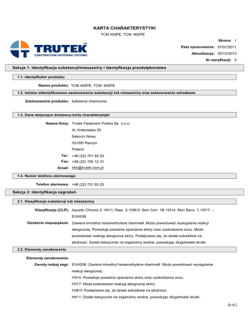 KARTA CHARAKTERYSTYKI TCM 400PE, TCM 600PE Strona: 1 Data opracowania: 07/01/2011 Aktualizacja: 02/12/2013 Nr weryfikacji: 5 Sekcja 1: Identyfikacja substancji/mieszaniny i identyfikacja przedsiębiorstwa 1.1. Identyfikator produktu Nazwa produktu: TCM 400PE, TCM 600PE 1.2. Istotne zidentyfikowane zastosowania substancji lub mieszaniny oraz zastosowania odradzane Zastosowanie produktu: kotwienie chemiczne 1.3. Dane dotyczące dostawcy karty charakterystyki Nazwa firmy: Trutek Fasteners Polska Sp z.o.o. Al. Krakowska 55 Sekocin Nowy 05-090 Raszyn Poland Tel.: +48 (22) 701 93 25 Fax: +48 (22) 100 12 31 Email: [email protected] 1.4. Numer telefonu alarmowego Telefon alarmowy: +48 (22) 701 93 25 Sekcja 2: Identyfikacja zagrożeń 2.1. Klasyfikacja substancji lub mieszaniny Klasyfikacja (CLP): Aquatic Chronic 2: H411; Repr. 2: H361f; Skin Corr. 1B: H314; Skin Sens. 1: H317; -: EUH208 Działania niepożądane: Zawiera trimethyl hexamethylene diamine#. Może powodować wystąpienie reakcji alergicznej. Powoduje poważne oparzenia skóry oraz uszkodzenia oczu. Może powodować reakcję alergiczną skóry. Podejrzewa się, że działa szkodliwie na płodnosć. Działa toksycznie na organizmy wodne, powodując długotrwałe skutki. 2.2. Elementy oznakowania Elementy oznakowania: Zwroty rodzaj zagr: EUH208: Zawiera trimethyl hexamethylene diamine#. Może powodować wystąpienie reakcji alergicznej. H314: Powoduje poważne oparzenia skóry oraz uszkodzenia oczu. H317: Może powodować reakcję alergiczną skóry. H361f: Podejrzewa się, że działa szkodliwie na płodnosć. H411: Działa toksycznie na organizmy wodne, powodując długotrwałe skutki. [c.d.] KARTA CHARAKTERYSTYKI TCM 400PE, TCM 600PE Strona: 2 Hasła ostrzegawcze: Niebezpieczeństwo Piktogramy: GHS05: Działanie żrące GHS07: Wykrzyknik GHS08: Zagrożenie dla zdrowia GHS09: Środowiskowy Zwroty środki ostr: P202: Nie używać przed zapoznaniem się i zrozumieniem wszystkich srodków bezpieczenstwa. P273: Unikać uwolnienia do srodowiska. P280: Stosować rękawice ochronne/odzież ochronną/ochronę oczu/ochronę twarzy. P302+352: W PRZYPADKU KONTAKTU ZE SKÓRĄ: Umyć dużą ilością wody/mydła. P305+351+338: W PRZYPADKU DOSTANIA SIĘ DO OCZU: Ostrożnie płukać wodą przez kilka minut. Wyjąć soczewki kontaktowe, jeżeli są i można je łatwo usunąć. Nadal płukać. P308+313: W przypadku narażenia lub stycznosci: Zasięgnąć się pod opiekę lekarza. 2.3. Inne zagrożenia Inne zagrożenia: Nie dotyczy. PBT: Substancji nie oznaczono jako substancji trwałej, ulegającej bioakumulacji i toksycznej (tzw. substancja PBT/vPvB). Sekcja 3: Skład/informacja o składnikach 3.2. Mieszaniny Składniki niebezpieczne: BISPHENOL A-(EPICHLORHYDRIN) {REACTION PRODUCT} EINECS 500-033-5 CAS 25068-38-6 PBT / WEL - Klasyfikacja (CLP) Eye Irrit. 2: H319; Skin Irrit. 2: H315; Skin Sens. 1: H317; Aquatic Chronic 2: H411 Procento wa 20-30% FORMALDEHYDE, OLIGOMERIC REACTION PRODUCTS WITH 1-CHLORO-2,3-EPOXYPROPANE AND PHENOL 500-006-8 9003-36-5 - Aquatic Chronic 2: H411; Skin Irrit. 2: H315; Skin Sens. 1: H317 10-20% [c.d.] KARTA CHARAKTERYSTYKI TCM 400PE, TCM 600PE Strona: 3 4-TERT-BUTYLPHENOL# 202-679-0 98-54-4 - Eye Dam. 1: H318; Repr. 2: H361f; Aquatic Chronic 1: H410; Skin Irrit. 2: H315 3-10% - Aquatic Chronic 3: H412; Eye Irrit. 2: H319; Skin Irrit. 2: H315; Skin Sens. 1: H317 3-10% - Acute Tox. 4: H312; Acute Tox. 4: H302; Skin Corr. 1B: H314; Skin Sens. 1: H317; Aquatic Chronic 3: H412 3-10% - Skin Corr. 1B: H314; Acute Tox. 4: H302; Acute Tox. 4: H332; Skin Sens. 1: H317; Aquatic Chronic 3: H412 1-3% Acute Tox. 4: H302; Aquatic Chronic 3: H412; Skin Corr. 1A: H314; Skin Sens. 1: H317 <1% 1,6-HEXANDIOLDIGLYCIDYLETHER 240-260-4 16096-31-4 2-PIPERAZIN-1-YLETHYLAMINE 205-411-0 140-31-8 1,3-BENZENEDIMETHANAMINE# 216-032-5 1477-55-0 TRIMETHYL HEXAMETHYLENE DIAMINE# 247-063-2 25513-64-8 - Sekcja 4: Środki pierwszej pomocy 4.1. Opis środków pierwszej pomocy Kontakt ze skórą Natychmiast zmyć dużą ilością wody z mydłem. Zdjąć natychmiast zanieczyszczoną odzież i obuwie, chyba że są przyklejone do skóry. Skonsultować się z lekarzem. Zanieczyszczenie oka Płukać oko pod bieżącą wodą przez 15 minut. Skonsultować się z lekarzem. Spożycie: Jeśli poszkodowany jest przytomny, to należy mu podać natychmiast pół litra wody do wypicia. Nie należy wywoływać wymiotów. Skonsultować się z lekarzem. Wdychanie: Przenieść na świeże powietrze w przypadku wdychania oparów. Jeśli poszkodowany jest nieprzytomny, ale oddycha prawidłowo, to należy ułożyć go w pozycji umożliwiającej powrót do normalnego stanu. Skonsultować się z lekarzem. 4.2. Najważniejsze ostre i opóźnione objawy oraz skutki narażenia Kontakt ze skórą W miejscu zetknięcia może wystąpić podrażnienie i zaczerwienienie. Zanieczyszczenie oka Powoduje oparzenia. Spożycie: Brak danych. Wdychanie: Może wystąpić podrażnienie gardła z odczuciem ucisku w klatce piersiowej. Działanie opóźnione: Brak danych. 4.3. Wskazania dotyczące wszelkiej natychmiastowej pomocy lekarskiej i szczególnego postępowania z poszkodowanym Postęp. natychmiast./szczególne: Niniejszą kartę charakterystyki substancji należy pokazać lekarzowi udzielającemu pomocy. [c.d.] KARTA CHARAKTERYSTYKI TCM 400PE, TCM 600PE Strona: 4 Sekcja 5: Postępowanie w przypadku pożaru 5.1. Środki gaśnicze Środki gaśnicze: Proszek gaśniczy. Dwutlenek węgla. Piany. 5.2. Szczególne zagrożenia związane z substancją lub mieszaniną Zagroż. w przyp. naraż.: Zamkniete, pojemniki pod wplywem wysokiej temperatury moga wybuchnac ze wzgledu na cisnienie. Podczas spalania wydziela toksyczne dymy. 5.3. Informacje dla straży pożarnej Informacje dla straży pożarnej: Zastosować niezależny aparat oddechowy. Sekcja 6: Postępowanie w przypadku niezamierzonego uwolnienia do środowiska 6.1. Indywidualne środki ostrożności, wyposażenie ochronne i procedury w sytuacjach a