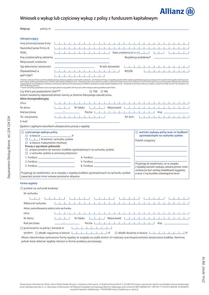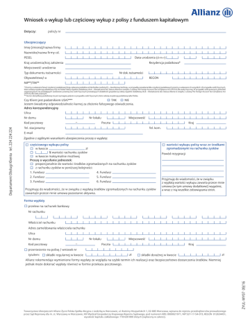 Wniosek o wykup lub częściowy wykup z polisy z funduszem kapitałowym Dotyczy: polis/y nr Ubezpieczający Imię (imiona)/nazwa firmy Nazwisko/nazwa firmy cd. PESEL Data urodzenia (d-m-r) Kraj urodzenia/kraj założenia Rezydencja podatkowa* Miejscowość urodzenia Nr dok. tożsamości Typ dokumentu tożsamości Obywatelstwo/-a REGON NIP**/TIN** * Prosimy o wskazanie Pana/i rezydencji podatkowej (kraju opłacania podatków od dochodów osobistych) – dwuliterowy kod kraju, w przypadku posiadania kilku rezydencji podatkowych prosimy o wskazanie ich wszystkich. W przypadku osób fizycznych, które wskażą rezydencję podatkową inną niż Polska należy wypełnić dodatkowy druk – Oświadczenie dot. Statusu klienta w związku z ustawą The Foreign Account Tax Compliance Act (FATCA) dla osoby fizycznej. W przypadku osób prawnych, jednostek organizacyjnych nie posiadających osobowości prawnej oraz osób fizycznych prowadzących działalność gospodarczą należy wypełnić dodatkowy druk – Oświadczenie dot. Statusu klienta w związku z ustawą The Foreign Account Tax Compliance Act (FATCA) dla osób prawnych. ** Numer identyfikacji podatkowej nie jest wymagany jedynie w przypadku osób fizycznych, które wskażą rezydencję podatkową tylko Polska. ☐ TAK ☐ NIE Czy Klient jest podatnikiem USA?*** Jestem świadomy odpowiedzialności karnej za złożenie fałszywego oświadczenia. Adres korespondencyjny Ulica Nr domu Nr lokalu – Miejscowość Poczta Kraj Tel. stacjonarny Tel. kom. E-mail Zgodnie z ogólnymi warunkami ubezpieczenia proszę o wypłatę: częściowego wykupu polisy w kwocie zł % wartości rachunku zysków w kwocie maksymalnie możliwej Proszę o wycofanie jednostek: proporcjonalnie do wartości środków zgromadzonych na rachunku zysków z rachunku zysków w poniższej kolejności: 1. Fundusz 4. Fundusz 2. Fundusz 5. Fundusz 3. Fundusz 6. Fundusz wartości wykupu polisy wraz ze środkami zgromadzonymi na rachunku zysków Powód rezygnacji Przyjmuję do wiadomości, że w związku z wypłatą środków zgromadzonych na rachunku zysków zawarta/e przeze mnie umowa pozostanie aktywna. Przyjmuję do wiadomości, że w związku z wypłatą wartości wykupu zawarta przeze mnie umowa (w tym umowy dodatkowe) wygaśnie, a wraz z nią wszelkie zobowiązania stron. Forma wypłaty przelew na rachunek bankowy Nr rachunku Właściciel rachunku Adres zameldowania właściciela rachunku Ulica Nr domu Nr lokalu Kod pocztowy – Miejscowość Poczta Kraj przeniesienie na polisę / wniosek nr tytułem: składki regularnej w kwocie zł składki doraźnej w kwocie zł Allianz rekomenduje wymienione formy wypłaty ze względu na szybki termin ich realizacji oraz bezpieczeństwo dostarczenia środków. Niemniej jednak może dokonać wypłaty również w formie przekazu pocztowego. ZYUL-WY07 09/16 Departament Obsługi Klienta tel. 224 224 224 Kod pocztowy Towarzystwo Ubezpieczeń Allianz Życie Polska Spółka Akcyjna z siedzibą w Warszawie, ul. Rodziny Hiszpańskich 1, 02-685 Warszawa, wpisana do rejestru przedsiębiorców prowadzonego przez Sąd Rejonowy dla m. st. Warszawy w Warszawie, XIII Wydział Gospodarczy Krajowego Rejestru Sądowego, pod numerem KRS: 0000021971, NIP 527-17-54-073, REGON 012634451, wysokość kapitału zakładowego: 118 630 000 złotych (wpłacony w całości). Zgoda marketingowa: ☐ Wyrażam zgodę na wszystkie poniżej wskazane cele przetwarzania danych (ma Pani/Pan prawo wyboru pomiędzy wyrażeniem zgody na wszystkie wskazane poniżej cele przetwarzania danych lub tylko niektóre ze wskazanych): W przypadku wyrażenia przez Panią/Pana poniższej zgody na przetwarzanie danych Pani/Pana dane (za wyjątkiem danych o stanie zdrowia i nałogach) oraz dane pozyskane w przyszłości będą przetwarzane przez Towarzystwo Ubezpieczeń Allianz Życie Polska S.A. (Administratora) ☐ a także, za Pani/Pana zgodą, udostępniane następującym podmiotom: Towarzystwo Ubezpieczeń i Reasekuracji Allianz Polska S.A., Powszechnemu Towarzystwu Emerytalnemu Allianz Polska S.A oraz funduszom przez niego zarządzanym, Towarzystwu Funduszy Inwestycyjnych Allianz Polska S.A., Allianz Polska Services sp. z o.o. (adres siedziby ww. podmiotów: ul. Rodziny Hiszpańskich 1, 02-685 Warszawa), w następujących celach: ☐ marketingu produktów lub usług ☐ profilowania na potrzeby przygotowania zindywidualizowanej oferty przesyłania informacji handlowych za pomocą następujących środków komunikacji elektronicznej: ☐ e-mail ☐ telefon oraz automatyczne systemy wywołujące ☐ sms Data Ma Pani/Pan prawo dostępu do treści swoich danych, ich poprawiania, prawo żądania zaprzestania, ograniczenia przetwarzania danych oraz usunięcia danych, cofnięcia zgody na przetwarzanie, jak również sprzeciwu, które to uprawnienia przysługują w stosunku do każdego z wyżej wymienionych podmiotów. Cofnięcie zgody może nastąpić w każdym momencie, jednak pozostaje bez wpływu na zgodność z prawem przetwarzania, którego dokonano na podstawie zgody przed jej cofnięciem. W przypadku naruszenia przepisów o ochronie danych osobowych przysługuje prawo wniesienia skargi do Generalnego Inspektora Ochrony Danych Osobowych. Komunikacja za pomocą poczty elektronicznej: ☐ Wyrażam zgodę na wszystkie poniższe: Wyrażam zgodę na przekazywanie mi przez Towarzystwo Ubezpieczeń Allianz Życie Polska S.A. na podany przeze mnie adres e-mail, w zakresie w jakim ma to zastosowanie do danej umowy ubezpieczenia, informacji, o których mowa w art. 20 ust. 2-4 ustawy o działalności ubezpieczeniowej i reasekuracyjnej, tj: ☐ informacji o propozycji zmian warunków umowy lub prawa właściwego dla umowy ☐ corocznych informacji o wysokości świadczeń przysługujących z tytułu umowy ubezpieczenia, corocznych informacji o wartości wykupu ubezpieczenia oraz o zmianach w zakresie sumy ubezpieczenia ☐ corocznych informacji o wartości premii Miejscowość Podpis Ubezpieczającego z