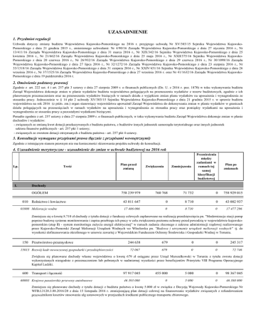 UZASADNIENIE 1. Przedmiot regulacji Uchwała dotyczy zmiany budżetu Województwa Kujawsko-Pomorskiego na 2016 r. przyjętego uchwałą Nr XV/303/15 Sejmiku Województwa KujawskoPomorskiego z dnia 21 grudnia 2015 r., zmienionego uchwałami: Nr 4/90/16 Zarządu Województwa Kujawsko-Pomorskiego z dnia 27 stycznia 2016 r., Nr 13/411/16 Zarządu Województwa Kujawsko-Pomorskiego z dnia 31 marca 2016 r., Nr XIX/342/16 Sejmiku Województwa Kujawsko-Pomorskiego z dnia 25 kwietnia 2016 r., Nr 21/662/16 Zarządu Województwa Kujawsko-Pomorskiego z dnia 25 maja 2016 r., Nr XXII/375/16 Sejmiku Województwa KujawskoPomorskiego z dnia 20 czerwca 2016 r., Nr 26/932/16 Zarządu Województwa Kujawsko-Pomorskiego z dnia 29 czerwca 2016 r., Nr 30/1098/16 Zarządu Województwa Kujawsko-Pomorskiego z dnia 27 lipca 2016 r., Nr 32/1272/16 Zarządu Województwa Kujawsko-Pomorskiego z dnia 23 sierpnia 2016 r., Nr 33/1318/16 Zarządu Województwa Kujawsko-Pomorskiego z dnia 31 sierpnia 2016 r., Nr XXIV/431/16 Sejmiku Województwa Kujawsko-Pomorskiego z dnia 26 września 2016 r., Nr 37/1525/16 Zarządu Województwa Kujawsko-Pomorskiego z dnia 27 września 2016 r. oraz Nr 41/1632/16 Zarządu Województwa KujawskoPomorskiego z dnia 19 października 2016 r. 2. Omówienie podstawy prawnej Zgodnie z art. 222 ust. 4 i art. 257 pkt 3 ustawy z dnia 27 sierpnia 2009 r. o finansach publicznych (Dz. U. z 2016 r. poz. 1870) w toku wykonywania budżetu Zarząd Województwa dokonuje zmian w planie wydatków budżetu województwa polegających na przenoszeniu wydatków z rezerw budżetowych, zgodnie z ich planowanym przeznaczeniem oraz na przenoszeniu wydatków bieżących w ramach działu z wyjątkiem zmian planu wydatków na uposażenia i wynagrodzenia ze stosunku pracy. Jednocześnie w § 14 pkt 2 uchwały XV/303/15 Sejmiku Województwa Kujawsko-Pomorskiego z dnia 21 grudnia 2015 r. w sprawie budżetu województwa na rok 2016 (z późn. zm.) organ stanowiący województwa upoważnił Zarząd Województwa do dokonywania zmian w planie wydatków w granicach działu polegających na przesunięciach w ramach wydatków na uposażenia i wynagrodzenia ze stosunku pracy oraz pomiędzy wydatkami na uposażenia i wynagrodzenia ze stosunku pracy a pozostałymi wydatkami bieżącymi. Ponadto zgodnie z art. 257 ustawy z dnia 27 sierpnia 2009 r. o finansach publicznych, w toku wykonywania budżetu Zarząd Województwa dokonuje zmian w planie dochodów i wydatków: - związanych ze zmianą kwot dotacji przekazywanych z budżetu państwa, z budżetów innych jednostek samorządu terytorialnego oraz innych jednostek sektora finansów publicznych - art. 257 pkt 1 ustawy; - związanych ze zwrotem dotacji otrzymanych z budżetu państwa - art. 257 pkt 4 ustawy. 3. Konsultacje wymagane przepisami prawa (łącznie z przepisami wewnętrznymi) Zgodnie z istniejącym stanem prawnym nie ma konieczności skierowania projektu uchwały do konsultacji. 4. Uzasadnienie merytoryczne - uzasadnienie do zmian w uchwale budżetowej na 2016 rok Treść Lp. I. Plan przed zmianą Zwiększenia Przeniesienia między zadaniami w ramach tej samej klasyfikacji budżetowej Zmniejszenia Plan po zmianach Dochody OGÓŁEM 010 Rolnictwo i łowiectwo 01008 Melioracje wodne 758 239 979 760 768 71 732 0 758 929 015 43 011 647 0 8 710 0 43 002 937 17 486 006 0 8 710 0 17 477 296 Zmniejsza się o kwotę 8.710 zł dochody z tytułu dotacji z funduszy celowych zaplanowane na realizację przedsięwzięcia pn. "Modernizacja stacji pomp poprzez budowę systemu monitorowania i zapisu przebiegu ich pracy w celu zwiększenia poziomu ochrony przed powodzią w województwie kujawskopomorskim (etap II) - system monitoringu zużycia energii elektrycznej" w ramach zadania zleconego z zakresu administracji rządowej realizowanego przez Kujawsko-Pomorski Zarząd Melioracji Urządzeń Wodnych we Włocławku pn. "Budowa i utrzymanie urządzeń melioracji wodnych" tj. do wysokości dofinansowania określonego w umowie zawartej z Wojewódzkim Funduszem Ochrony Środowiska i Gospodarki Wodnej w Toruniu. 150 Przetwórstwo przemysłowe 15013 Rozwój kadr nowoczesnej gospodarki i przedsiębiorczości 244 638 679 0 0 245 317 72 067 679 0 0 72 746 Zwiększa się planowane dochody własne województwa o kwotę 679 zł osiągane przez Urząd Marszałkowski w Toruniu z tytułu zwrotu dotacji wykorzystanych niezgodnie z przeznaczeniem lub pobranych w nadmiernej wysokości przez beneficjentów Priorytetu VIII Programu Operacyjnego Kapitał Ludzki. 600 Transport i łączność 60003 Krajowe pasażerskie przewozy autobusowe 97 917 045 455 000 5 000 0 98 367 045 46 393 000 0 5 000 0 46 388 000 Zmniejsza się planowane dochody z tytułu dotacji z budżetu państwa o kwotę 5.000 zł w związku z Decyzją Wojewody Kujawsko-Pomorskiego Nr WFB.I.3120.3.88.2016/20 z dnia 15 listopada 2016 r. zmniejszającą plan dotacji celowej na finansowanie wydatków związanych z refundowaniem przewoźnikom kosztów stosowania ulg ustawowych w przejazdach środkami publicznego transportu zbiorowego. Przeniesienia między zadaniami w Plan przed Plan po Treść Lp. Zwiększenia Zmniejszenia ramach tej zmianą zmianach samej klasyfikacji budżetowej 60013 Drogi publiczne wojewódzkie 20 612 614 450 000 0 0 21 062 614 Zwiększa się planowane dochody z tytułu dotacji od jednostek samorządu terytorialnego o kwotę 450.000 zł w związku z przyznaniem pomocy finansowej przez Gminę Sicienko na dofinansowanie inwestycji pn. "Rozbudowa drogi wojewódzkiej nr 244 Kamieniec - Strzelce Dolne poprzez budowę ścieżki rowerowej Wojnowo-Mochle, gmina Sicienko". 60095 Pozostała działalność 74 500 5 000 0 0 79 500 Zwiększa się planowane dochody z tytułu dotacji celowych z budżetu państwa o kwotę 5.000 zł w związku z Decyzją Wojewody KujawskoPomorskiego Nr WFB.I.3120.3.88.2016/20 z dnia 15 listopada 2016 r. o zwiększeniu planu dotacji na sfinansowanie kosztów wydawania kierowcom pojazdów przewożących towary niebezpieczne z