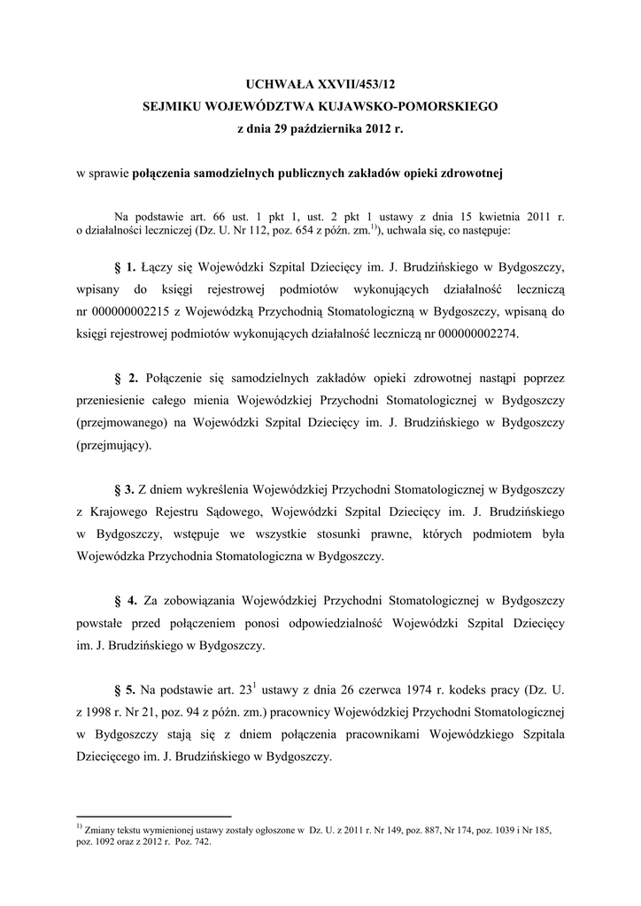 UCHWAŁA XXVII/453/12 SEJMIKU WOJEWÓDZTWA KUJAWSKO-POMORSKIEGO z dnia 29 października 2012 r. w sprawie połączenia samodzielnych publicznych zakładów opieki zdrowotnej Na podstawie art. 66 ust. 1 pkt 1, ust. 2 pkt 1 ustawy z dnia 15 kwietnia 2011 r. o działalności leczniczej (Dz. U. Nr 112, poz. 654 z późn. zm.1)), uchwala się, co następuje: § 1. Łączy się Wojewódzki Szpital Dziecięcy im. J. Brudzińskiego w Bydgoszczy, wpisany do księgi rejestrowej podmiotów wykonujących działalność leczniczą nr 000000002215 z Wojewódzką Przychodnią Stomatologiczną w Bydgoszczy, wpisaną do księgi rejestrowej podmiotów wykonujących działalność leczniczą nr 000000002274. § 2. Połączenie się samodzielnych zakładów opieki zdrowotnej nastąpi poprzez przeniesienie całego mienia Wojewódzkiej Przychodni Stomatologicznej w Bydgoszczy (przejmowanego) na Wojewódzki Szpital Dziecięcy im. J. Brudzińskiego w Bydgoszczy (przejmujący). § 3. Z dniem wykreślenia Wojewódzkiej Przychodni Stomatologicznej w Bydgoszczy z Krajowego Rejestru Sądowego, Wojewódzki Szpital Dziecięcy im. J. Brudzińskiego w Bydgoszczy, wstępuje we wszystkie stosunki prawne, których podmiotem była Wojewódzka Przychodnia Stomatologiczna w Bydgoszczy. § 4. Za zobowiązania Wojewódzkiej Przychodni Stomatologicznej w Bydgoszczy powstałe przed połączeniem ponosi odpowiedzialność Wojewódzki Szpital Dziecięcy im. J. Brudzińskiego w Bydgoszczy. § 5. Na podstawie art. 231 ustawy z dnia 26 czerwca 1974 r. kodeks pracy (Dz. U. z 1998 r. Nr 21, poz. 94 z późn. zm.) pracownicy Wojewódzkiej Przychodni Stomatologicznej w Bydgoszczy stają się z dniem połączenia pracownikami Wojewódzkiego Szpitala Dziecięcego im. J. Brudzińskiego w Bydgoszczy. 1) Zmiany tekstu wymienionej ustawy zostały ogłoszone w Dz. U. z 2011 r. Nr 149, poz. 887, Nr 174, poz. 1039 i Nr 185, poz. 1092 oraz z 2012 r. Poz. 742. § 6. Nie dalej niŜ po upływie dwunastu miesięcy od dnia wejścia w Ŝycie uchwały w sprawie połączenia samodzielnych publicznych zakładów opieki zdrowotnej, Dyrektor Wojewódzkiego Szpitala Dziecięcego im. J. Brudzińskiego w Bydgoszczy dopełni obowiązków określonych w art. 67 ust. 1 pkt 1 ustawy o działalności leczniczej (Dz. U. Nr 112, poz. 654 z późn. zm.). § 7. Wykonanie uchwały powierza się Dyrektorowi Wojewódzkiego Szpitala Dziecięcego im. J. Brudzińskiego w Bydgoszczy. § 8. Nadzór nad wykonaniem uchwały powierza się Zarządowi Województwa Kujawsko-Pomorskiego. § 9. Uchwała wchodzi w Ŝycie po upływie 14 dni od dnia ogłoszenia w Dzienniku Urzędowym Województwa Kujawsko-Pomorskiego. UZASADNIENIE 1. Przedmiot regulacji: Niniejszą uchwałą łączy się Wojewódzki Szpital Dziecięcy im. J. Brudzińskiego w Bydgoszczy z Wojewódzką Przychodnią Stomatologiczną w Bydgoszczy. 2. Omówienie podstawy prawnej: Stosownie do art. 66 ust. 1 pkt 1 ustawy z dnia 15 kwietnia 2011 r. o działalności leczniczej (Dz. U. Nr 112, poz. 654 z późn. zm.) połączenie samodzielnych publicznych zakładów opieki zdrowotnej moŜe nastąpić przez: - przeniesienie całego mienia co najmniej jednego samodzielnego publicznego zakładu opieki zdrowotnej (przejmowanego) na inny samodzielny publiczny zakład opieki zdrowotnej (przejmujący) - połączenie następuje w drodze rozporządzenia, zarządzenia albo uchwały, w przypadku zakładów mających ten sam podmiot tworzący, - połączenie następuje bez przeprowadzenia postępowania likwidacyjnego podmiotu przejmowanego albo łączących się podmiotów. Zgodnie z art. 66 ust. 7 ustawy o działalności leczniczej połączenie wiąŜe się z przejęciem pracowników zakładów łączących się na zasadzie art. 231 Kodeksu pracy. 3. Konsultacje wymagane przepisami prawa (łącznie z przepisami wewnętrznymi): Na mocy art. 19 ustawy z dnia 23 maja 1991 r. o związkach zawodowych (Dz. U. z 2001 r. Nr 79, poz. 854 z późn. zm.) projekt uchwały został przekazany do zaopiniowania drogą pocztową, jak i elektroniczną: NiezaleŜnemu Samorządnemu Związkowi Zawodowemu „Solidarność”, Ogólnopolskiemu Porozumieniu Związków Zawodowych i Forum Związków Zawodowych. Do 19 września 2012 r., do tut. Urzędu wpłynęły opinie: - NiezaleŜnego Samorządnego Związku Zawodowego „Solidarność” – pismo z dnia 17 września 2012 r., nr 211/2012 – opinia pozytywna, - Ogólnopolskiego Porozumienia Związków Zawodowych – pismo z dnia 5 września 2012 r., nr 309/RW OPZZ/2012 – opinia pozytywna, - Forum Związków Zawodowych – pismo z dnia 17 września 2012 r., nr 17/09/2012 – opinia pozytywna. Ponadto, Rady Społeczne łączonych samodzielnych publicznych zakładów opieki zdrowotnej przedstawiły swoje opinie: - Wojewódzkiego Szpitala Dziecięcego im. J. Brudzińskiego w Bydgoszczy – uchwała Nr 14/2012 z dnia 10 września 2012 r. Rady Społecznej przy Wojewódzkim Szpitalu Dziecięcym w Bydgoszczy – opinia pozytywna, - Wojewódzkiej Przychodni Stomatologicznej w Bydgoszczy – uchwała Nr III/5/2012 z dnia 19 września 2012 r. Rady Społecznej Wojewódzkiej Przychodni Stomatologicznej w Bydgoszczy – opinia pozytywna. 4. Uzasadnienie merytoryczne: W Wojewódzkim Szpitalu Dziecięcym w Bydgoszczy aktualnie leczy się rocznie około 9 tys. dzieci i młodzieŜy, a po rozbudowie szacuje się, Ŝe liczba ta wzrośnie do 13-14 tys. W placówce leczeni są pacjenci z róŜnymi rodzajami schorzeń – najczęściej z chorobami przewlekłymi, zazwyczaj uwarunkowanymi genetycznie jak np. mukowiscydoza, fenyloketonuria, cukrzyca, wady serca, a takŜe schorzenia neurologiczne przebiegające z upośledzeniem umysłowym. Osoby te wymagają długotrwałej terapii w warunkach szpitalnych oraz troskliwej opieki medycznej Rozbudowa Wojewódzkiego Szpitala Dziecięcego w Bydgoszczy będzie się wiązać z dalszym rozwojem wysokospecjalistycznych usług medycznych, wśród których wymienić naleŜy m.in. chirurgię dziecięcą