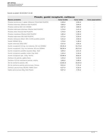 ART OFFICE http://www.dlabiurazakupy.pl [email protected] Cennik na dzień: 02-03-2017 21:34 Pinezki, gumki recepturki, zwilżacze Nazwa produktu Cena brutto Cena netto Cena poprzednia Pinezka techniczna 1 ząbek 100sztuk FOLIA E&D PLASTIC 2,46 zł 2,00 zł - Pinezka kolorowa 100sztuk E&D PLASTIC 3,69 zł 3,00 zł - Pinezka srebrna S50 (10) GRAND 4,67 zł 3,80 zł - Pinezka tablicowa kolorowa 20sztuk E&D PLASTIC 1,74 zł 1,41 zł - Pinezka złota 25sztuk E&D PLASTIC 1,70 zł 1,38 zł - Pinezka metalowa 50sztuk E&D PLASTIC 1,85 zł 1,50 zł - Pinezka tablicowa (40) E&D PLASTIC 2,71 zł 2,20 zł - Pinezki niklowane 50szt. APLI 12345 pudełko plastik 4,31 zł 3,50 zł - Szpilki GRAND 50 g. 1,70 zł 1,38 zł - Szpilki kolorowe 50szt.APLI 4,31 zł 3,50 zł - Gumki recepturki 0,5 kg, mix kolorów, 60 mm DONAU 19,35 zł 15,73 zł - Gumki recepturki 1 kg, mix kolorów, 60 mm DONAU 36,56 zł 29,72 zł - 3,09 zł 2,51 zł - Gumki recepturki pudełko wysokie 60gr. E&D Gumki recepturki pudełko niskie 15gr.E&D Gumki recepturki opk. 125g. Herlitz. Zwilżacz do palców, gąbka Noex Zwilżacz ICO do nawilżania palców, wodny 1,35 zł 1,10 zł - 10,98 zł 8,93 zł - 1,35 zł 1,10 zł - 3,06 zł 2,49 zł - 12,82 zł 10,42 zł - Żel do zwilżania palców glicerynowy, Donau. 9,53 zł 7,75 zł - Zwilżacz glicerynowy ŻELIKO, NOEX 25ml 6,27 zł 5,10 zł - Gąbka glicerynowa 40g, E&D Plastic 9,47 zł 7,70 zł - Żel do zwilżania palców, BIC. 1/1 Powered by TCPDF (www.tcpdf.org)