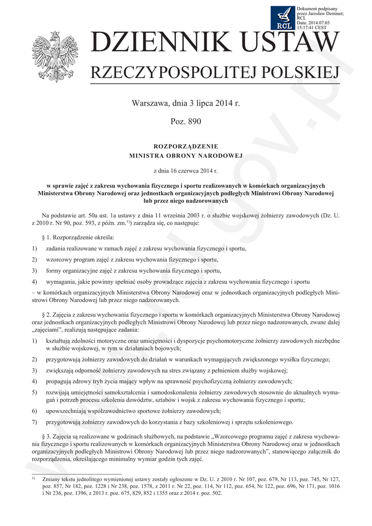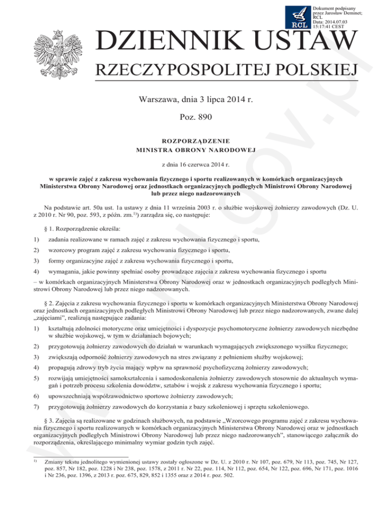 Dokument podpisany przez Jarosław Deminet; RCL Data: 2014.07.03 15:17:41 CEST DZIENNIK USTAW v.p l RZECZYPOSPOLITEJ POLSKIEJ Warszawa, dnia 3 lipca 2014 r. Poz. 890 ROZPORZĄDZENIE MINISTRA OBRONY NARODOWEJ .go z dnia 16 czerwca 2014 r. w sprawie zajęć z zakresu wychowania fizycznego i sportu realizowanych w komórkach organizacyjnych Ministerstwa Obrony Narodowej oraz jednostkach organizacyjnych podległych Ministrowi Obrony Narodowej lub przez niego nadzorowanych Na podstawie art. 50a ust. 1a ustawy z dnia 11 września 2003 r. o służbie wojskowej żołnierzy zawodowych (Dz. U. z 2010 r. Nr 90, poz. 593, z późn. zm.1)) zarządza się, co następuje: § 1. Rozporządzenie określa: zadania realizowane w ramach zajęć z zakresu wychowania fizycznego i sportu, 2) wzorcowy program zajęć z zakresu wychowania fizycznego i sportu, 3) 4) w. rcl 1) formy organizacyjne zajęć z zakresu wychowania fizycznego i sportu, wymagania, jakie powinny spełniać osoby prowadzące zajęcia z zakresu wychowania fizycznego i sportu – w komórkach organizacyjnych Ministerstwa Obrony Narodowej oraz w jednostkach organizacyjnych podległych Ministrowi Obrony Narodowej lub przez niego nadzorowanych. § 2. Zajęcia z zakresu wychowania fizycznego i sportu w komórkach organizacyjnych Ministerstwa Obrony Narodowej oraz jednostkach organizacyjnych podległych Ministrowi Obrony Narodowej lub przez niego nadzorowanych, zwane dalej „zajęciami”, realizują następujące zadania: 1) 2) 3) 4) przygotowują żołnierzy zawodowych do działań w warunkach wymagających zwiększonego wysiłku fizycznego; zwiększają odporność żołnierzy zawodowych na stres związany z pełnieniem służby wojskowej; propagują zdrowy tryb życia mający wpływ na sprawność psychofizyczną żołnierzy zawodowych; rozwijają umiejętności samokształcenia i samodoskonalenia żołnierzy zawodowych stosownie do aktualnych wymagań i potrzeb procesu szkolenia dowództw, sztabów i wojsk z zakresu wychowania fizycznego i sportu; ww 5) kształtują zdolności motoryczne oraz umiejętności i dyspozycje psychomotoryczne żołnierzy zawodowych niezbędne w służbie wojskowej, w tym w działaniach bojowych; 6) upowszechniają współzawodnictwo sportowe żołnierzy zawodowych; 7) przygotowują żołnierzy zawodowych do korzystania z bazy szkoleniowej i sprzętu szkoleniowego. § 3. Zajęcia są realizowane w godzinach służbowych, na podstawie „Wzorcowego programu zajęć z zakresu wychowania fizycznego i sportu realizowanych w komórkach organizacyjnych Ministerstwa Obrony Narodowej oraz w jednostkach organizacyjnych podległych Ministrowi Obrony Narodowej lub przez niego nadzorowanych”, stanowiącego załącznik do rozporządzenia, określającego minimalny wymiar godzin tych zajęć. 1) Zmiany tekstu jednolitego wymienionej ustawy zostały ogłoszone w Dz. U. z 2010 r. Nr 107, poz. 679, Nr 113, poz. 745, Nr 127, poz. 857, Nr 182, poz. 1228 i Nr 238, poz. 1578, z 2011 r. Nr 22, poz. 114, Nr 112, poz. 654, Nr 122, poz. 696, Nr 171, poz. 1016 i Nr 236, poz. 1396, z 2013 r. poz. 675, 829, 852 i 1355 oraz z 2014 r. poz. 502. Dziennik Ustaw –2– Poz. 890 § 5. 1. Zajęcia są prowadzone przez: 1) v.p l § 4. Zajęcia są realizowane jako zajęcia praktyczne i zajęcia teoretyczne. żołnierza zawodowego lub pracownika wojska zajmującego etatowe stanowisko służbowe związane z wykonywaniem zadań z zakresu wychowania fizycznego i sportu, który posiada przygotowanie pedagogiczne oraz: a) tytuł zawodowy magistra lub równorzędny w zakresie wychowania fizycznego lub b) ukończył studia podyplomowe z zakresu wychowania fizycznego i sportu; 2) dowódcę pododdziału lub żołnierza zawodowego wyznaczonego przez dowódcę (dyrektora, komendanta, szefa) do prowadzenia zajęć w ramach powierzonych czynności wykraczających poza jego obowiązki służbowe, który: a) posiada tytuł, o którym mowa w pkt 1 lit. a, lub ukończył studia, o których mowa w pkt 1 lit. b, lub b) ukończył szkolenie specjalistyczne w wymiarze co najmniej 126 godzin, lub .go c) posiada świadectwo dojrzałości i jest trenerem lub instruktorem sportu w rozumieniu przepisów ustawy z dnia 25 czerwca 2010 r. o sporcie (Dz. U. z 2014 r. poz. 715). 2. Żołnierze zawodowi, o których mowa w ust. 1 pkt 2, prowadzą zajęcia pod nadzorem merytorycznym osób, o których mowa w ust. 1 pkt 1. § 6. Szkolenie specjalistyczne realizują uczelnie wojskowe, ośrodki szkolenia oraz wytypowane jednostki wojskowe na podstawie programu zatwierdzonego przez szefa komórki organizacyjnej Ministerstwa Obrony Narodowej właściwej w sprawach wychowania fizycznego i sportu. § 7. Rozporządzenie wchodzi w życie po upływie 14 dni od dnia ogłoszenia. ww w. rcl Minister Obrony Narodowej: T. Siemoniak Dziennik Ustaw –3– Poz. 890 v.p l Załącznik do rozporządzenia Ministra Obrony Narodowej z dnia 16 czerwca 2014 r. (poz. 890) WZORCOWY PROGRAM zajęć z zakresu wychowania fizycznego i sportu realizowanych w komórkach organizacyjnych Ministerstwa Obrony Narodowej oraz jednostkach organizacyjnych podległych Ministrowi Obrony Narodowej lub przez niego nadzorowanych 1. Zajęcia teoretyczne obejmują podstawy wiedzy z zakresu wychowania fizycznego i sportu, w tym: obowiązujące normy sprawności fizycznej; 2) zasady zapobiegania urazom i wypadkom podczas zajęć; 3) metody oceny sprawności fizycznej; 4) zasady promocji zdrowia i zdrowego trybu życia; 5) testy sprawnościowe i ćwiczenia fizyczne. 2. Zajęcia praktyczne obejmują: .go 1) technikę pokonywania naturalnych i sztucznych przeszkód terenowych oraz skuteczne wykorzystywanie terenu w kształtowaniu podstawowych zdolności motorycznych; 2) elementy walki wręcz, łączenie ich z taktyką działania i strzelaniem oraz wykorzystywanie ich w walce; 3) technikę i taktykę sportowych gier zespołowych; 4) posługiwanie się sprzętem stosowanym w trakcie zajęć. w. rcl 1) 3. Zajęcia obejmują następujące