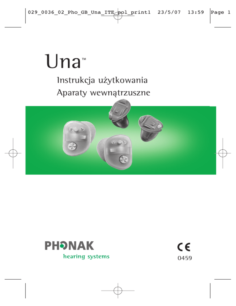 029_0036_02_Pho_GB_Una_ITE_pol_print1 23/5/07 13:59 Una ™ Instrukcja użytkowania Aparaty wewnątrzuszne 0459 Page 1 029_0036_02_Pho_GB_Una_ITE_pol_print1 23/5/07 13:59 Spis treści Wprowadzenie 3 Opis budowy aparatu 4 Przygotowanie aparatu do działania Wymiana baterii Wkładanie aparatu do ucha Wyjmowanie aparatu z ucha 6 6 10 12 Obsługa aparatu Włączanie / wyłączanie Regulacja głośności (dostępny jako opcja) Wybór programu słyszenia Cewka telefoniczna (dostępny jako opcja) EasyPhoneplus (dostępny jako opcja) 14 14 16 17 18 19 Ważne informacje Istotne wskazówki 22 22 Ostrzeżenia 24 Informacja o gwarancji 25 Page 2 029_0036_02_Pho_GB_Una_ITE_pol_print1 23/5/07 13:59 Wprowadzenie Twój nowy aparat słuchowy Una wyposażony jest w najnowszą, wysoko zaawansowaną technologię cyfrową. Aparat Una zapewnia najwyższą jakość dźwięku, komfort słyszenia w każdych warunkach słyszenia. Wykorzystanie nowoczesnej technologii sprawia, że skomplikowane technicznie aparaty słuchowe stają się urządzeniami łatwymi i wygodnymi w użyciu. Prosimy uważnie przeczytać niniejszą instrukcję, aby móc w pełni wykorzystać wszystkie funkcje nowego aparatu słuchowego Una. Aparat słuchowy Una jest najwyższej klasy produktem szwajcarskiej firmy Phonak – znanej na świecie z nowoczesnej technologii słuchowej, innowacji i rzetelności. Właściwe użytkowanie zgodnie z instrukcją i pielęgnacja aparatu Una zapewnią doskonałą jakość słyszenia i prawidłowe funkcjonowanie aparatu. Jeśli chcesz uzyskać dodatkowe informacje, skontaktuj się ze swoim protetykiem słuchu lub odwiedź stronę www.phonak.com; www.phonak.pl Phonak – Twój partner dla lepszego słyszenia! 3 Page 3 029_0036_02_Pho_GB_Una_ITE_pol_print1 Opis budowy aparatu Una CIC/MC Standardowa bateria typu 10 햴 햳 햲 햸 햶 햷 Una ITC / HS Standardowa bateria typu 312 햲 햷 햶 햳 햴 햵 4 23/5/07 13:59 Page 4 029_0036_02_Pho_GB_Una_ITE_pol_print1 23/5/07 13:59 Una FS Una FS Power Standardowa bateria typu 13 햶 햲 햷 햳 햴 햵 햲 햳 햴 햵 햶 햷 햸 Osłona wejścia mikrofonu (dwie osłony w modelach z technologią kierunkową) Kieszeń baterii z przełącznikiem włącz/wyłącz Przełącznik programów (dostępny jako opcja) Regulator głośności z przełącznikiem włącz/wyłącz (dostępny jako opcja) Wyjście dźwiękowe z filtrem Indywidualna obudowa Żyłka do wyjmowania (tylko w Una CIC) 5 Page 5 029_0036_02_Pho_GB_Una_ITE_pol_print1 23/5/07 13:59 Przygotowanie aparatu do działania Wymiana baterii 1) Zdejmij folię zabezpieczającą z nowej baterii. 2) Trzymaj aparat w pozycji pionowej tak, aby kieszeń baterii skierowana była ku górze i otwórz kieszeń baterii. 6 Page 6 029_0036_02_Pho_GB_Una_ITE_pol_print1 23/5/07 13:59 3) Wyjmij starą baterię. 4) Włóż nową baterię. Upewnij się, że znak „+” na płaskiej stronie baterii pokrywa się ze znakiem „+” na kieszeni baterii. 7 Page 7 029_0036_02_Pho_GB_Una_ITE_pol_print1 23/5/07 Przygotowanie aparatu do działania 5) Delikatnie zamykaj kieszeń baterii, aż poczujesz „kliknięcie”. 8 13:59 Page 8 029_0036_02_Pho_GB_Una_ITE_pol_print1 23/5/07 13:59 Wymiana baterii ! ! ! ! ! Należy bardzo ostrożnie postępować z kieszenią baterii, nie należy używać siły. Nie należy otwierać kieszeni baterii w sposób inny, niż pokazano na rysunku. Jeśli w trakcie wymiany baterii wystąpi opór przy zamykaniu kieszeni baterii, sprawdź czy bateria została prawidłowo włożona. W przeciwnym razie kieszeń baterii nie zamknie się. Jeśli aparat nie jest używany, pozostaw otwartą kieszeń baterii, aby wyparowała wilgoć. Na noc wyjmuj baterię. Zalecamy używanie baterii tylko tych proponowanych i sprzedawanych przez protetyka słuchu. Ostrzeżenie o zużyciu baterii Aparat Una wyposażony jest w dźwiękową sygnalizację stanu wyczerpywania się baterii. Po usłyszeniu sygnału pozostaje około 30 minut na wymianę baterii. Czas ten może być dłuższy dla baterii wysokiej jakości. Sygnał dźwiękowy w aparacie, informujący o stanie baterii, będzie powtarzał się co 30 minut. 9 Page 9 029_0036_02_Pho_GB_Una_ITE_pol_print1 23/5/07 13:59 Przygotowanie aparatu do działania Wkładanie aparatu Una do ucha Jeśli to możliwe, przed włożeniem aparatu do ucha ustaw funkcję „Wyciszenie” (patrz: str. 15). Funkcja „Wyciszenie” pozwala uniknąć usłyszenia nieprzyjemnych gwizdów. Protetyk słuchu może zaprogramować czas opóźnienia włączenia się aparatu. Funkcja ta opóźnia włączenie się aparatu o 9 lub 15 sekund po zamknięciu kieszeni baterii. Przed włożeniem aparatu upewnij się, że używasz odpowiedniego aparatu do lewego i prawego ucha. Stosowany jest następujący system oznakowania: kolor niebieski – lewy aparat kolor czerwony – prawy aparat 10 Page 10 029_0036_02_Pho_GB_Una_ITE_pol_print1 23/5/07 13:59 Chwyć aparat pomiędzy kciuk a palec wskazujący tej ręki, z której strony będzie wkładany aparat. Najpierw włóż aparat do kanału słuchowego, a następnie pchnij go do końca kanału. Pociągnij delikatnie za płatek ucha i ułóż aparat w prawidłowej pozycji. 11 Page 11 029_0036_02_Pho_GB_Una_ITE_pol_print1 23/5/07 13:59 Przygotowanie aparatu do działania Wyjmowanie aparatu z ucha Jeśli to możliwe, przed wyjęciem aparatu z ucha ustaw funkcję „Wyciszenia” (patrz: str.15). Funkcja ”Wyciszenia” pozwala uniknąć usłyszenia nieprzyjemnych gwizdów. • Aparat Una z żyłką do wyjmowania Chwyć żyłkę pomiędzy kciuk a palec wskazujący i pociągnij w górę aparat, wyjmując go z ucha. 12 Page 12 029_0036_02_Pho_GB_Una_ITE_pol_print1 23/5/07 13:59 • Aparat Una bez żyłki do wyjmowania Połóż kciuk z tyłu ucha, na płatku (poniżej twardej chrząstki) i delikatnie naciskaj na ucho, wypychając aparat słuchowy z kanału słuchowego. Aby aparat wysunął się sam z ucha, możesz poruszać żuchwą, wykonując ruchy żucia. Chwyć za wystający aparat