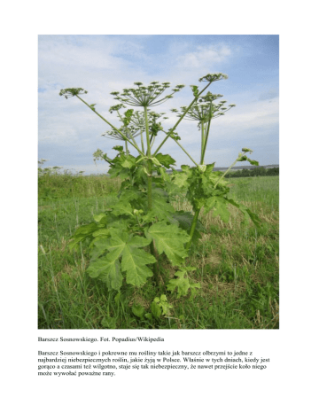 Barszcz Sosnowskiego. Fot. Popadius/Wikipedia Barszcz Sosnowskiego i pokrewne mu rośliny takie jak barszcz olbrzymi to jedne z najbardziej niebezpiecznych roślin, jakie żyją w Polsce. Właśnie w tych dniach, kiedy jest gorąco a czasami też wilgotno, staje się tak niebezpieczny, że nawet przejście koło niego może wywołać poważne rany. W tym tekście skupiamy się na barszczu Sosnowskiego, ale – jak mówi dr hab. Marcin Zych z Ogrodu Botanicznego Uniwersytetu Warszawskiego – w Polsce występuje co najmniej kilka spokrewnionych gatunków mających podobne właściwości. Co więcej podejrzewa się, że krzyżują się one ze sobą, więc hasło „barszcz Sosnowskiego” należy traktować nieco umownie. Jak działa barszcz Sosnowskiego? To jedna z najsilniej toksycznych roślin w Polsce. W jego soku występuje szereg związków, jednak tymi, które stwarzają poważne zagrożenie dla człowieka są furanokumaryny. Ich szczególną właściwością jest duża łatwość łączenia się z DNA. W kontakcie ze skórą łączą się z DNA komórek i powodują ich obumieranie. Ten proces zachodzi szczególnie szybko gdy na skórę działają promienie ultrafioletowe – takie, jak te pochodzące ze światła słonecznego. Pierwszym objawem, łatwym do zlekceważenia, jest zaczerwienienie i szczypanie. Potem pojawiają się na skórze bąble naciekające płynem surowiczym, a w ciężkich przypadkach mogą pojawić się głębokie i trudnogojące się rany. Furanokumaryny działają nawet po zagojeniu się oparzeń. Zmieniają działanie komórek skóry tak, że produkują one więcej melaniny. Powoduje to powstawanie na skórze ciemnych plam, które utrzymywać się mogą nawet przez kilka lat. Poparzenia wywołane kontaktem z barszczem Sosnowskiego. Fot. Ivo Kruusamägi Wiązanie się furanokumaryn z DNA może powodować działanie rakotwórcze i uszkadzające płód. Furanokumaryny działają nie tylko w bezpośrednim kontakcie ze skórą, ale – szczególnie w upalne i wilgotne dni – unoszą się w powietrzu i osadzają na wilgotnym podłożu takim jak ludzka skóra. Dlatego wystarczy przechodzić koło stanowiska barszczu Sosnowskiego by doznać oparzeń. Furanokumaryny mogą wywoływać również uszkodzenia dróg oddechowych i oczu oraz powodować ból i zawroty głowy. Jak rozpoznać barszcz Sosnowskiego? Przede wszystkim jest ogromny – dorasta do 4-5 metrów, u nasady jego łodyga może mieć średnicę 10-12 cm. Do takich rozmiarów barszcz Sosnowskiego dorasta w czasie jednego sezonu. Barszcz Sosnowskiego należy do rodziny baldaszkowatych albo inaczej selerowatych. To ta sama rodzina, w której jest m.in. marchew, pietruszka czy koper. I właśnie koper może nam ułatwić rozpoznanie barszczu Sosnowskiego. Wygląda on bowiem jak gigantyczny koper z charakterystycznymi kwiatami zebranymi w potężny baldach. Kwiaty barszczu Sosnowskiego. Fot. Hugo.arg Liście podzielone są pierzasto, co wyraźnie odróżnia barszcz Sosnowskiego od innych dużych roślin takich jak na przykład łopian. Mogą mieć średnicę 1,5 metra. Łodyga jest w środku pusta. Zdarzało się, że dzieci bawiły się używając jej jako lunety – to bardzo zły pomysł kończący się poważnymi oparzeniami rąk i twarzy. Liście barszczu Sosnowskiego. Fot. Krzysztof Ziarnek, Kenraiz Obecnie barszcz Sosnowskiego rośnie na wielu stanowiskach w całej Polsce. Szczególnie upodobał sobie południe, ale pojawia się praktycznie wszędzie, również w lasach. Co zrobić w razie poparzenia barszczem Sosnowskiego? Przede wszystkim, nawet w razie podejrzenia kontaktu z barszczem Sosnowskiego, trzeba zmyć skórę bardzo dużą ilością letniej wody z mydłem. Koniecznie unikać słońca przez nie mniej niż 48 godzin. To bardzo ważne, bo promieniowanie słoneczne przyspiesza i intensyfikuje proces łączenia się furanokumaryn z ludzkim DNA. Jeśli pojawią się objawy oparzeń trzeba niezwłocznie iść do lekarza. Dotyczy to wszystkich, bo rany mogą być głębokie i źle się goić. Co więcej szczególnie zagrożone są dzieci i osoby cierpiące na przewlekłe choroby. U nich oparzenia barszczem Sosnowskiego mogą stać się nawet przyczyną śmierci – tak stało się niedawno w przypadku 67-letniej kobiety. Skąd wziął się w Polsce barszcz Sosnowskiego? Barszcz Sosnowskiego został sprowadzony ze Związku Radzieckiego na początku lat 50. Jego bardzo szybki wzrost i wysoka zawartość substancji odżywczych sprawiły, że radzieccy uczeni uznali go za doskonałą roślinę uprawną nadającą się na paszę i kiszonki dla bydła. Trudno dziś dojść do tego, dlaczego udało im się pominąć tak „drobny szczegół” jak fakt, że barszcz Sosnowskiego jest niezwykle niebezpieczny dla człowieka. Jedna z teorii głosi, że na swoich pierwotnych stanowiskach czyli nad strumieniami na Kaukazie barszcz Sosnowskiego nie miał aż tak niebezpiecznych właściwości. Tu przeczytasz o innym wyczynie radzieckich naukowców. Roślina doskonale nadaje się też dla pszczół, była więc sprowadzana do PGR-ów i rozsiewana na własną rękę. Niestety poza tym, że jest niebezpieczna ma również wszystkie cechy gatunku bardzo silnie inwazyjnego. Wypiera rodzime gatunki, błyskawiczni się rozsiewa, jest bardzo trudna do wyplenienia, tworzy trwałe banki nasion w glebie.